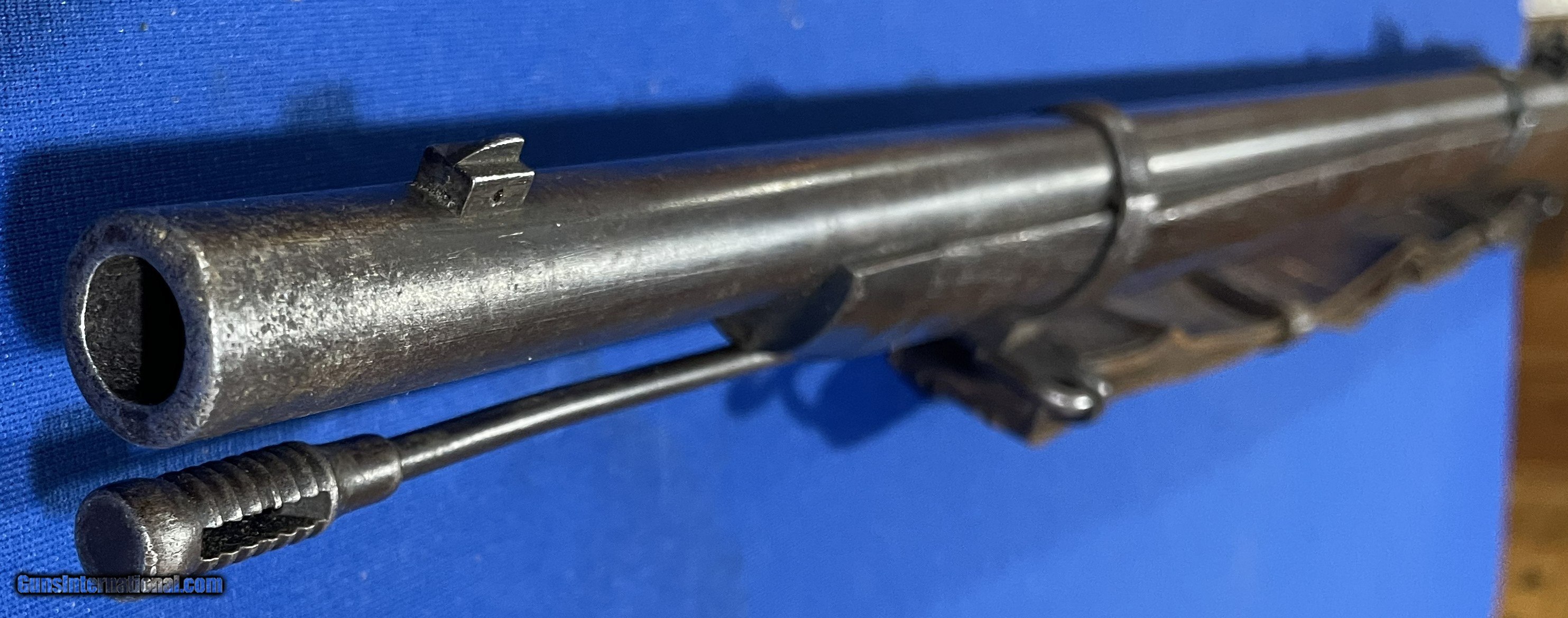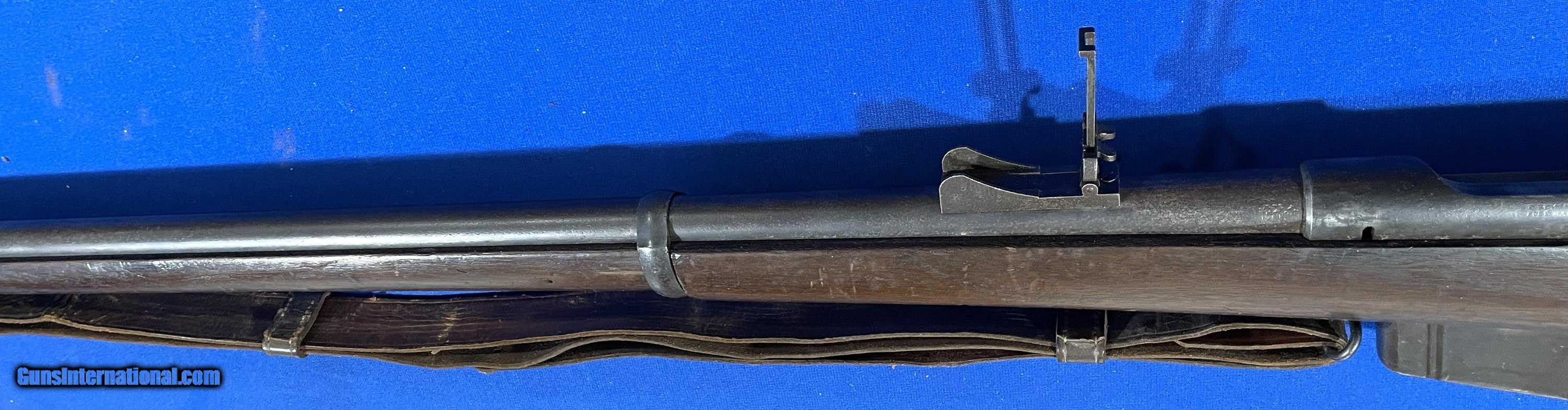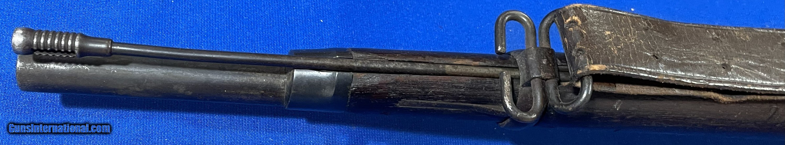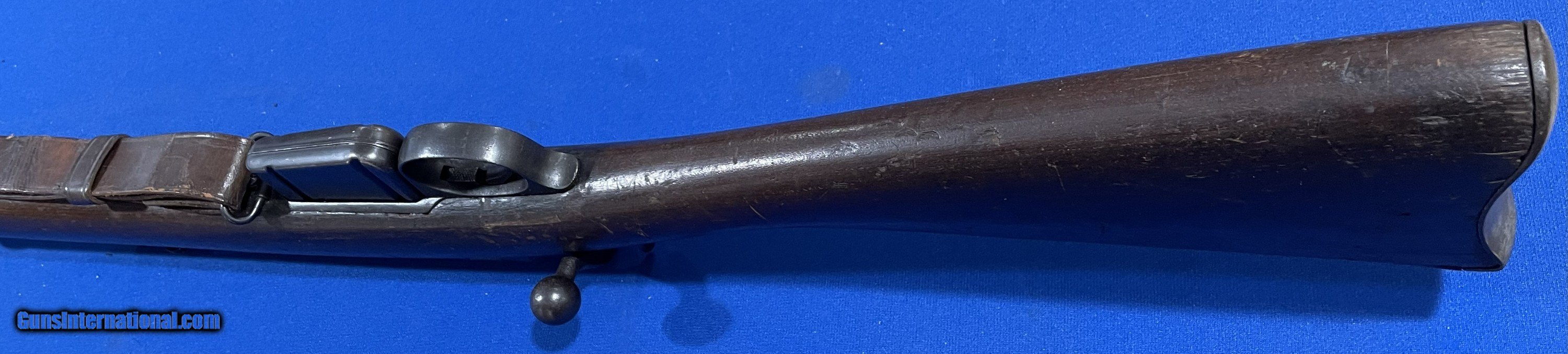 Description: REMINGTON LEE MAGAZINE NAVY RIFLE SER. #9535. METAL SURFACES MOSTLY A DEEP BROWN PATINA WITH SOME PEPPERING OF THE BOLT HANDLE, FORWARD OF THE FRAME REAR OF SIGHT AND MUZZLE (POSSIBLY FROM SALT AIR ABOARD A SHIP). BORE HAS DISTINCT RIFLING WITH PITTING CONCENTRATED AT THE END OF THE BORE. FACTORY MARKINGS AND ACCEPTANCE MARK D.C.F. WALNUT STOCK IN GOOD CONDITION, NO MAJOR ISSUES HAVING EXPECTED DINGS & MARS. ACTION APPEARS TO FUNCTION AS IT SHOULD. COMPLETE WITH PERIOD LEATHER SLING, AS PICTURED & RECENTLY FOUND IN COLLECTION. SEE LAST PICTURE OF AN OLD TAG THAT WAS ATTACHED TO IT. QUESTIONS JUST ASK ! SEE ALL ESTATE ANTIQUES LISTINGS FOR MORE SCARCE ITEMS. $60.00 S&H DIRECT TO YOU ANYWHERE IN THE U.S. THAT'S OK TO OWN. NO FFL LICENSE NEEDED. NO SALES TO NEW YORK STATE ! Antique: Yes Rifle Caliber: .45-70 Government Manufacturer: REMINGTON Model: 1879 Serial Number: 9535 Barrel Length: 32 Condition: VERY GOOD/GOOD Metal Condition: AGED Wood Condition: AS PICTURED Bore Condition: DISTINCT RIFLING Barrel Type: ROUND Action: WORKS GOOD Stock: WALMUT Butt Pad: U.S. MARKED Finish: AGED Sights: ORIGINAL Price: $2,500.00 Buy Now Contact Seller |