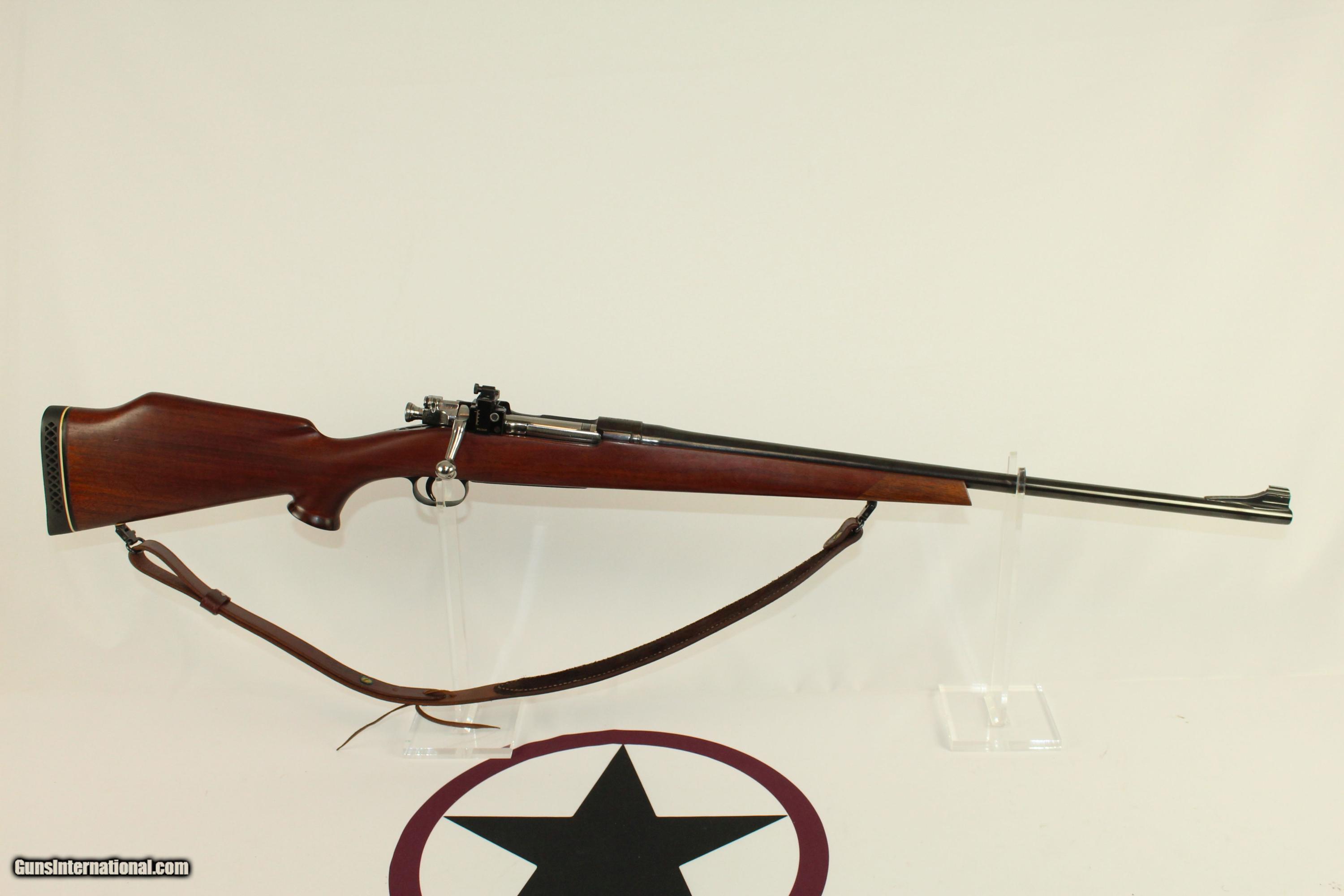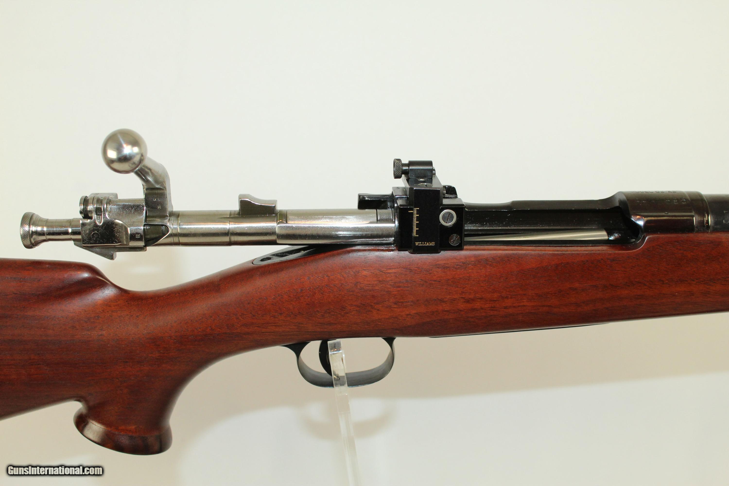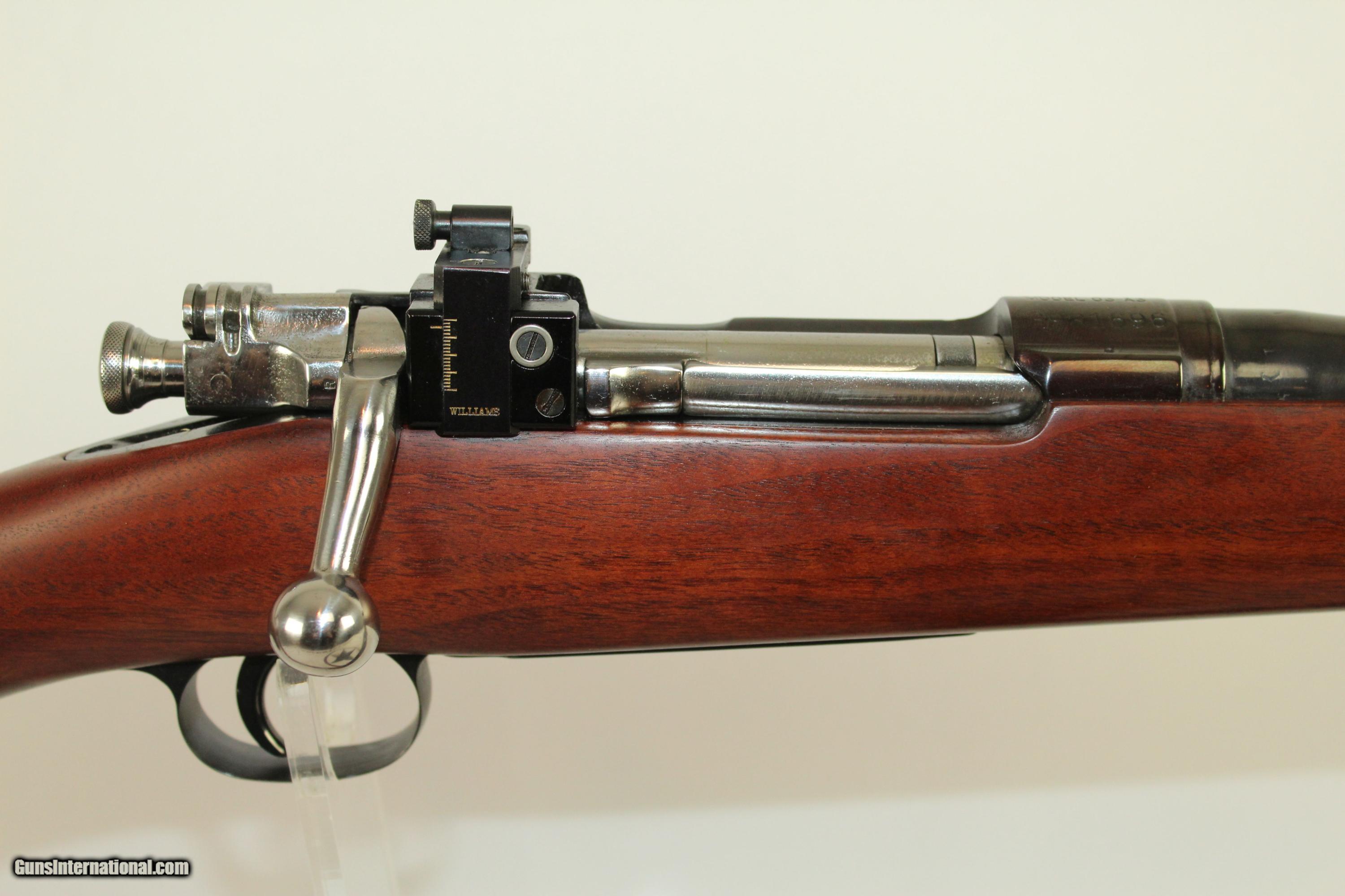 Description: EXCELLENT WWII Remington 1903A3 Bolt Action Rifle Made in 1943, Custom Converted to a Hunting Rifle Here we present a Remington US Model 03A3 Bolt Action Infantry Rifle, made in September 1943. The Model 1903 was, of course, adopted by the US in 1903. It was issued en mass during World War I through World War II. This rifle would have been issued during World War II and very likely used in combat. It was, at some point, sold as surplus. This specimen has been artfully transformed from a standard infantry rifle to a very fine hunting rifle. The barrel has been free-floated, highly polished and deeply blued. The front sight is a fine bead atop a ramp that has a tree-bark type of texturing on the back. The rear sight is a Williams receiver-mounted and adjustable peep sight. The walnut stock is custom with a pronounced comb. The forend and pistol grip are both capped and the finish is matte. Quick detach sling swivels have been installed. The leather sling is a Bianchi Cobra. The butt pad is a White Line from Pachmayr. Condition is excellent. The blue is virtually 100%. The markings are clear and legible. The stock is beautiful and rugged. The bore is excellent, with sharp rifling and shiny surfaces. The action is perfect. Here is the complete package: a significant rifle historically, made into a high-end, custom hunting rifle. Deer season is upon us. Here is a very cool, practical and beautiful rifle to hunt with. This firearm is classified as a Curio & Relic. Barrel is 24 inches in length. Caliber: 30-06 Springfield Overall condition as seen in photos. Very Fast. Very Safe. FREE SHIPPING. Will need to be sent to your local FFL. Guaranteed AUTHENTIC & Includes CERTIFICATE OF AUTHENTICITY. ancestryguns $1500 #10541 SOLD Curio/Relic: Yes |