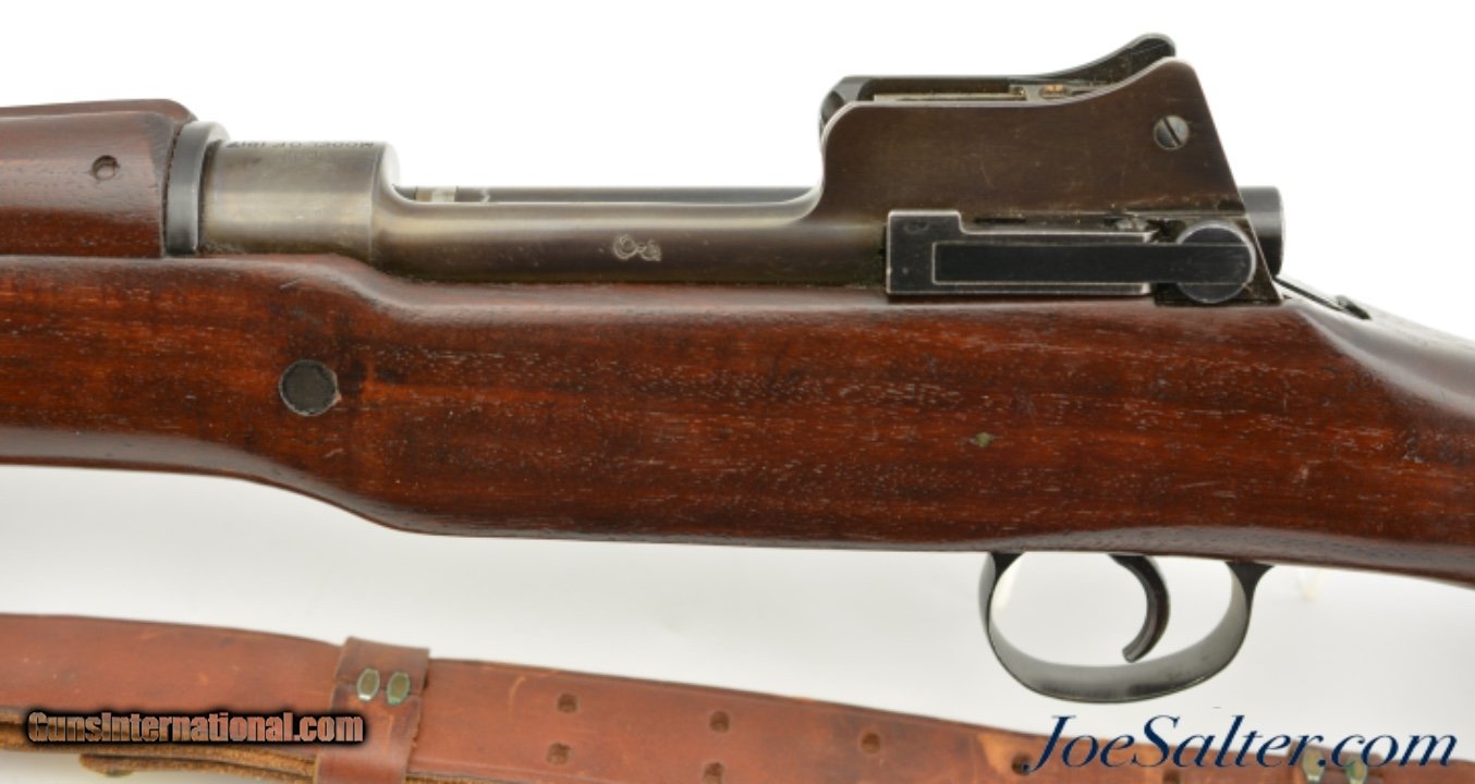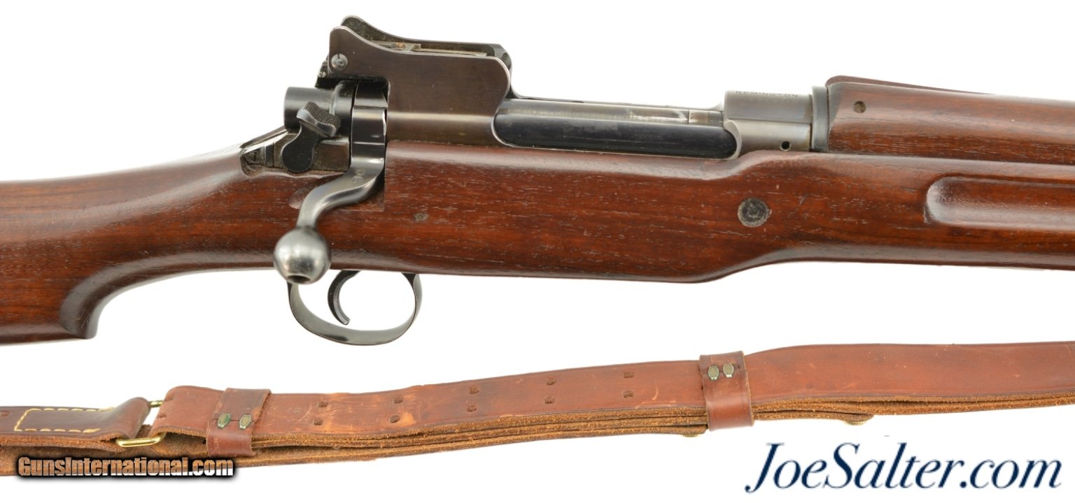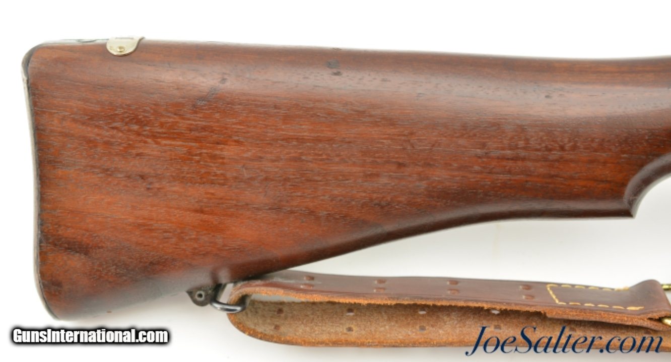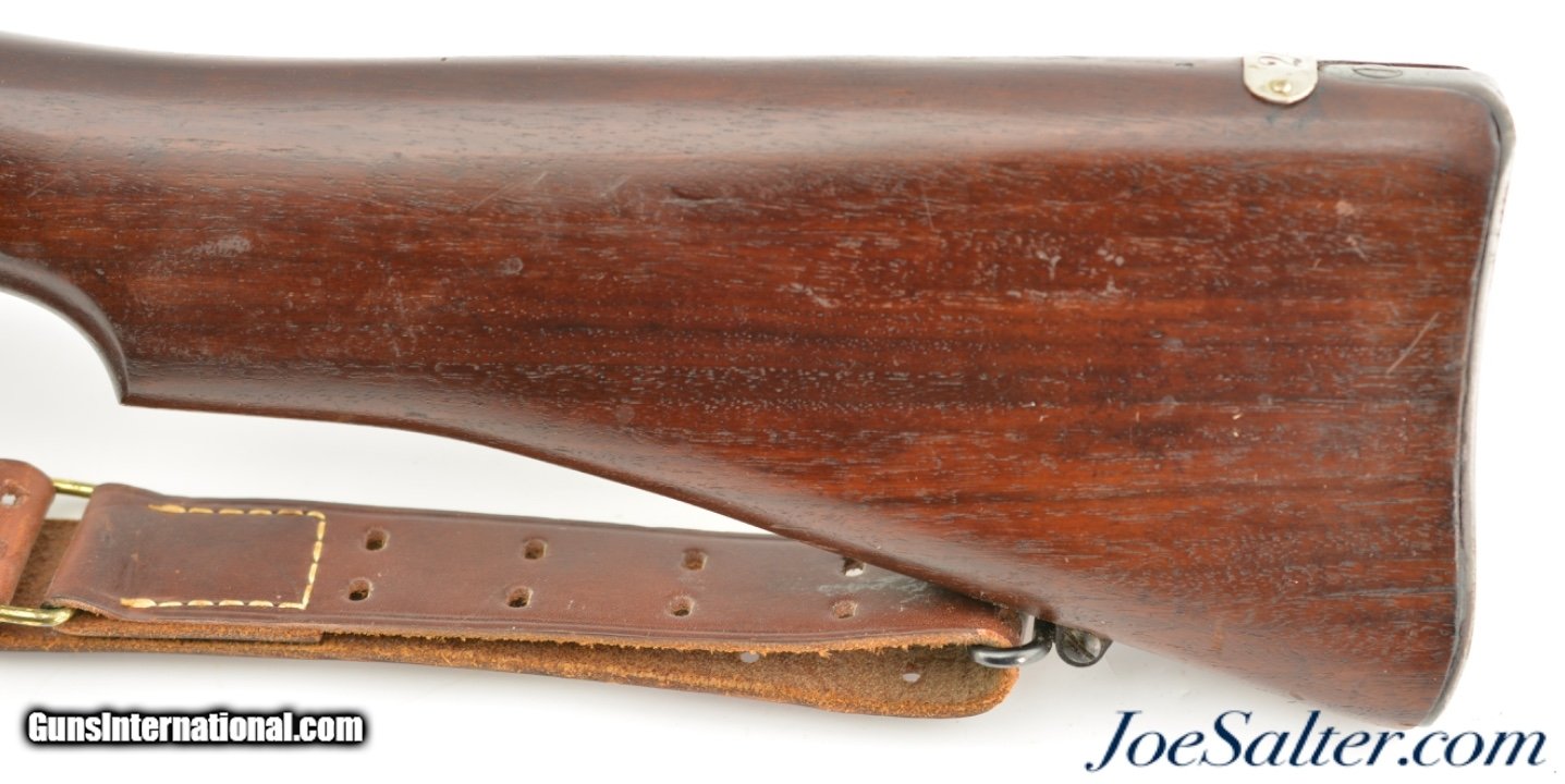 Description: Serial #538681, .30-06, 26" barrel with an excellent, bright bore. This is a handsome rifle that has a 9-18 dated, "R" marked barrel and all Remington-marked parts. The metal has retained 92-95% of the original blue finish, with some trace silvering at the muzzle, along some of the raised edges, and on the bearing surfaces of the bolt. The markings are crisp and clear, and the "R" marked stock and handguard are likewise in excellent condition, with only minor handling marks and minor blemishes scattered about the added varnish finish. The eaglehead inspection proof on the left side of the receiver was intentionally obscured at some point, probably when the rifle was removed from government stores and transferred to either a military fraternal organization, or school judging by the added rack number plaque on the heel of the butt ("24"). Additionally, the rifle is fitted with a Model 1907 type leather sling that is in excellent, little-used condition. This is a splendid example of a Model 1917 Enfield, and is in fine-near excellent condition. FFL or C&R SOLD |