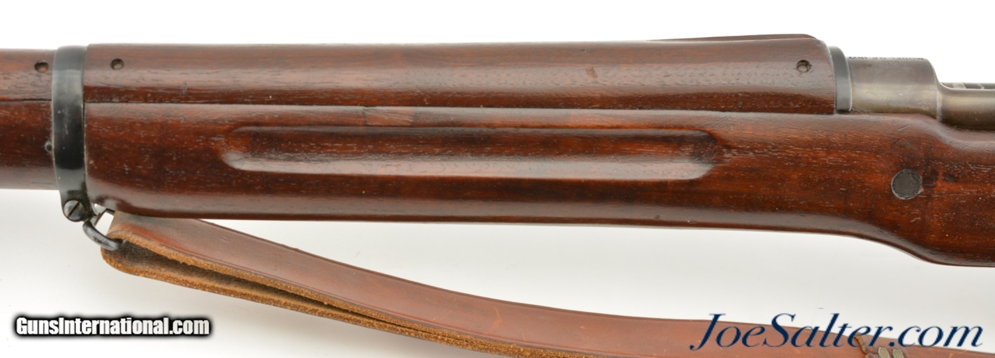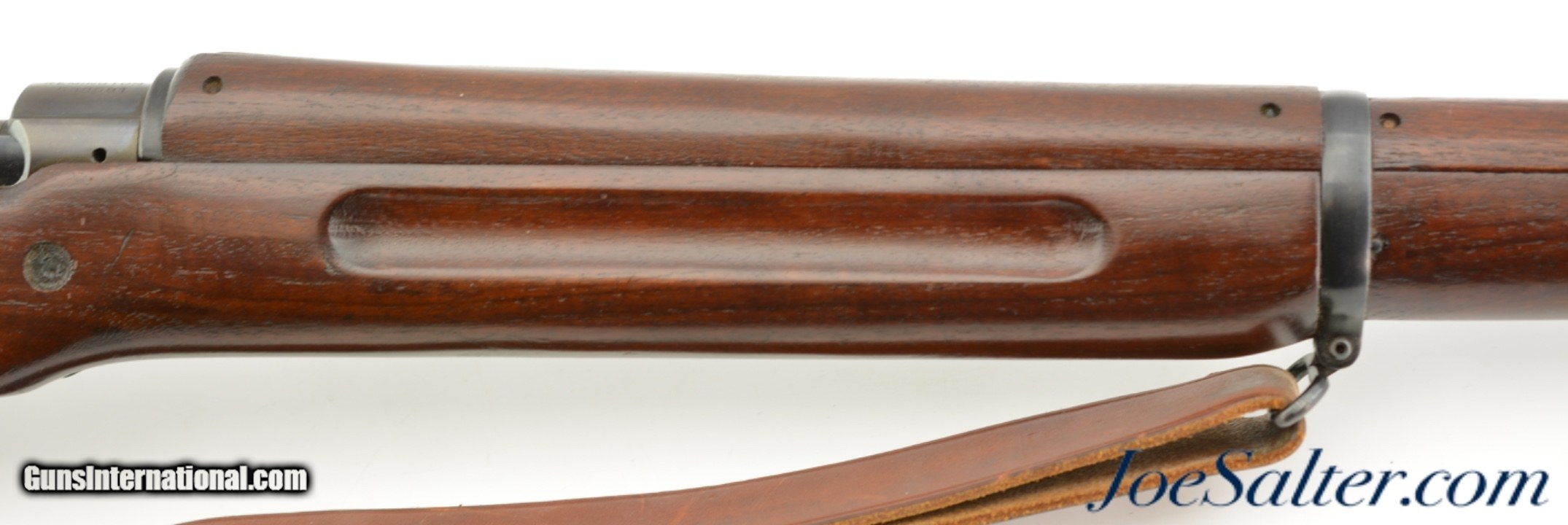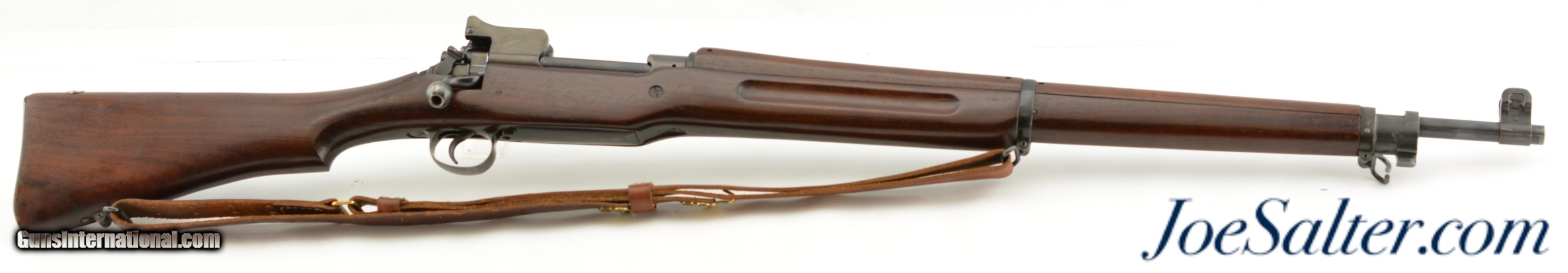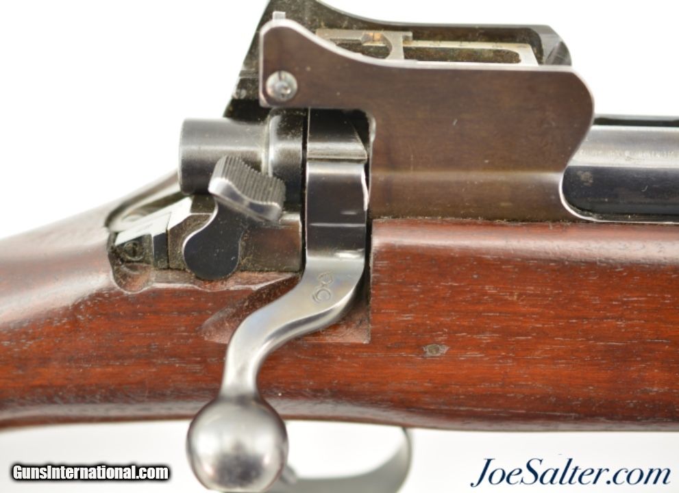 Description: Serial #538681, .30-06, 26" barrel with an excellent, bright bore. This is a handsome rifle that has a 9-18 dated, "R" marked barrel and all Remington-marked parts. The metal has retained 92-95% of the original blue finish, with some trace silvering at the muzzle, along some of the raised edges, and on the bearing surfaces of the bolt. The markings are crisp and clear, and the "R" marked stock and handguard are likewise in excellent condition, with only minor handling marks and minor blemishes scattered about the added varnish finish. The eaglehead inspection proof on the left side of the receiver was intentionally obscured at some point, probably when the rifle was removed from government stores and transferred to either a military fraternal organization, or school judging by the added rack number plaque on the heel of the butt ("24"). Additionally, the rifle is fitted with a Model 1907 type leather sling that is in excellent, little-used condition. This is a splendid example of a Model 1917 Enfield, and is in fine-near excellent condition. FFL or C&R SOLD |