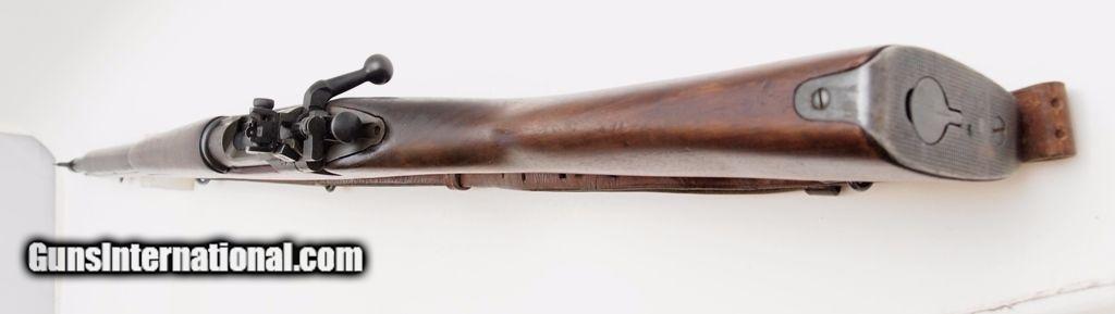 Description: Remington 03A3 .30-06, 24" bbl, bright shiny bore, good rifling, adjustable rear peep sight, blade front sight, "U.S." - "REMINGTON" - "MODEL 03A3" - "3874542" stamped on the top of the action, "RA" _ Flaming bomb - "5-43" stamped on top of barrel just behind the front sight, "Circle P" stamped on stock behind the trigger guard with marks stamped in front of the action, "Crossed Canons" - "RA" - Rectangular box with "FJA" inside are stamped on left side of stock above the trigger, nice smooth wood stock, sling loops, leather sling, and metal butt plate. This rifle is in very good condition. Add 3% for Credit Card Shipping $30.00 SOLD |