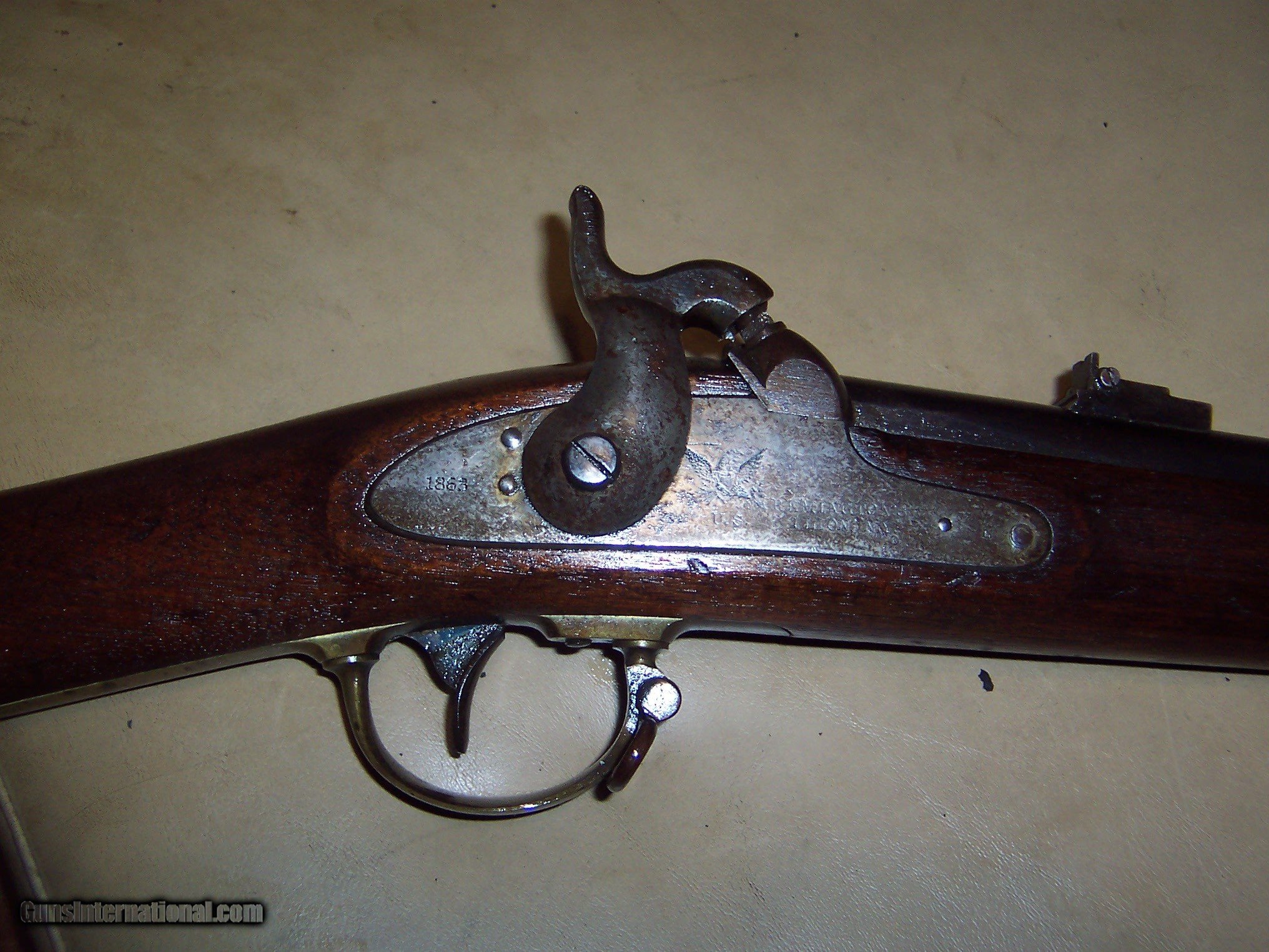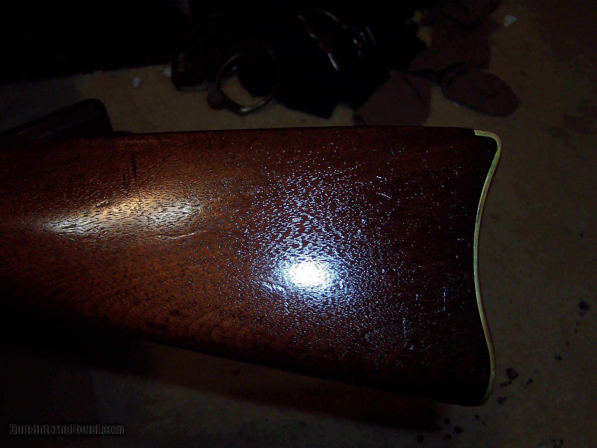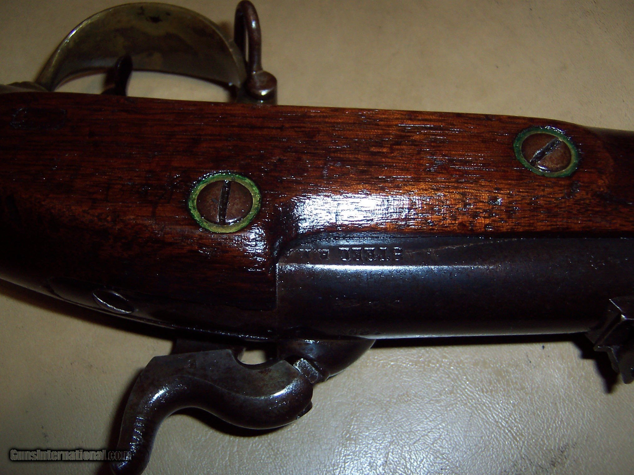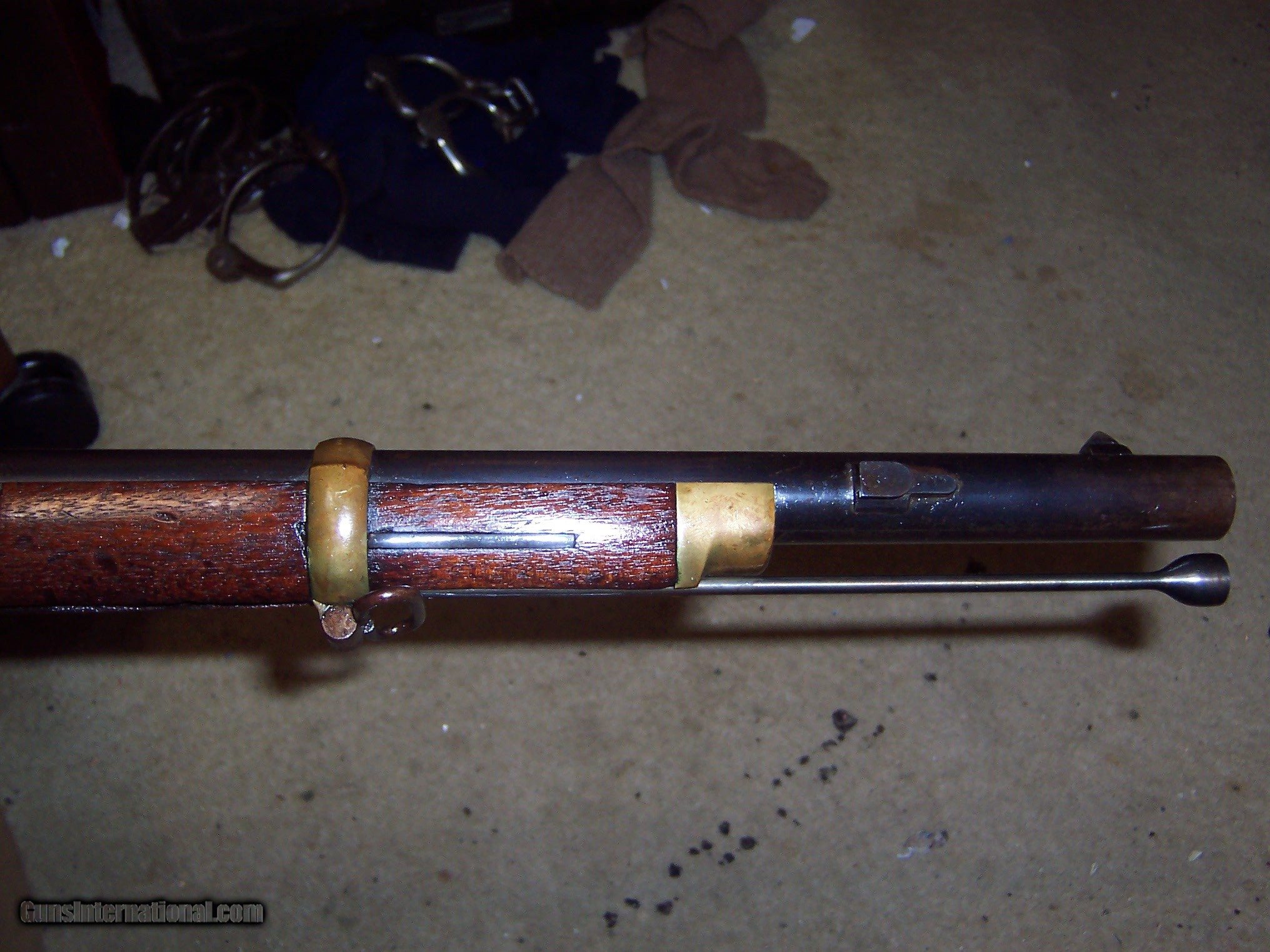 Description: looks like 7 grove rifling // bore has light red rust but should clean to fine /// repo dixie ramrod// this appears to be in excelent condition ///action works fine //1863 date on barrel and lock ///95% original barrel blue// original nipple in butt trap // ex stock cartouch // $67 sh // all brass mountings / gun shows very little use just light handling marks/ $125 sh to new york SOLD Antique: Yes Manufacturer: remington Model: 1863 |