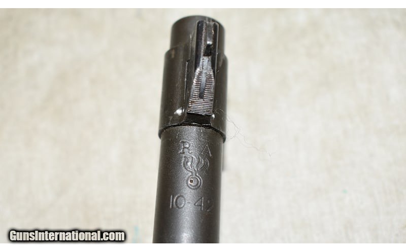 Description: This rifle was produced in late 1942, and the barrel is in agreement with the record. It is in great shape with few defects, all cartouches are sharp, all stamps clear. It doesn't appear to have been fired much. .30-06 Chambers: 5 rounds Metal Condition: Very good. Some handling marks but not bad. Wood Condition: Very good. All cartouches sharp and clear. There are a few light handling marks on the bottom of the fore arm. Bore Condition: Shiny and bright with good rifling. Barrels: "24 inches, stamped ""RA 10-42"" Triggers: Factory trigger. Stock Dimensions: LOP: 13 inches Fore End: Full-length military stock with heat shield. Butt Pad: Steel plate with storage port. Weight: 8 lb - 12 oz Sights: Post and ladder style notch. Item Location: Rogers Price: $1,399.99 Contact Seller |