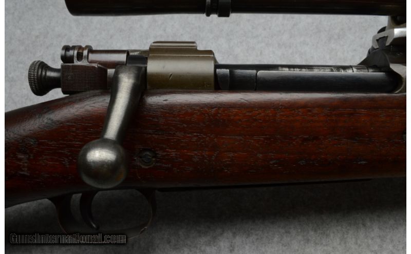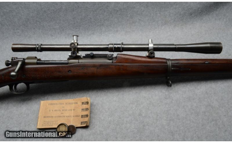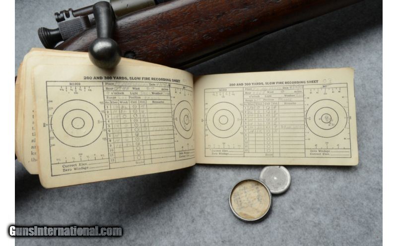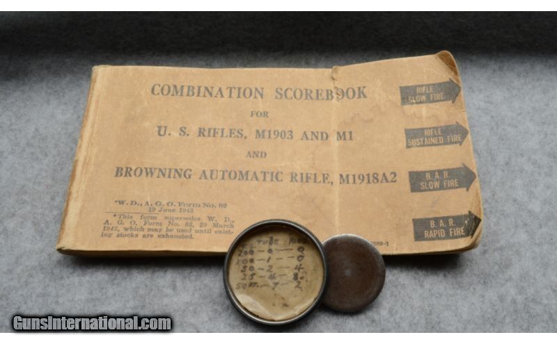 Description: SOLD Caliber Info: None (not stamped in steel) Chambers: 5 Rounds Metal Condition: Very Good Wood Condition: Good, Dents and Scuffs Bore Condition: Very Good Barrels: 24 Inches Triggers: Single Stock: Smooth American Wallnut Fore End: Smooth American Wallnut Butt Pad: Steel with round storage door Weight: 10 Pounds 9 Ounces Sights: Flip-up rear sight graduated to 2,500 metres (2,700 yd), barleycorn-type front sight. With Fecker Scope. Extras: USMC Sniper Score Book From 1944. Item Location: Noblesville, IN |