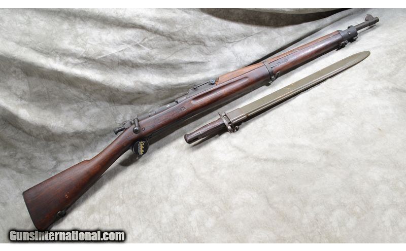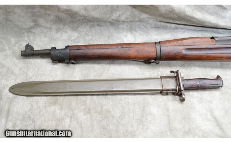 Description: Model 1903 with good wood, ladder style rear sight, manufactured 1942 according to the S/N 3,298,xxx. It includes a model 1906 bayonet with sheath. .30-06 Springfield SOLD Curio/Relic: Yes Chambers: 5 Metal Condition: Very good with a few handling marks. Wood Condition: Very good. A few handling marks but very sharp cartouches. Bore Condition: Shiny but a bit dark. Barrels: 24 inch Triggers: Military trigger. Stock Dimensions: 12-3/4 inch LOP. Fore End: Full-length walnut stock with walnut heat shield. Butt Pad: Steel plate with storage port. Weight: 9 lb. Sights: Military post and ladder style notch. Item Location: Rogers |