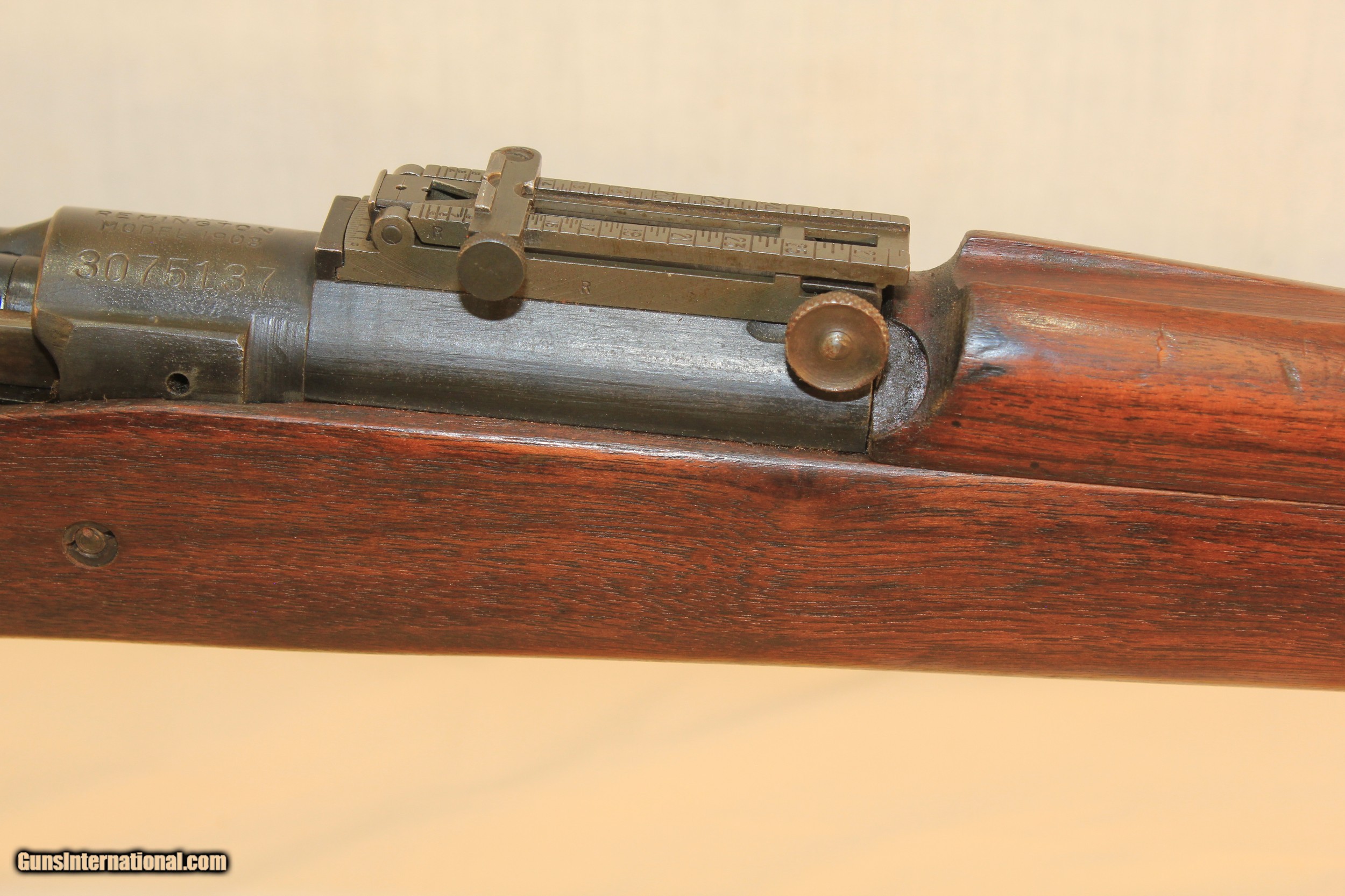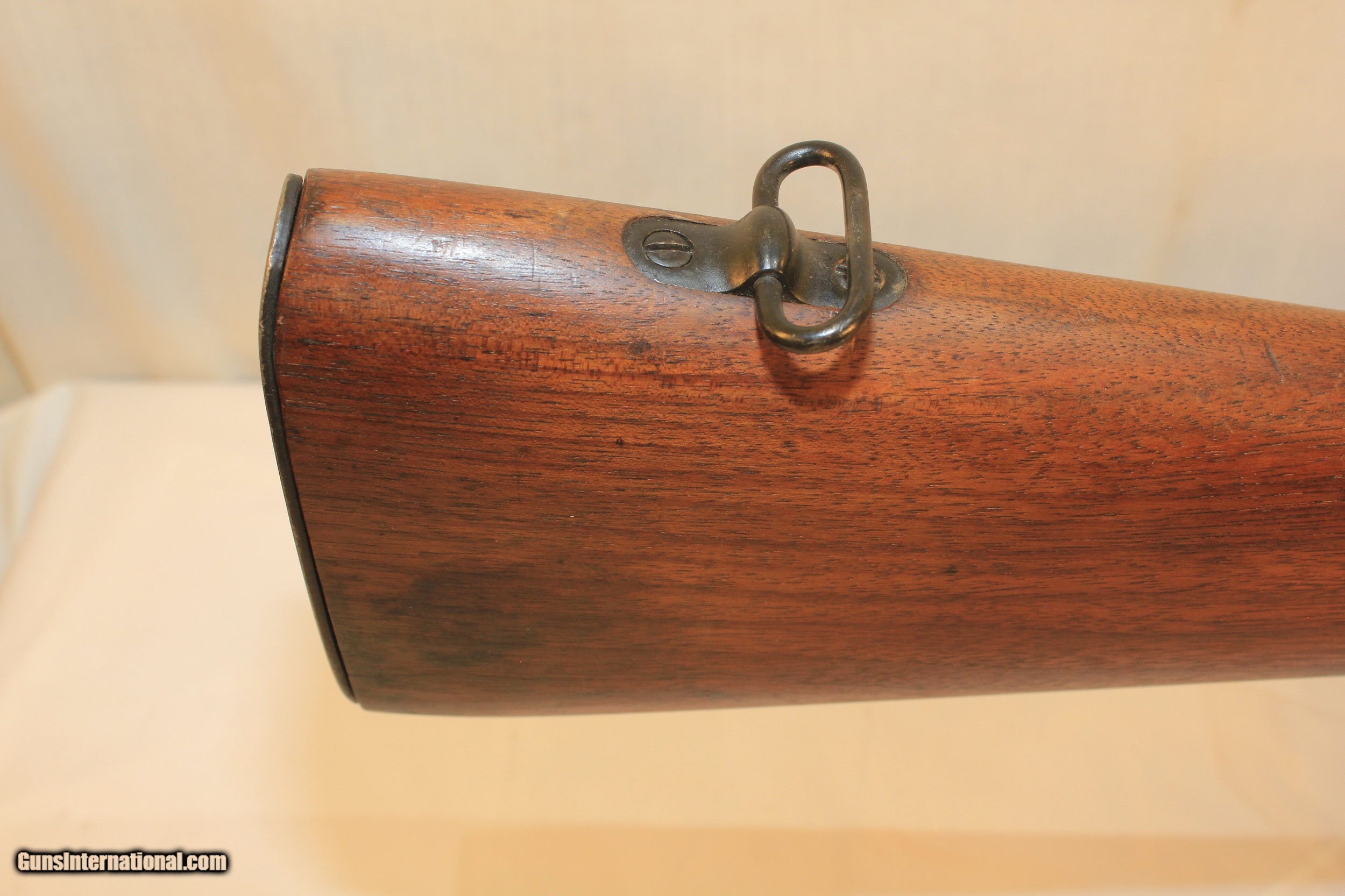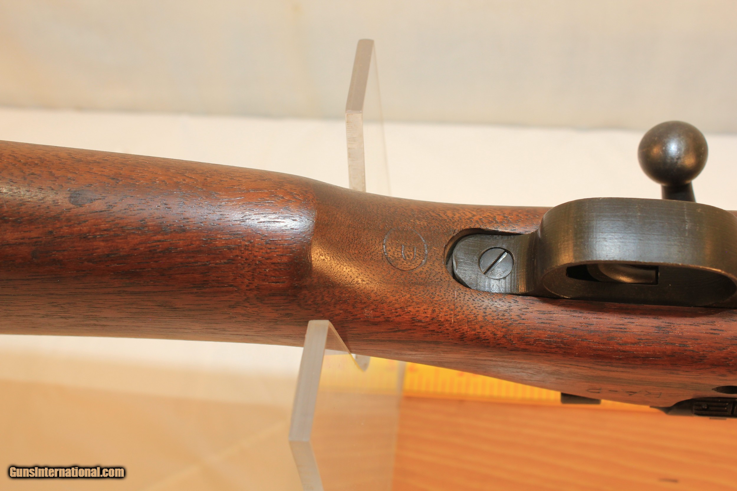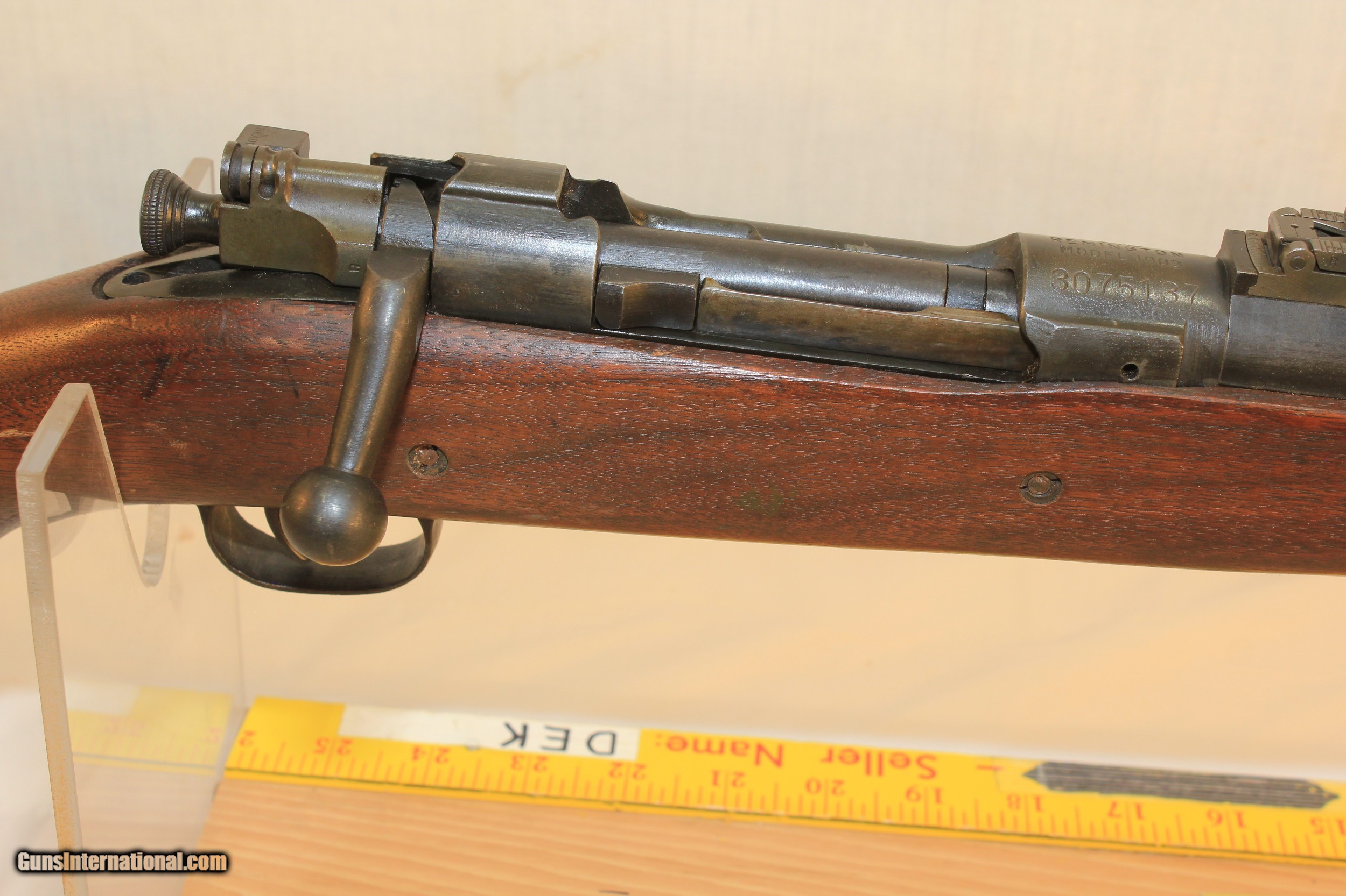 Description: This is a Remington made 1903 rifle with the barrel dated 4-42 with a very good bore with light oxidation in the groves. The nose cap and magazine floorplate show reapplier blue and the floorplate has areas of light wear and spots of oxidation. The walnut stock is in very good condition and the upper handguard has four light dings marked with a dark stain.The steel buttplate has worn to gunmetal gray with finish remaining in the groves. The stock is marked behind the trigger guard wit a crisp circled P proof mark. Receiver and barrel marks remain crisp and easily legible and the bolt shroud, safety tab, rear sight assembly barrel band are all "R" marked. Overall a nice original Remington made 1903 Rifle. $50.00 Shipping via Priority Mail C&R OK SOLD Curio/Relic: Yes |
