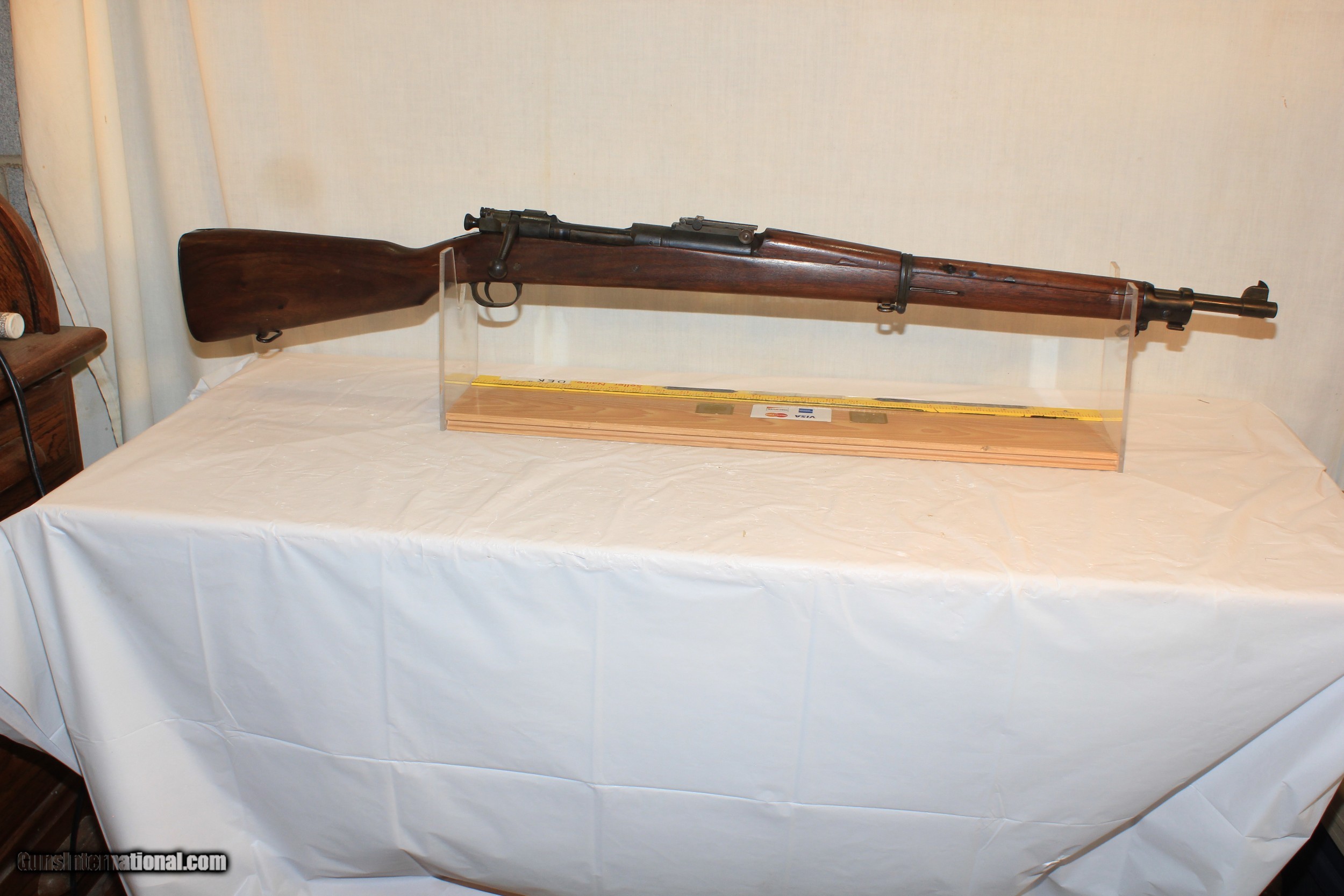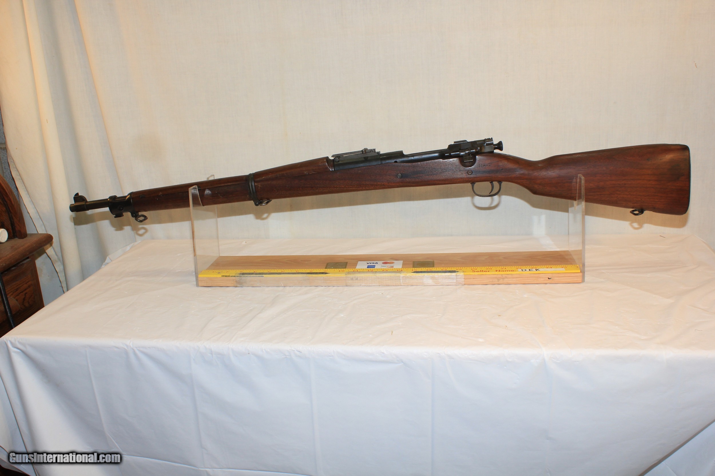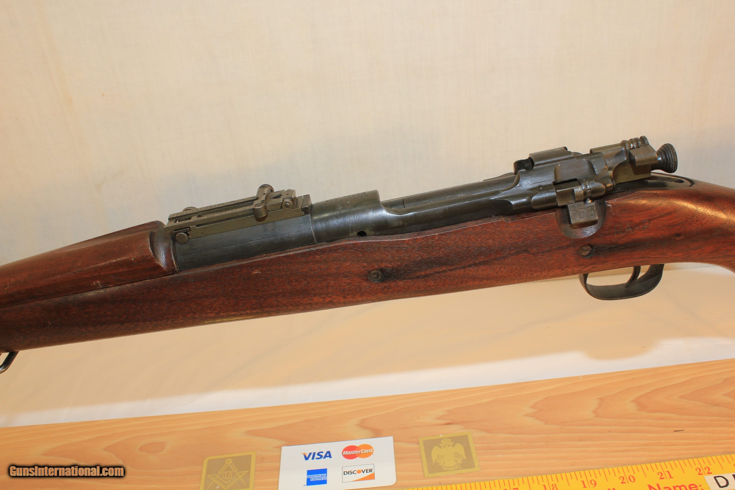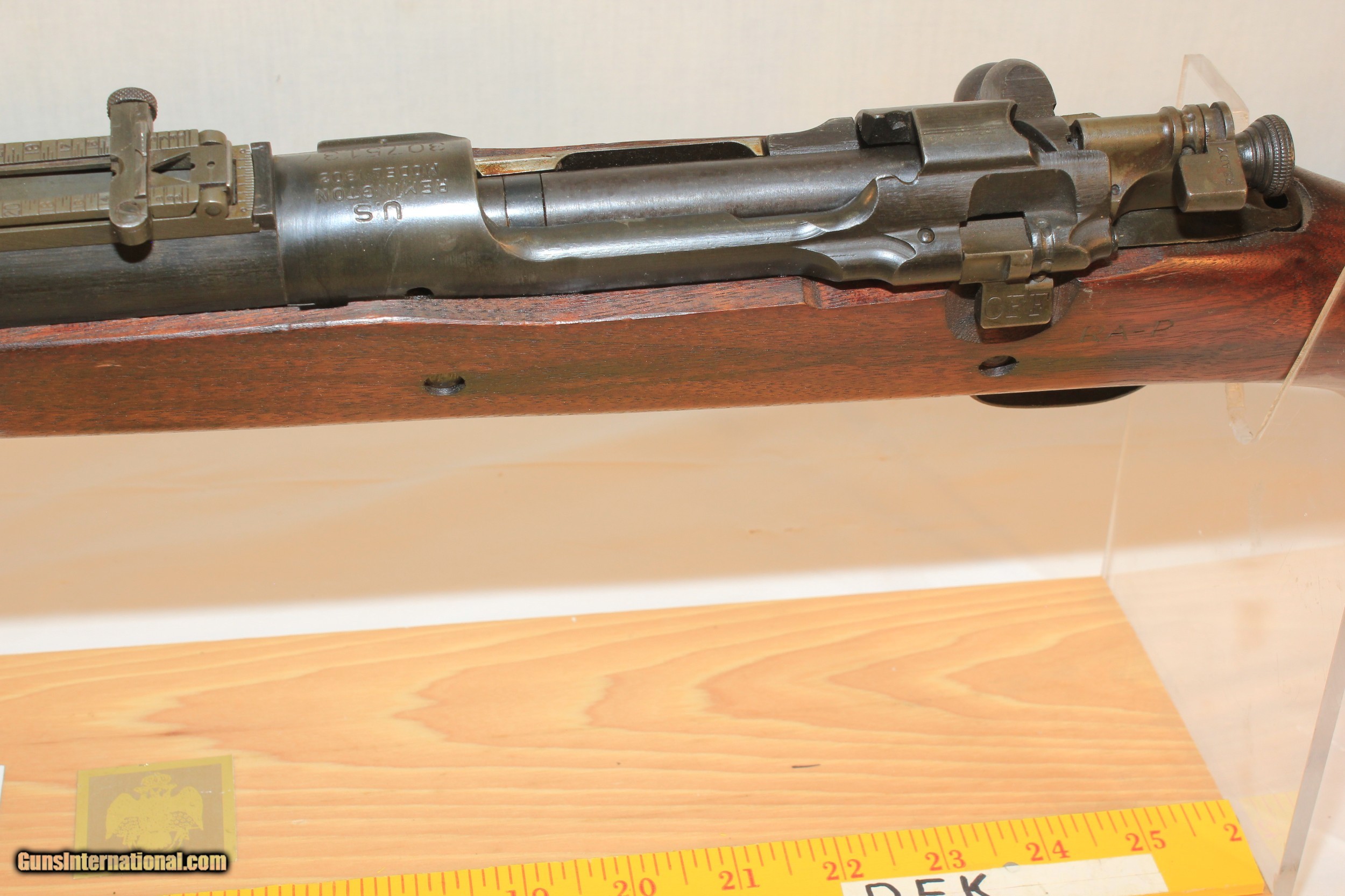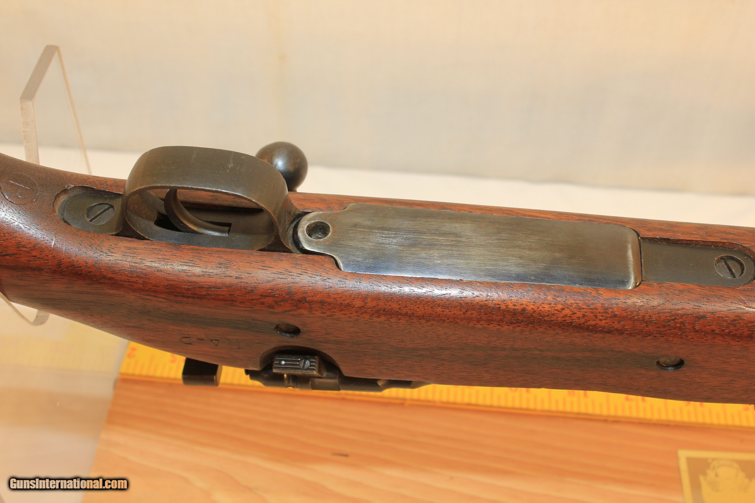 Description: This is a Remington made 1903 rifle with the barrel dated 4-42 with a very good bore with light oxidation in the groves. The nose cap and magazine floorplate show reapplier blue and the floorplate has areas of light wear and spots of oxidation. The walnut stock is in very good condition and the upper handguard has four light dings marked with a dark stain.The steel buttplate has worn to gunmetal gray with finish remaining in the groves. The stock is marked behind the trigger guard wit a crisp circled P proof mark. Receiver and barrel marks remain crisp and easily legible and the bolt shroud, safety tab, rear sight assembly barrel band are all "R" marked. Overall a nice original Remington made 1903 Rifle. $50.00 Shipping via Priority Mail C&R OK SOLD Curio/Relic: Yes |
