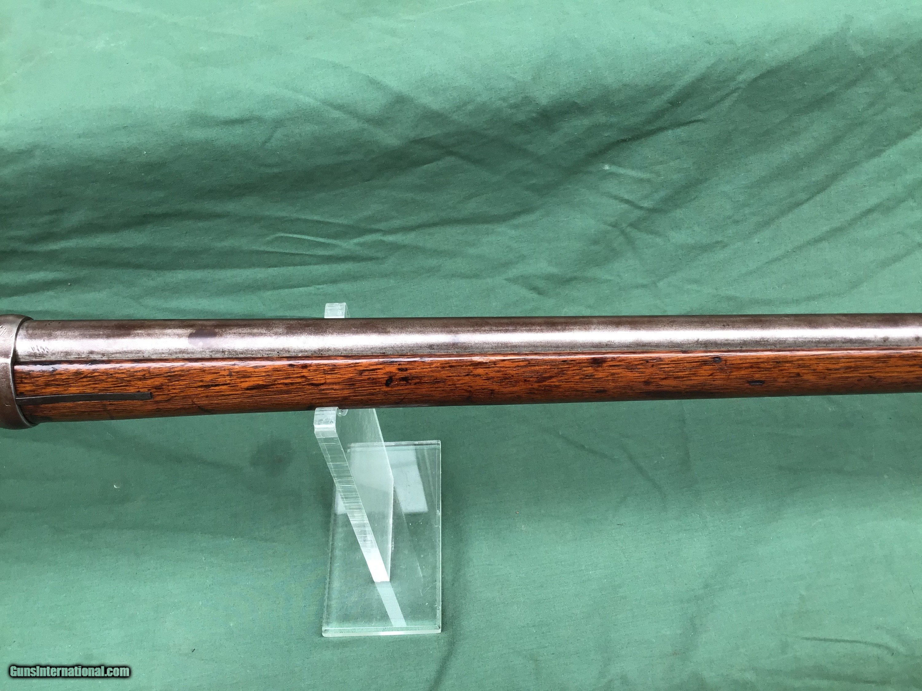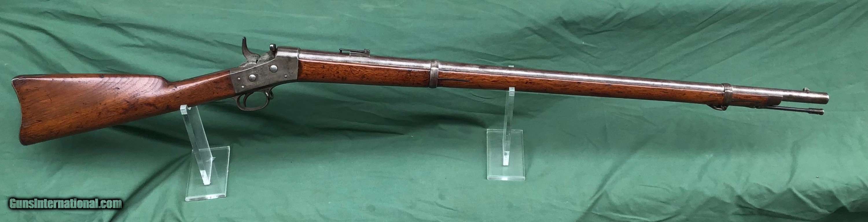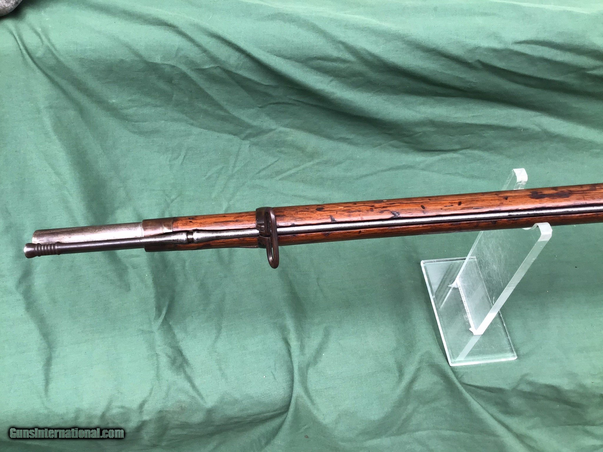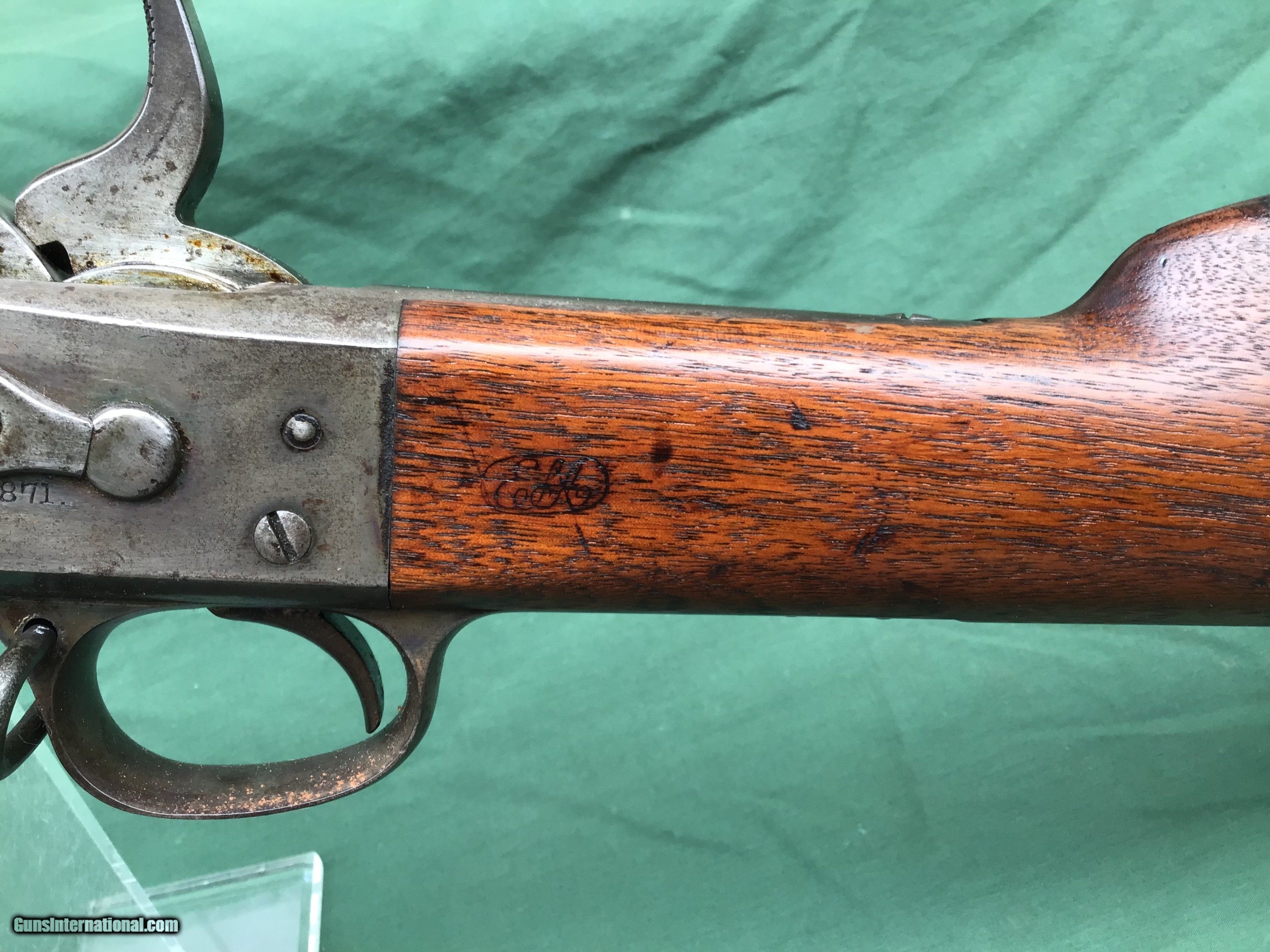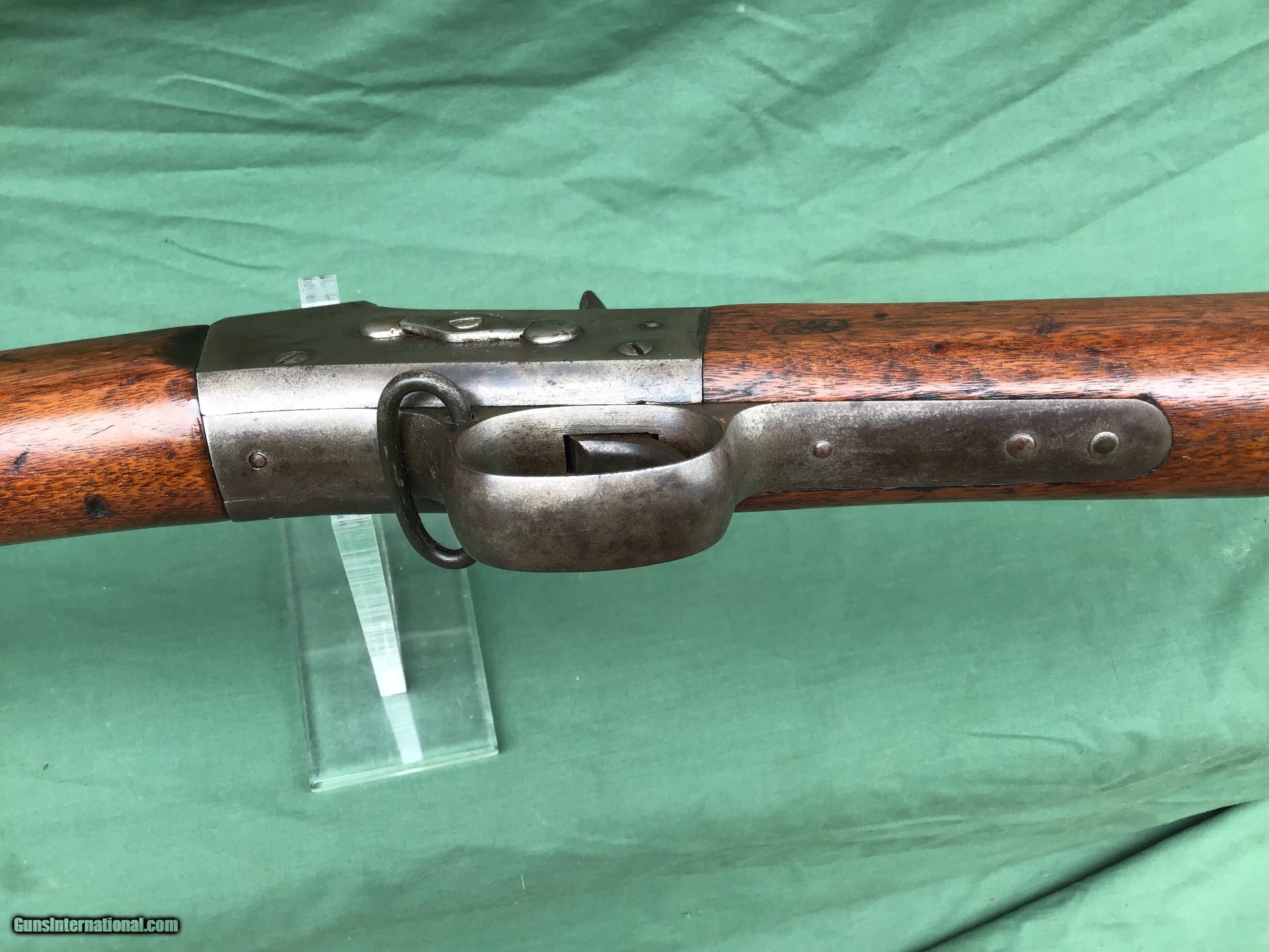 Description: Model 1871 Rolling Block Rifle U.S. Army Rifle made in partnership with Remington and Springfield. Manufactured in 1871-1872. 50 caliber Centerfire with a 36" round barrel. Very nice bore. Correct sights. Barrel retains a nice gray / brown patina. Rifle has all the correct markings and a nice cartouche on left side of wrist ( see pic). Receiver has traces of case colors with the remainder a gray / brown patina. This is a rarely seen military rifle, especially in this condition. Please feel free to ask questions. Antique and can be shipped directly to your doorsteps. SOLD Antique: Yes |