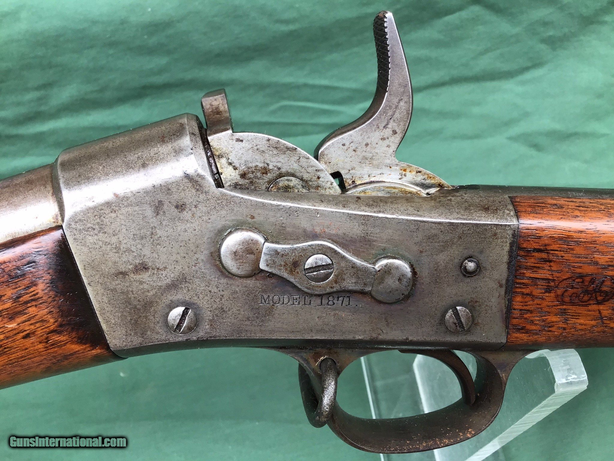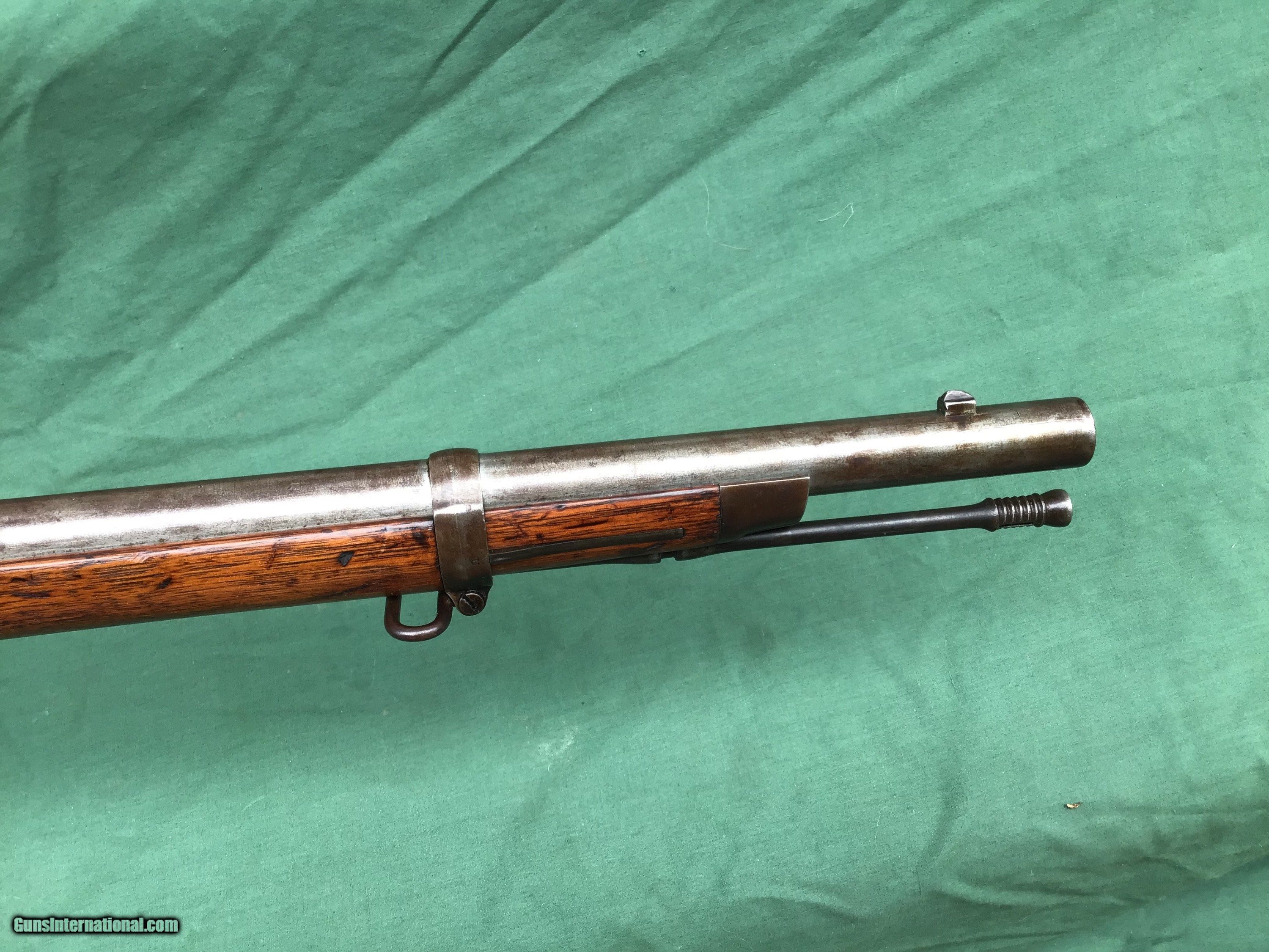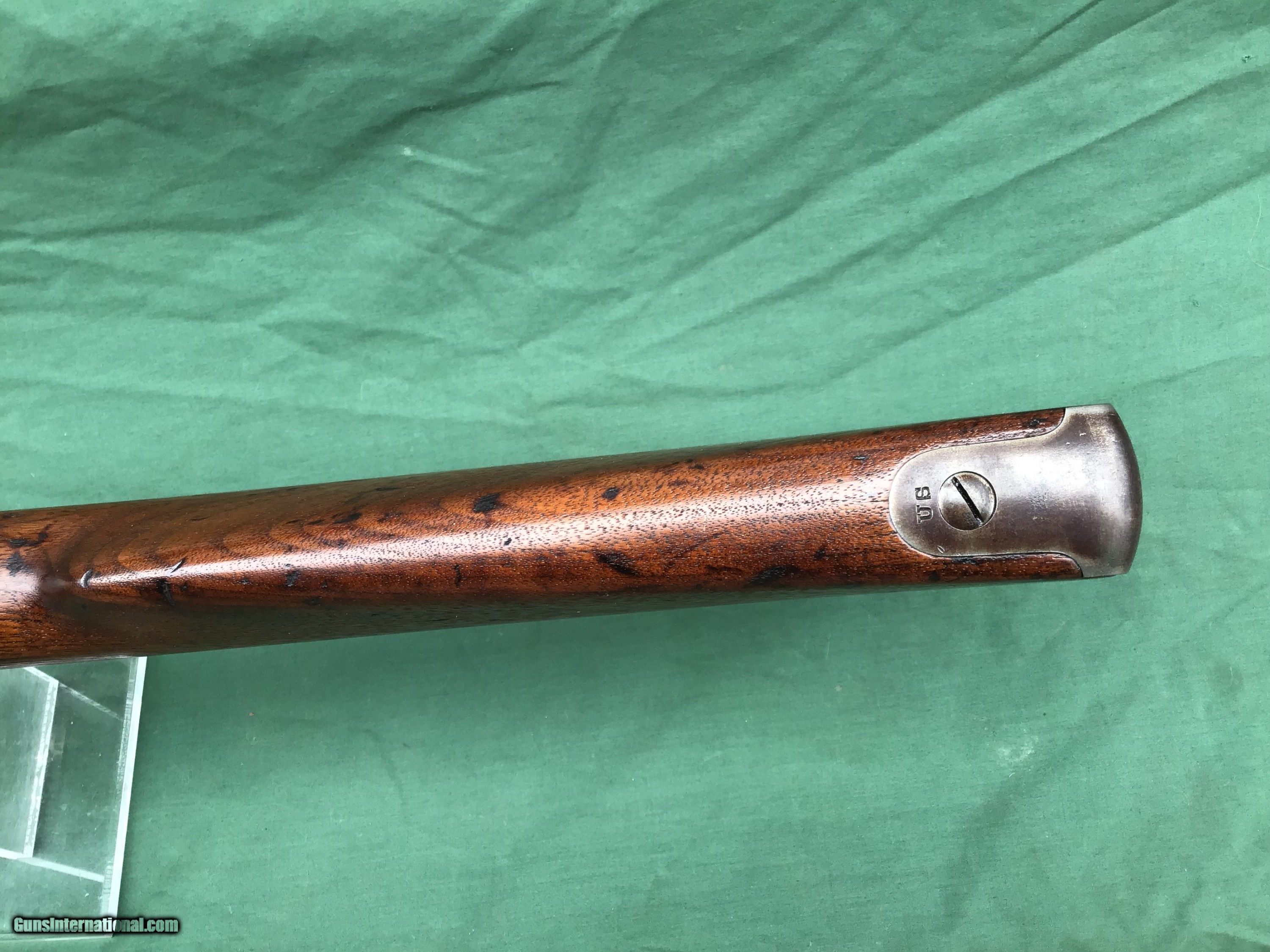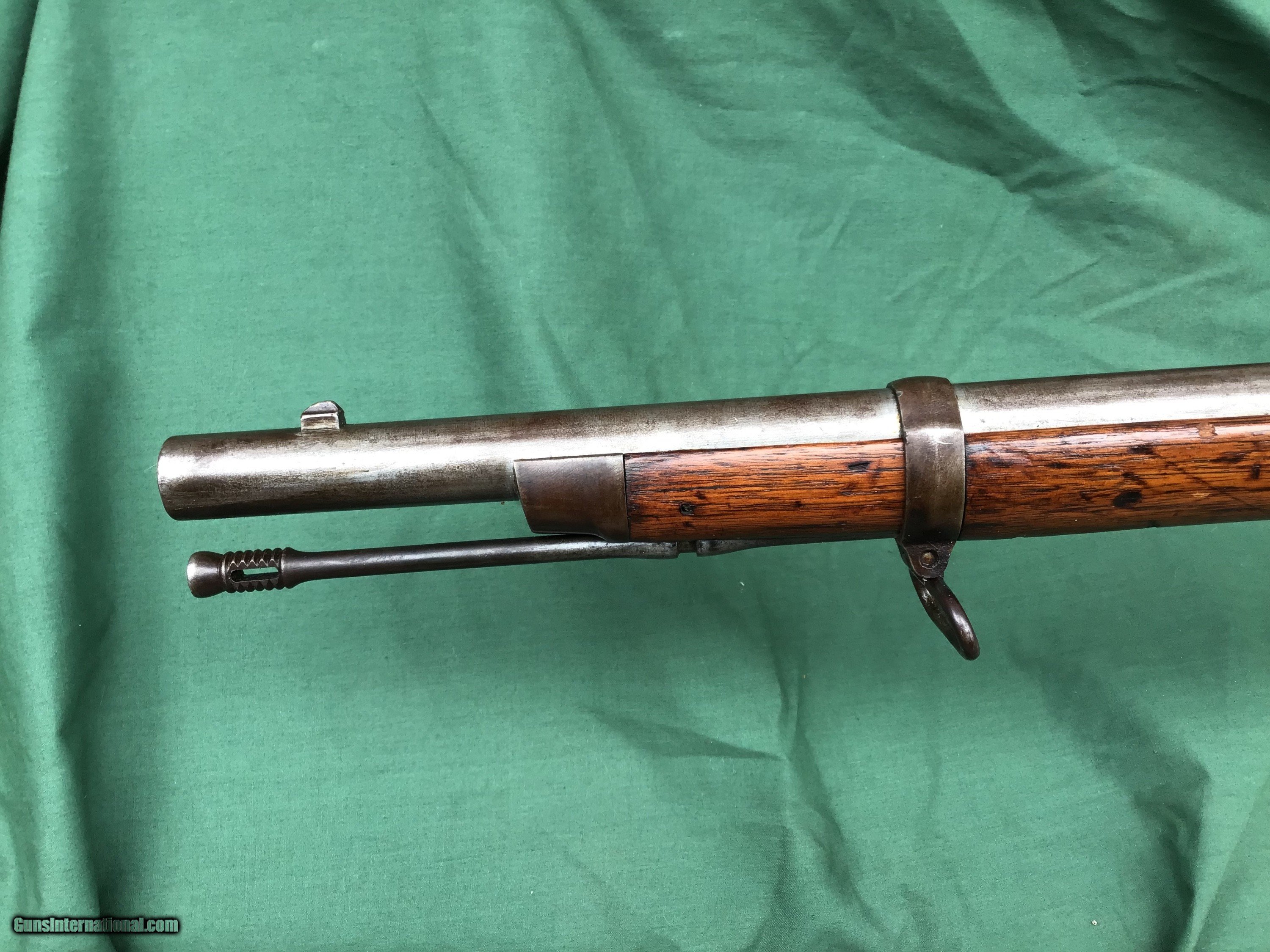 Description: Model 1871 Rolling Block Rifle U.S. Army Rifle made in partnership with Remington and Springfield. Manufactured in 1871-1872. 50 caliber Centerfire with a 36" round barrel. Very nice bore. Correct sights. Barrel retains a nice gray / brown patina. Rifle has all the correct markings and a nice cartouche on left side of wrist ( see pic). Receiver has traces of case colors with the remainder a gray / brown patina. This is a rarely seen military rifle, especially in this condition. Please feel free to ask questions. Antique and can be shipped directly to your doorsteps. SOLD Antique: Yes |