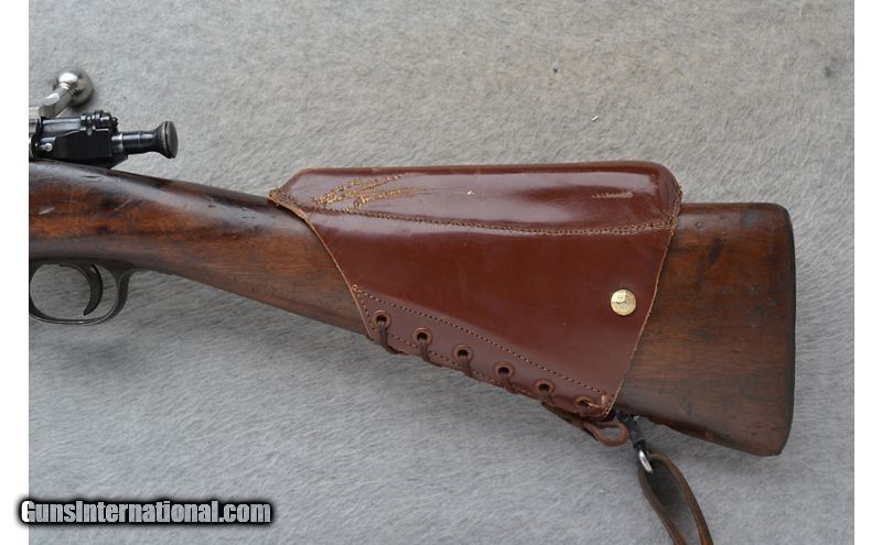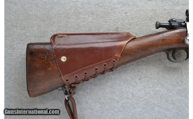 Description: This Remington U.S. Model 03-A3 is a right and bolt action U.S. Military rifle in .30-06 Sprg. Cal. It has a 24 inch barrel. A hooded aperture front sight with replaceable reticals and an adjustable aperture rear sight. The front of the receiver is drilled and tapped. The butt stock is a smooth grip hardwood straight grip. The forearm is a smooth grip two piece hardwood with a band. It comes with a leather sling and a laced on leather cheekpiece. S/N 4047576. .30-06 Springfield SOLD Curio/Relic: Yes Chambers: Right hand bolt action 5 round internal magazine. Metal Condition: Good. Some wear spots. Wood Condition: Good. Many handling marks. Bore Condition: Good. Barrels: 24 inch. Stock Dimensions: LOP 12 3/4 inches. Fore End: Smooth grip two piece hardwood with a band. Butt Pad: Checkered steel plate with a trap door storage compartment that contains various reticals for the front sight. Weight: 9 Lb. 5 Oz. Sights: Hooded aperture front with an amber surround. The reticals are changeable. Adjustable aperture rear. Front of receiver is drilled and tapped. Item Location: Richfield, WI |