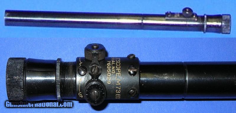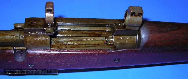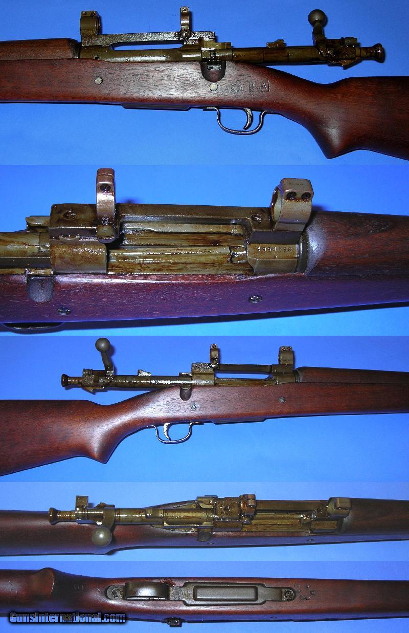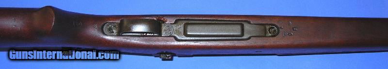 Description: Sold on Hold Pending Funds / World War II U.S. Remington Model 1903-A4 Sniper Rifle, serial # 4994256, cal. 30-06, 24" barrel with an excellent bore, marked on the muzzle "RA (Ordnance Bomb) 12-43", rifle has the correct split markings on the receiver ring, rifle equipped with a full "C" stock with full pistol grip along with the following stampings in the pistol grip area is a 1/2" diameter circled "P" firing proof with the letter W above and below this proof, manufacturer stamps forward of the mag well also with RA Ordnance Wheel FJA Proof on the left side above the trigger and a BA/11 on the left buttstock, stock has beautiful dark walnut with better grain than usually seen, metal appears to have original dark gray green parkerizing with blued bands still in the grease, the scope is a M73B1 serial numbered 33990 with blued finish perfect optics and crosshair reticule, the rifle and scope are in excellent condition, best I've ever seen, doubt if this rifle can be upgraded, Collectors Grade Condition. Inv.: # 2-1443 SOLD Curio/Relic: Yes |