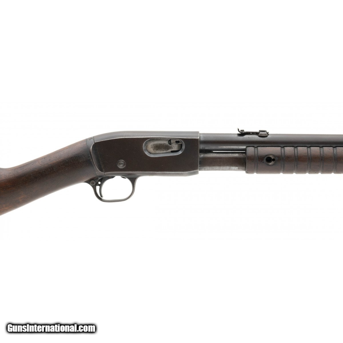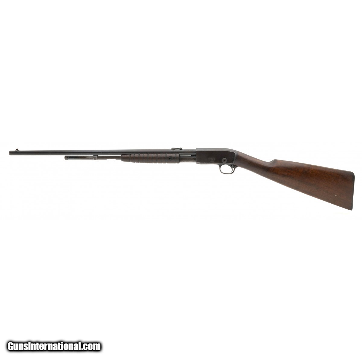 Description: " SN: 776913. Slide action rimfire rifle with 22"" barrel. The bore is excellent and the action works perfectly. The metal has turned a even brown patina. The stock is in excellent condition. Overall excellent condition. SOLD |