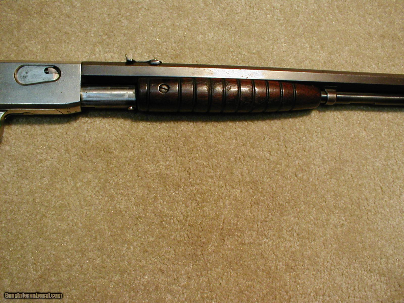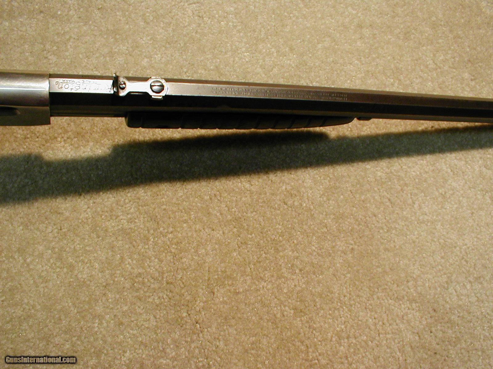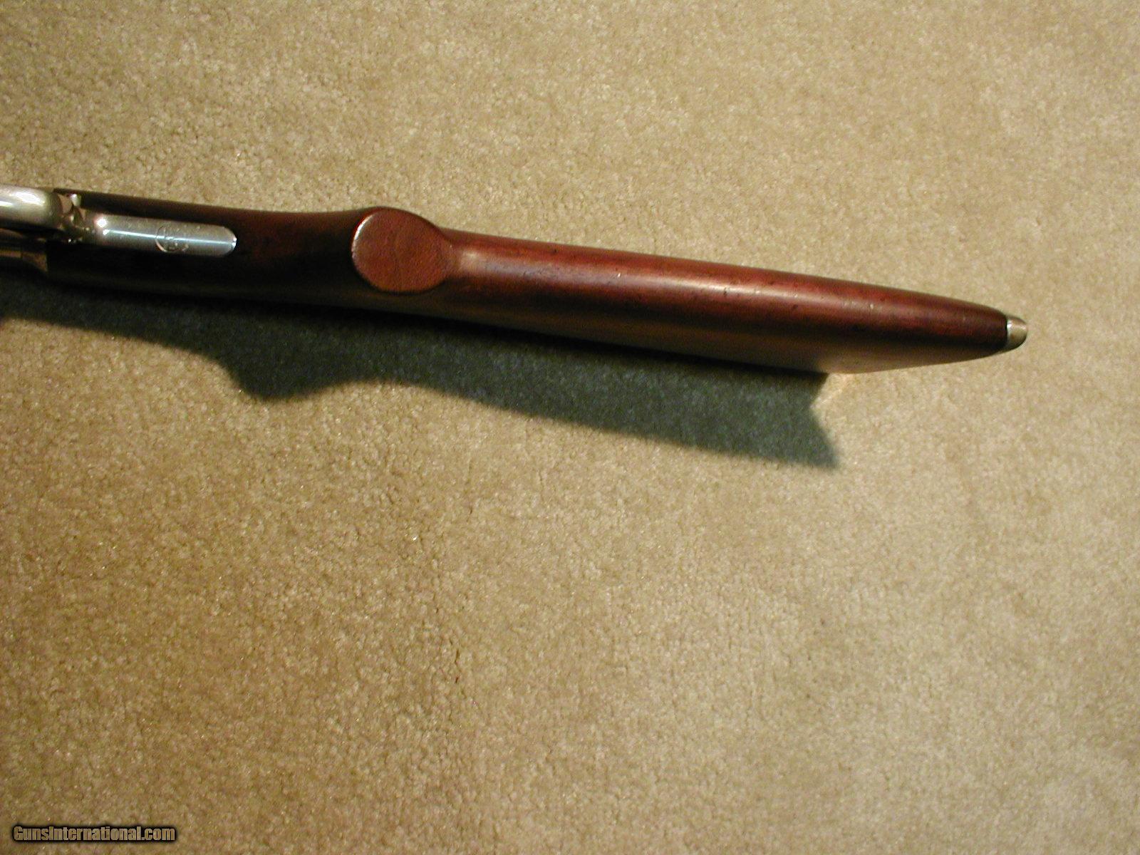 Description: RARE AND UNUSUAL VERY FINE CONDITION MODEL 12 GALLERY SPECIAL HALF-NICKEL FINISHED .22 SHORT OCTAGON RIFLE, most of these true gallery rifles end up in terrible condition, this one has the scarce nickel receiver and butt plate and both retain nearly all the bright nickel with only the freckling and a tiny spot of peeling on the left side of the receiver that you have to look carefully for or you'll miss it! fine barrel blue that shows some light thinning only, mag tube shows fine lightly ageing blue, exc. wood with only a few handling marks n the forearm, fine bore with only some scattered light roughness mainly toward the middle of the bore (usually these are found with totally trashed bores), original sights, tight action, exc. markings including the GALLERY SPECIAL marking on the left side of the receiver SOLD Curio/Relic: Yes Manufacturer: Remington Model: Model 12 Gallery Special Serial Number: 212XXX Caliber Info: .22 Short Condition: fine+-exc. Barrels: 24" oct Finish: nickel/blue |