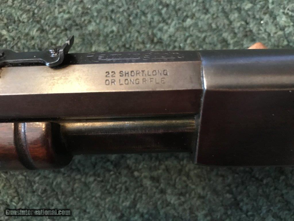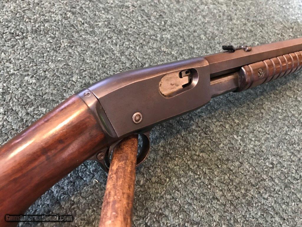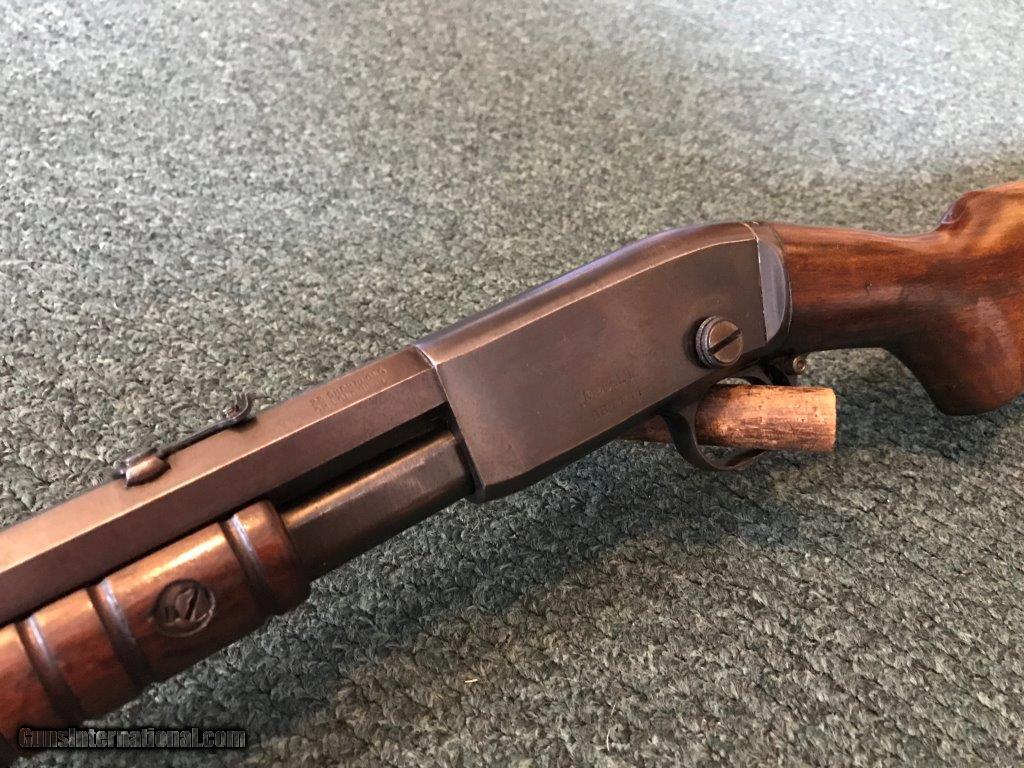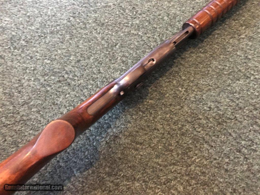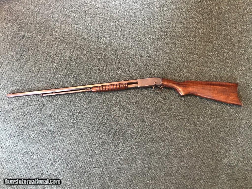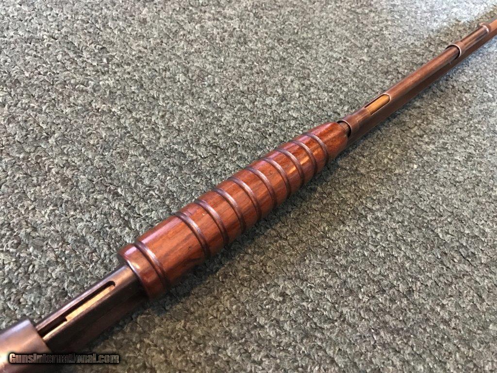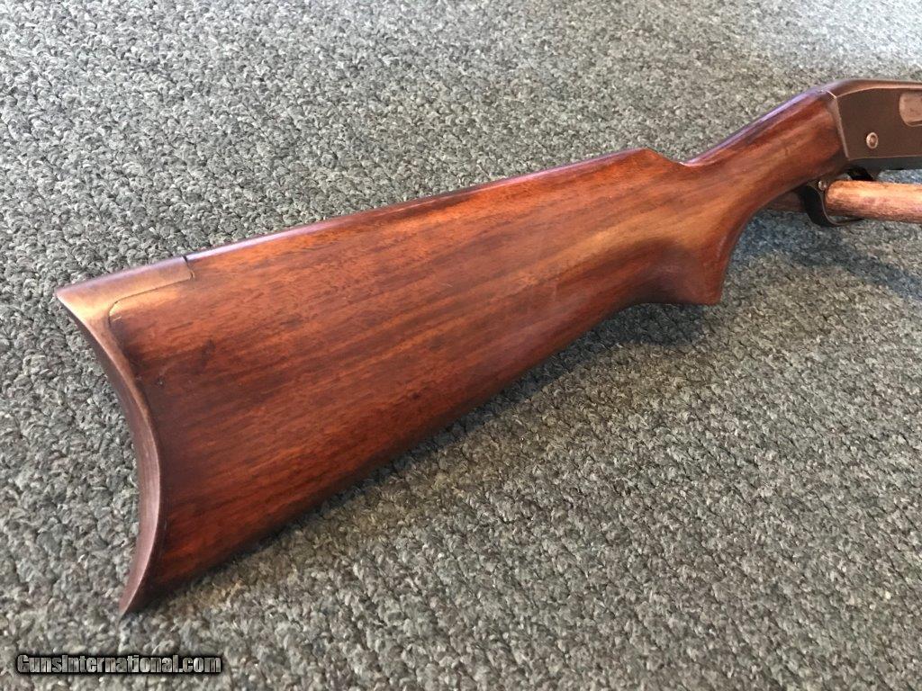 Description: Remington, Mdl. 12, .22 S L or LR, octogon barrel, all original slide action, short blade, front sight, wlnut pistol grip stock, very good condition, 13 1/4" length of pull. For further information call John at 941-748-7318. SOLD |