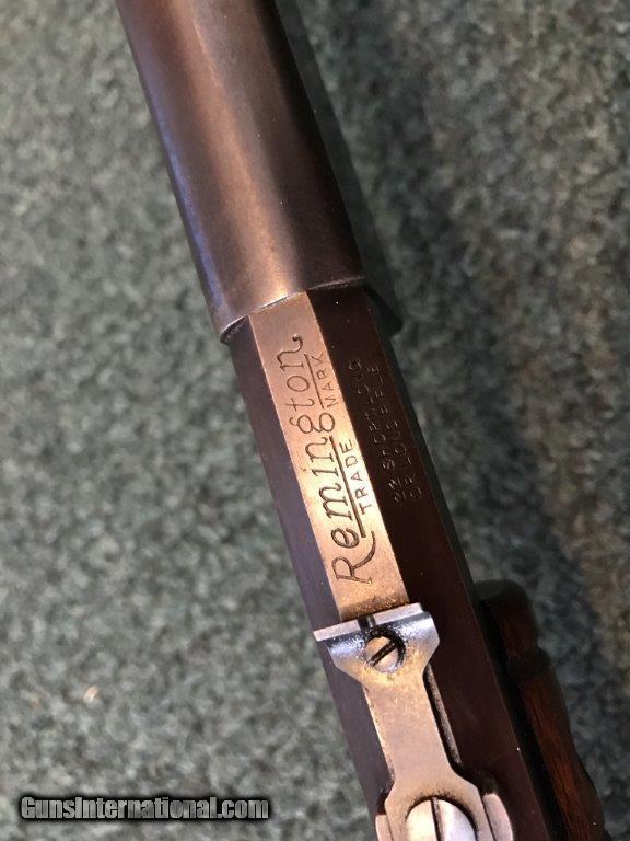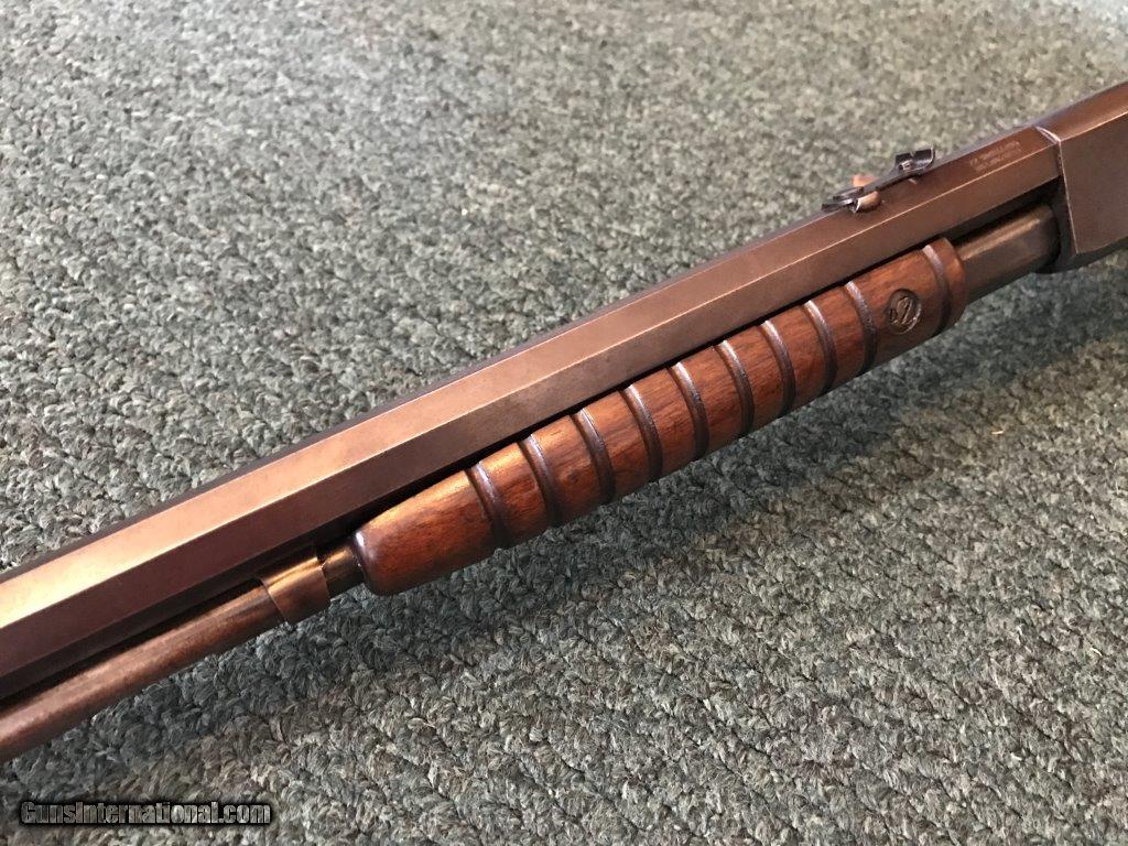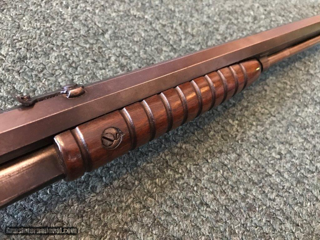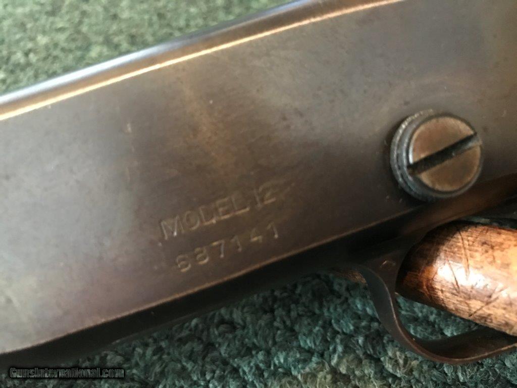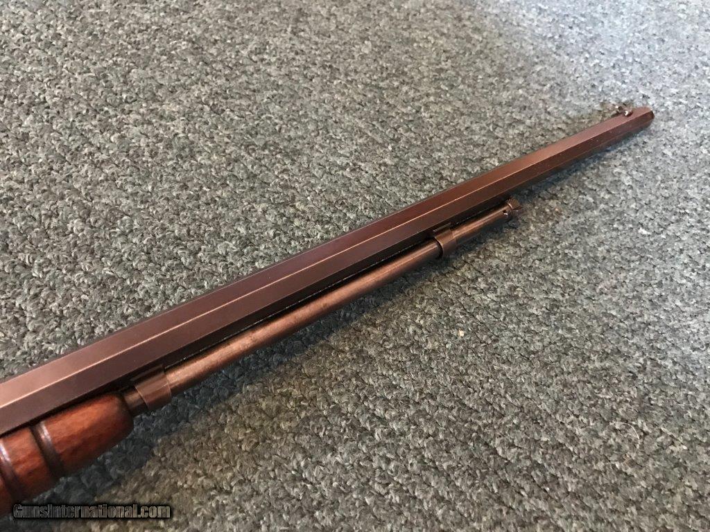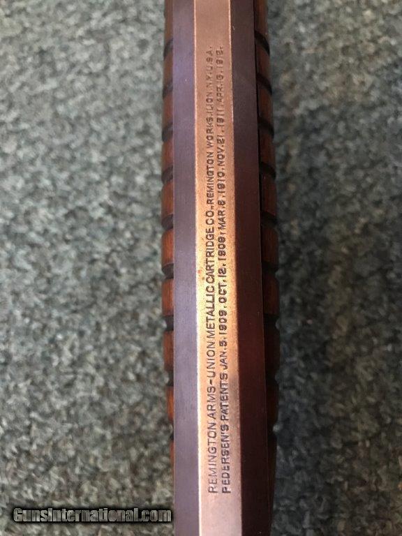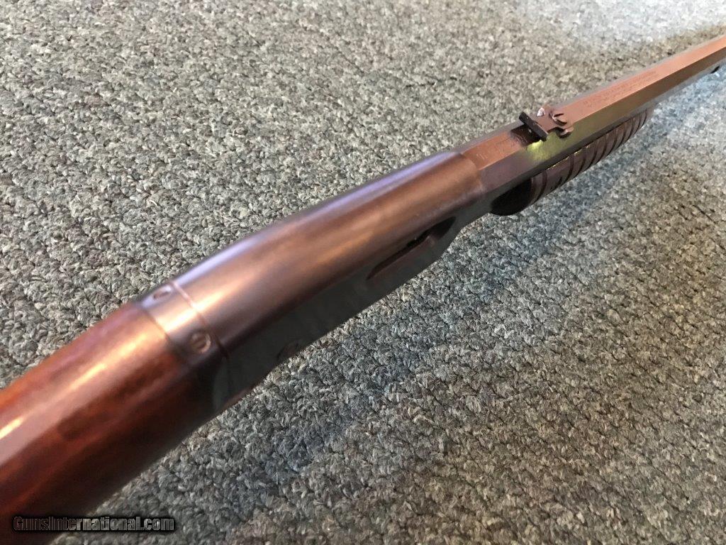 Description: Remington, Mdl. 12, .22 S L or LR, octogon barrel, all original slide action, short blade, front sight, wlnut pistol grip stock, very good condition, 13 1/4" length of pull. For further information call John at 941-748-7318. SOLD |