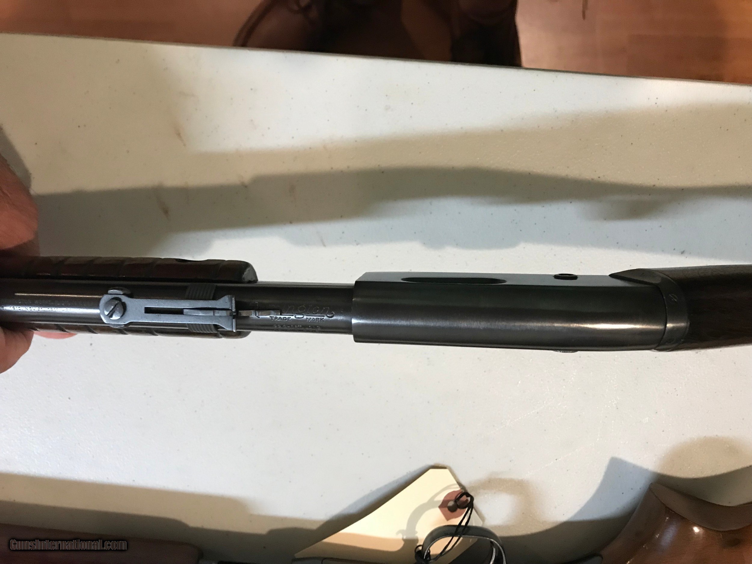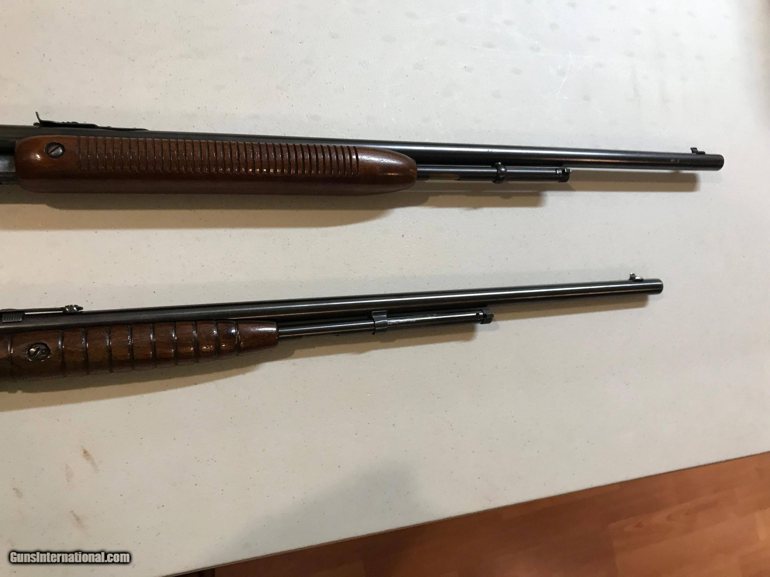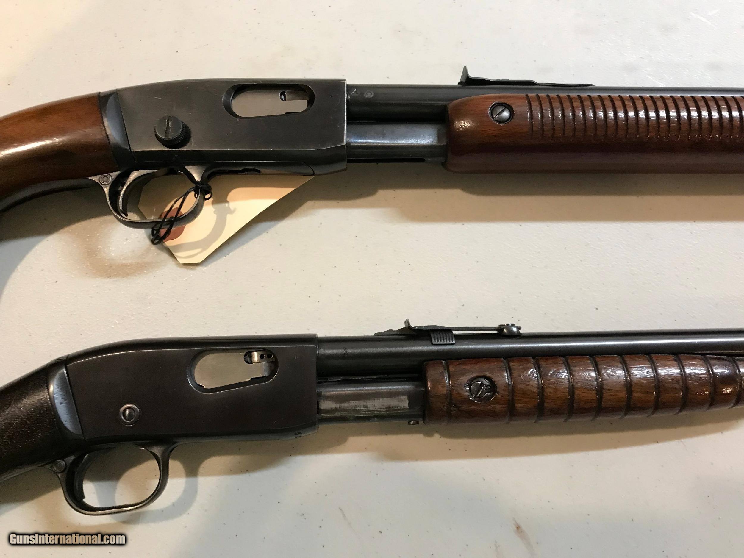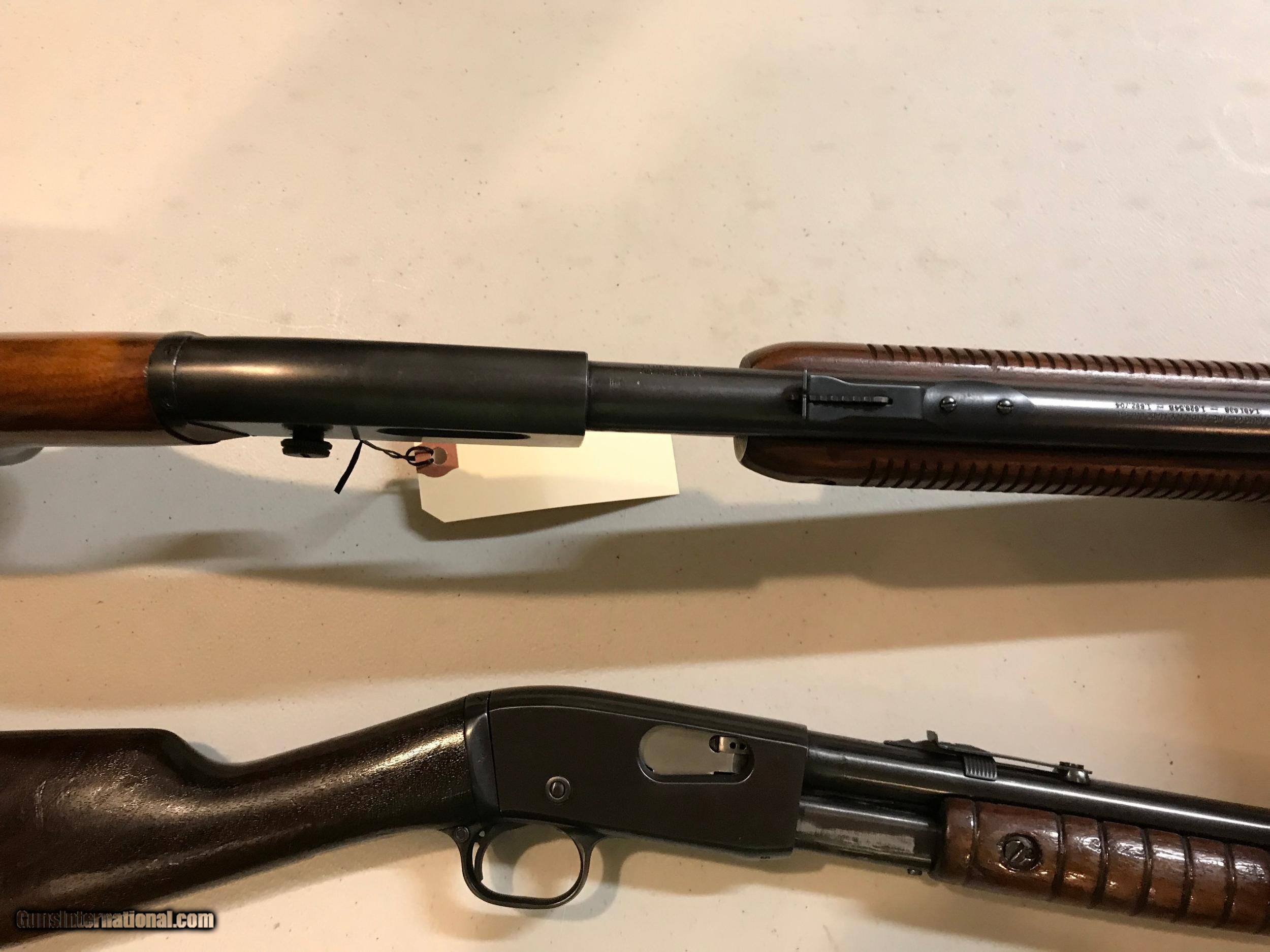 Description: Two of Remington's great 22 pumps. 1. Model 12 22' round barrel. Gun has been reblued and stocks re varnished. Re blue is an excellent job. Good mechanics. Bore is dark. 2. Model 121 sucessor to the 12. 24" round barrel. original finish. Nice bore. SOLD Curio/Relic: Yes |