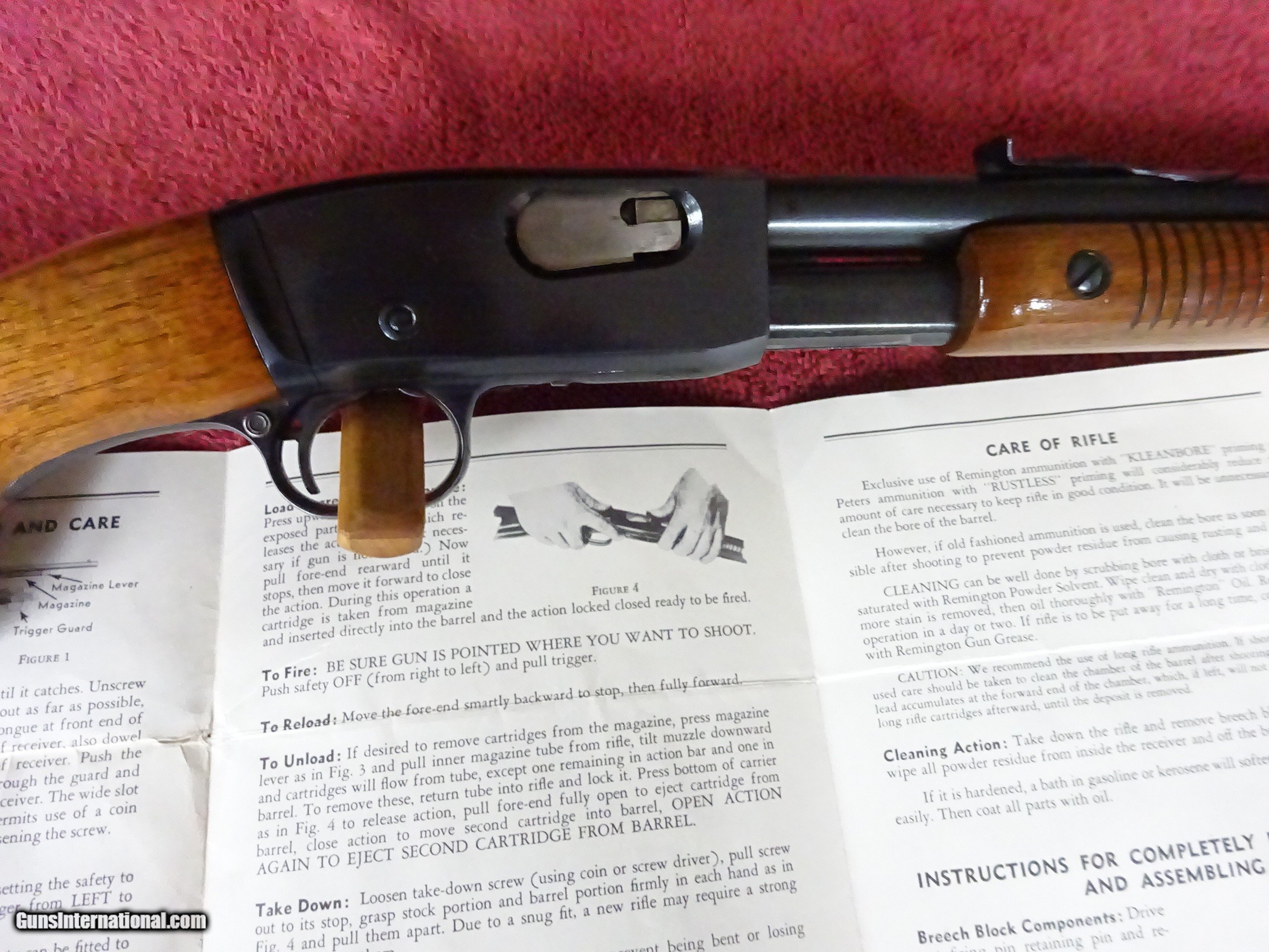 Description: REMINGTON MODEL 121 FIELDMASTER SLIDE ACTION RIFLE, 22 SHORT, LONG OR LONG RIFLE. 24" BARREL, FIXED FRONT SIGHT, STEP ADJUSTABLE REAR SIGHT. MIRROR PERFECT BORE, 100% BRIGHT ORIGINAL BLUE. SMOOTH HALF PISTOL GRIP AMERICAN WALNUT STOCK, RIBBED SEMI-BEAVERTAIL FOREARM, PERFECT REMINGTON MARKED METAL CHECKERED BUTTPLATE. WOOD AND METAL FINISHES ARE FLAWLESS, NO WEAR OR HANDLING MARKS OF ANY KIND. MADE IN 1950. INCLUDES ITS 1950 DATED INSTRUCTION FOLDER. 100% ORIGINAL AS NEW CONDITION. NO BOX. $1275.00 + $70.00 Insured shipping to an FFL address. Layaway is available. See all Pats gun listings on this site! We also have hundreds of ORIGINAL gun company advertising & memorabilia pieces available for sale on our site SPORTINGCOLLECTIBLES. We have no reprints or reproductions. Email for more information. If you need to call, morning or evening is best, and please note the Seller's Inventory number. SOLD Curio/Relic: Yes |