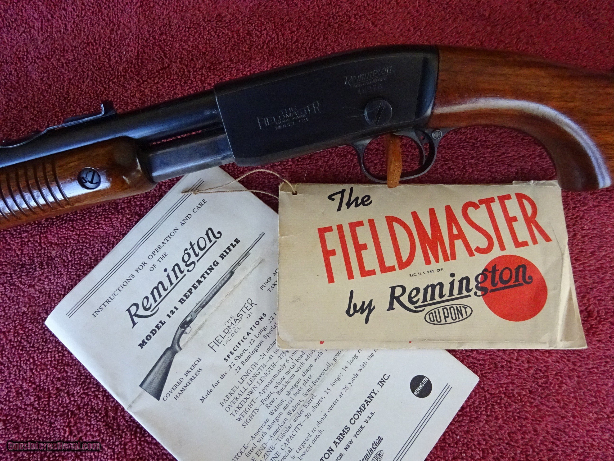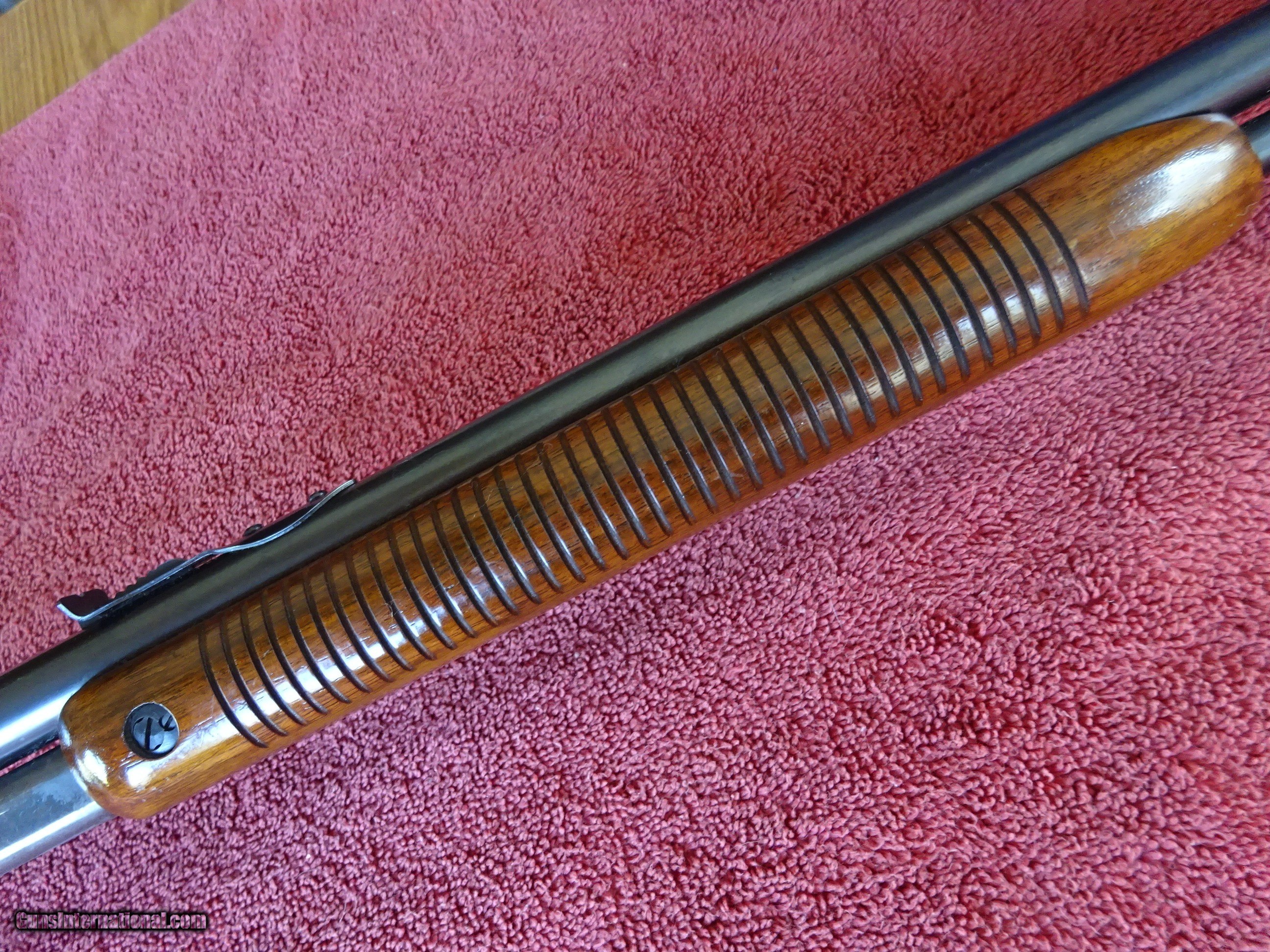 Description: REMINGTON MODEL 121, 22 SHORT, LONG OR LONG RIFLE, SLIDE ACTION RIFLE. 24" BARREL, FIXED FRONT SIGHT, STEP ADJUSTABLE REAR SIGHT, MIRROR PERFECT BORE, 99% BRIGHT BLUE OVERALL. NO EDGE OR MUZZLE WEAR. PISTOL GRIP STOCK, SEMI-BEAVERTAIL RIBBED FOREARM. AMERICAN WALNUT, NEAR PERFECT WOOD FINISH, CHECKERED STEEL REMINGTON MARKED BUTTPLATE. MADE IN 1940. YOU WOULD BE HARD-PRESSED TO FIND A NICER PRE-WAR MODEL 121. 100% ORIGINAL CONDITION. INCLUDES HANGTAG INSTRUCTION ENVELOPE AND 8-PAGE ILLUSTRATED INSTRUCTION FOLDER, NO BOX. $1295.00 + $70.00 Insured shipping to an FFL address. Layaway is available. See all Pats gun listings on this site! We also have hundreds of ORIGINAL gun company advertising & memorabilia pieces available for sale on our site SPORTINGCOLLECTIBLES. We have no reprints or reproductions. Email for more information. If you need to call, morning or evening is best, and please note the Seller's Inventory number. SOLD Curio/Relic: Yes |
