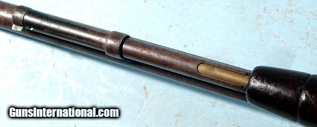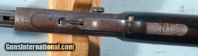Description: REMINGTON UMC MODEL 12 .22LR PUMP RIFLE. Serial number "RW944XX". Factory rear and front sights. Original wood with old lacquer applied whch should clean to excellent. Condition of wood is very good with some old abrasions here and there. Control arm needs to be re engaged with bolt as improperly put back together but all parts present. Cocks and fires. Brass magazine tube plunger in perfect working order. Ithaca Gun Co. hard rubber buttplate fits perfectly. 13" length of pull. Bore is poor with traces of rifling but cant guarentee accuracy. SOLD Curio/Relic: Yes |