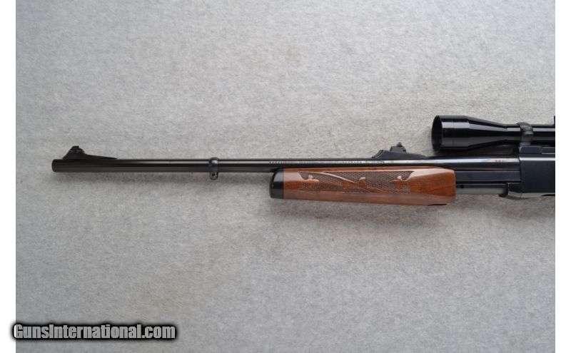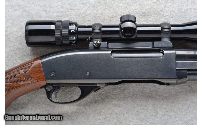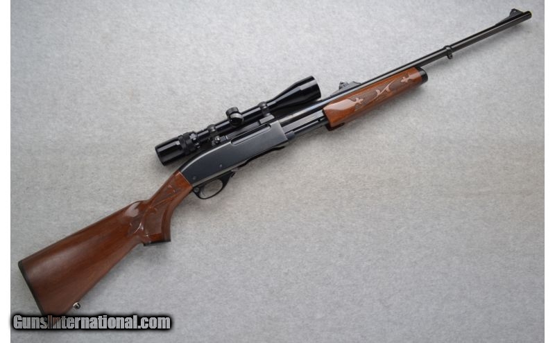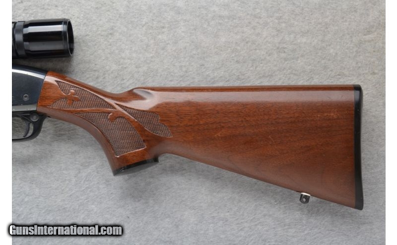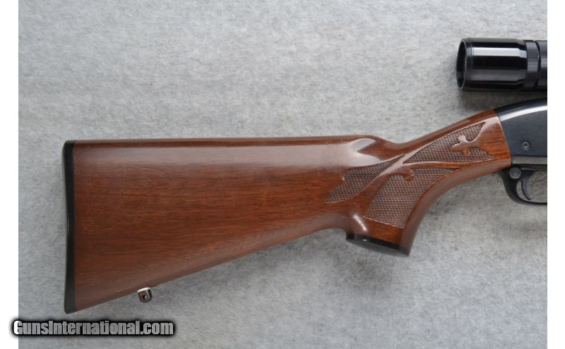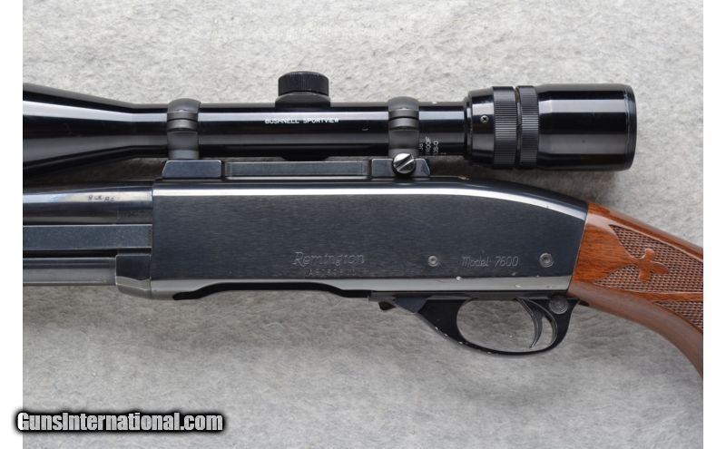 Description: This Remington Model 7600 is a right hand action slide action rifle in .30-06 Sprg. Cal. It has a 22 inch barrel and checkered grip walnut pistol grip stock. Is outfitted with a Bushnell 3x-9x 38mm Scope and has iron sights. In overall good condition it comes as is. No box. SOLD Caliber Info: .30-06 Sprg. Chambers: Detachable magazine. Metal Condition: Good. Has some light wear, handling marks and freckling. Wood Condition: Good. Handling marks. Bore Condition: Very good. Barrels: 22 Inches. Stock: Checkered grip walnut pistol grip with a black cap. Stock Dimensions: LOP 13 3/8 inches. Fore End: Checkered grip walnut with a black tip. Butt Pad: Remington checkered black plate. Weight: 7 lbs. 13 oz. with Scope mounted. Sights: Bushnell Sportview 3x-9x 38mm Scope. Raised front blade. Ramped adjustable notch middle. Item Location: Richfield, WI |