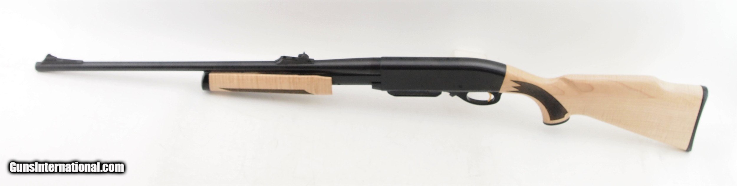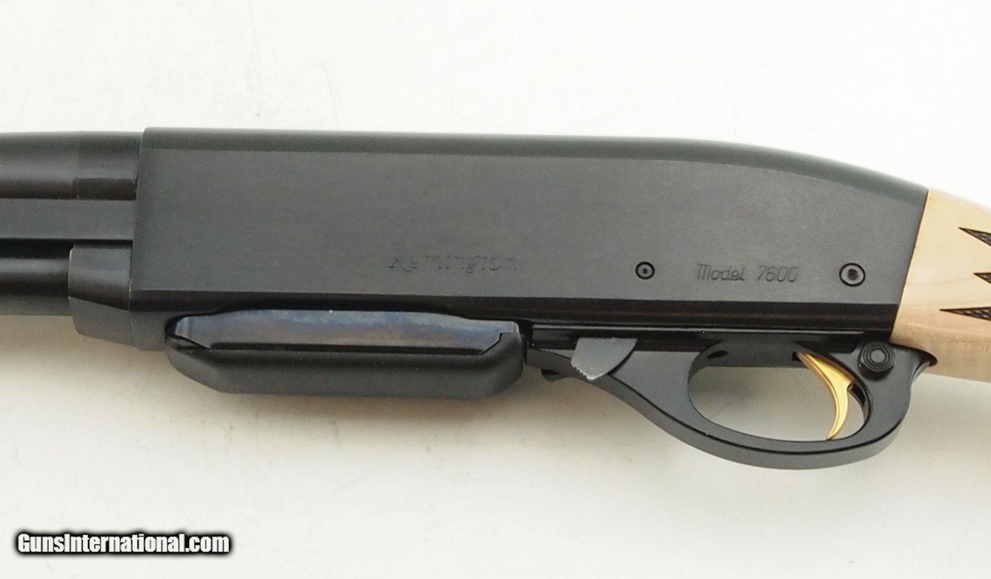 Description: Beautiful Remington 7600 75th Anniversary 1 Of 250 .257 Roberts WBox, never fired, 22" bbl, adjustable rear notch sight, white bead front sight, high gloss checkered Maple grip stock - forearm, black grip - forearm caps, gold trigger, and one 4 round removable magazine. See pictures for an appreciation of this rifle. Add 3% for Credit Card Shipping $40.00 SOLD |