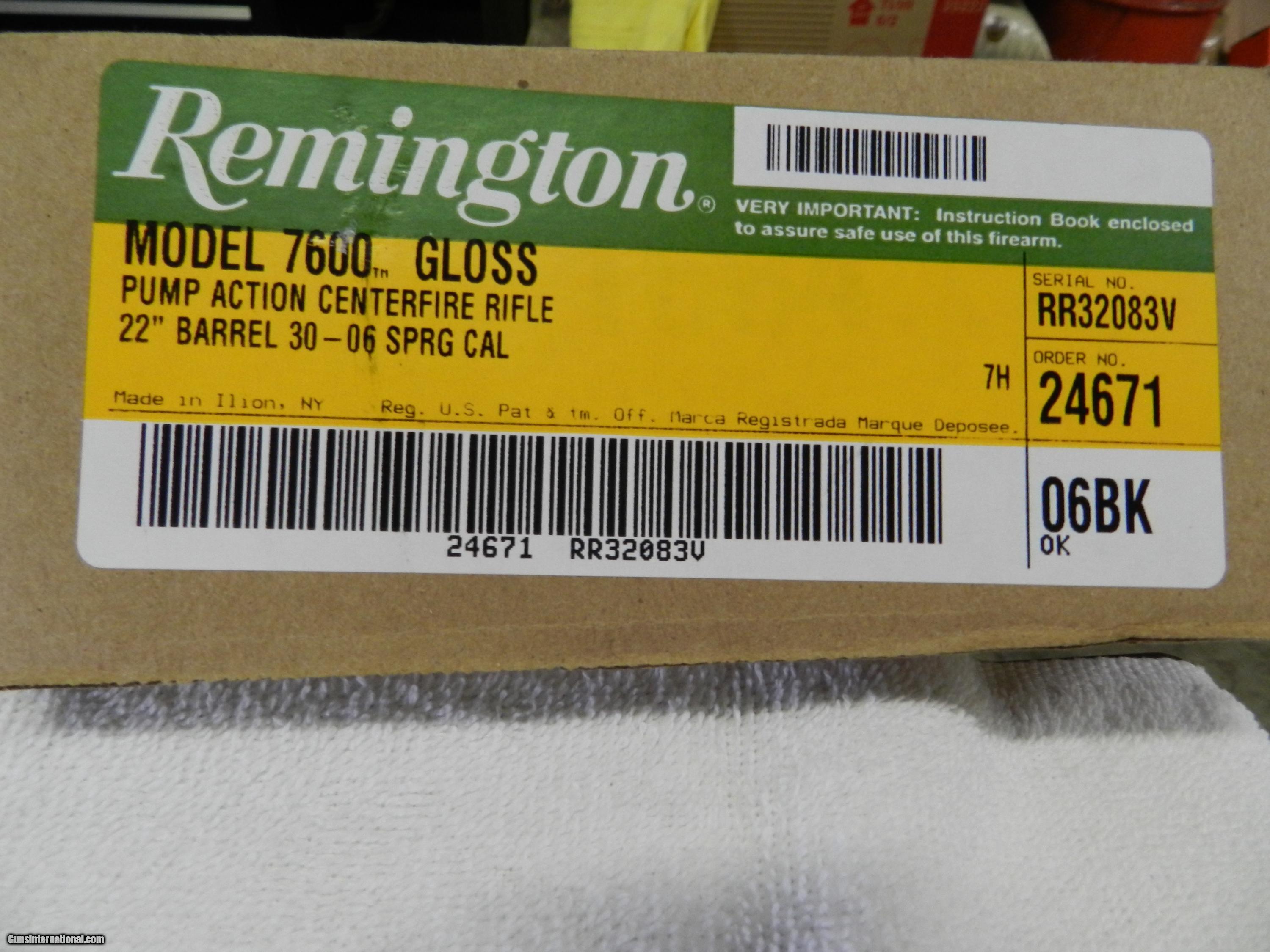 Description: N.I.B. Remington 7600 High Gloss 30/06 Pump Rifle. SOLD Manufacturer: Remington Model: 7600 High Gloss Serial Number: RR32083V Caliber Info: 30/06 Condition: New Metal Condition: New Wood Condition: New Bore Condition: New Barrels: 22 Action: Pump |