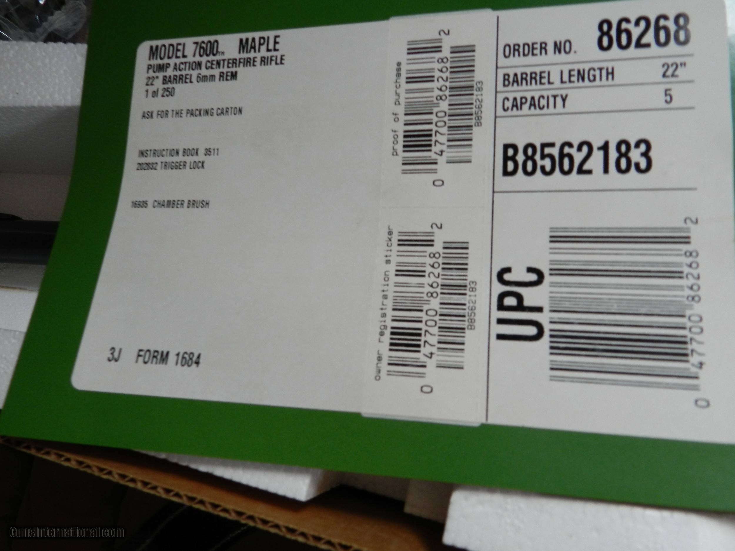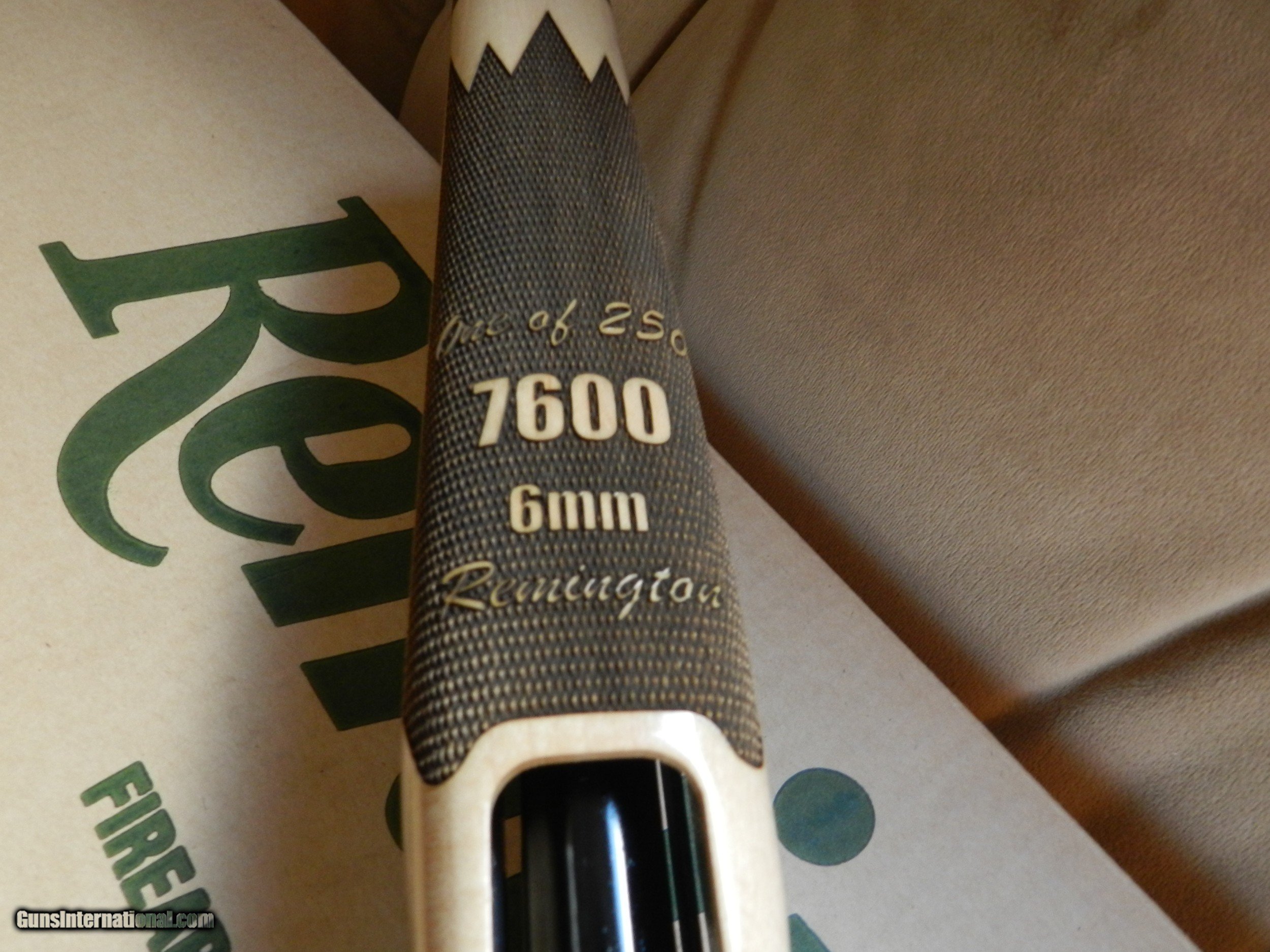 Description: N.I.B. Remington 7600 Maple in 6mm Caliber (1 of 250) Produced in 2005. Never used and in the Original Box with all Paperwork. E-Mail or Call me with any questions or concerns. SOLD Rifle Caliber: 6mm Remington Manufacturer: Remington Model: 7600 Maple Serial Number: B8562183 Barrel Length: 22 Condition: N.I.B. Metal Condition: Shiny Wood Condition: Excellent Bore Condition: Shiny |