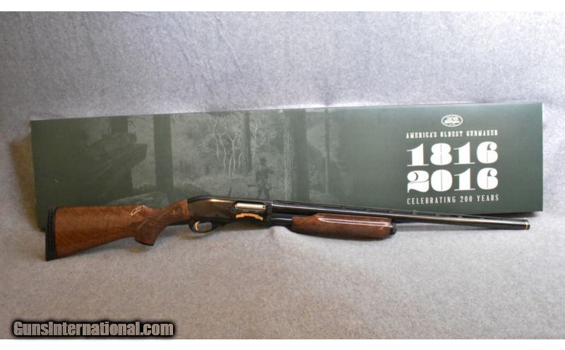 Description: Celebrating Remington's 200th year as America's Oldest Gun Maker (1816-2016) , comes this Limited Edition engraved 1 of 2,016 classic Model 870. Featuring a luxurious, sculpted 24 karat gold inlay portraying the founder, Eliphalet Remington, walking with his first forged barrel. Commemorative Bicentennial box with a historical Remington timeline and a certificate of authenticity. Medallion in grip, Classic American Style Engraving and Gold Inlay, special serial number. SOLD Manufacturer: 2016. Caliber Info: 12 Gauge. Chambers: 3 inch. Metal Condition: Excellent, small spot of gold removed off Bicentennial banner on right side of receiver. Wood Condition: Excellent, like new. Bore Condition: Bright and shiny. Barrels: 26 inch light contour vent rib. Triggers: Single grooved trigger. Stock: C-Grade High Gloss walnut stock with Fleur de Lis checkering. Stock Dimensions: 14 inch LOP. Fore End: C-Grade High Gloss walnut with Fleur de Lis checkering. Butt Pad: Remington branded black rubber pad. Weight: 7 lbs 9 oz. Sights: White bead front and steel bead mid on vent rib. Chokes: Cylinder, Full and Improved cylinder. Extras: Comes with commemorative box and accessories. Item Location: Kansas City, KS |