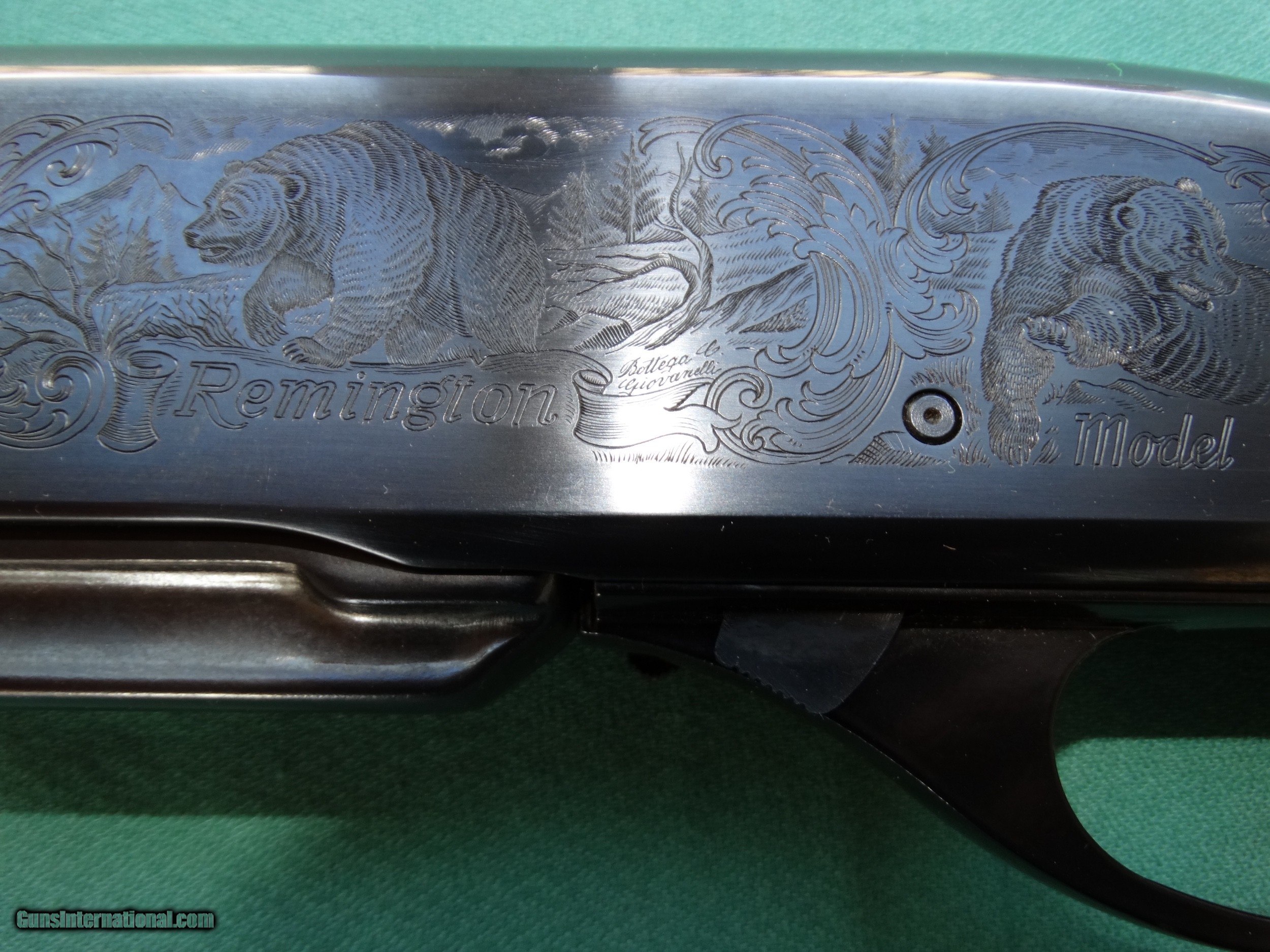 Description: Remington factory gun. This is a model 7600 chambered in .30-06 and hand engraved by Giovanelli and says Bottolo C Giovanelli right above the Remington scroll. This gun came from a Remington factory rep that exhibited at all the major gun trade shows. This has no conventional serial number or barrel stamps. It does have the customary factory warning and caliber roll stamping on the barrel and the R in triangle. The engraving, as told to me by the former rep, was the pattern for the fine line roll engraving Remington did on their pump and semi-auto rifles. As you can see, the wood has the high gloss finish. The gun is unfired. I don’t clean guns before I sell them, and, as you can see, there is some dirt and old oil on the muzzle end of the barrel that will clean right off. This gun will clean to new. Feel free to make an offer. Visa, MasterCard, Discover and AmEx accepted at no additional charge. SOLD Rifle Caliber: .30-06 Springfield |