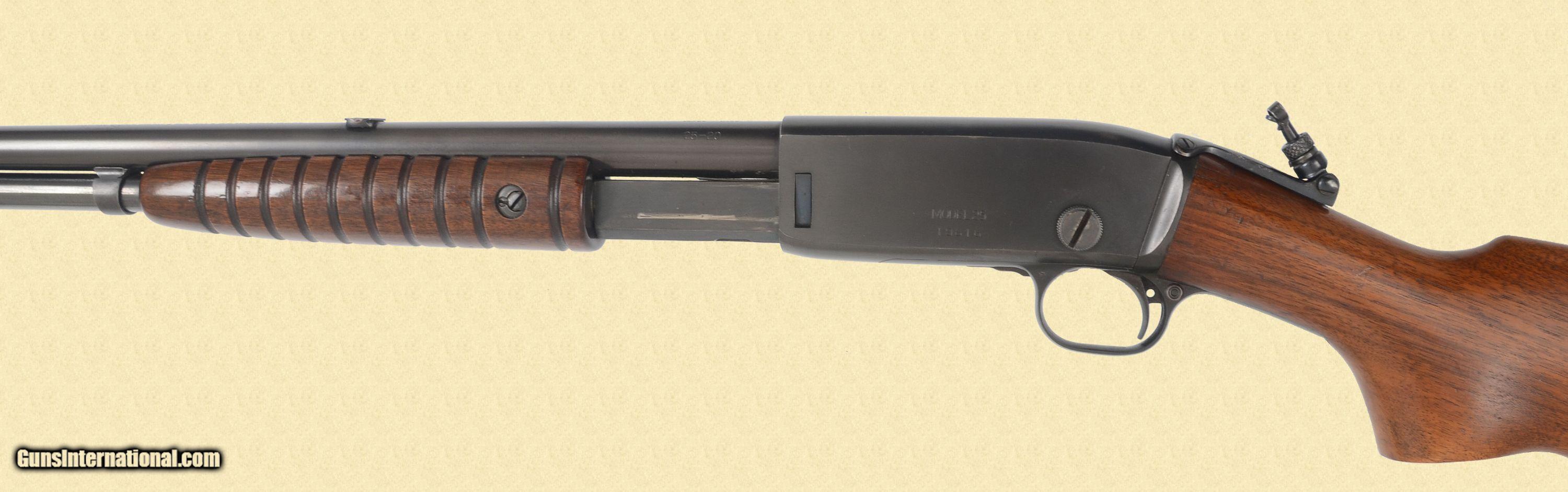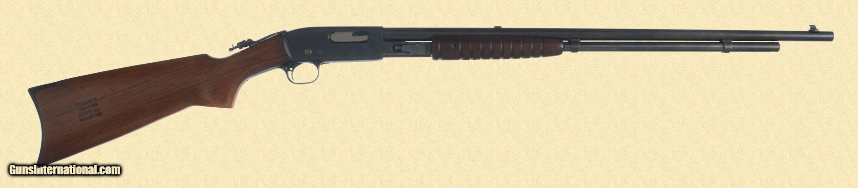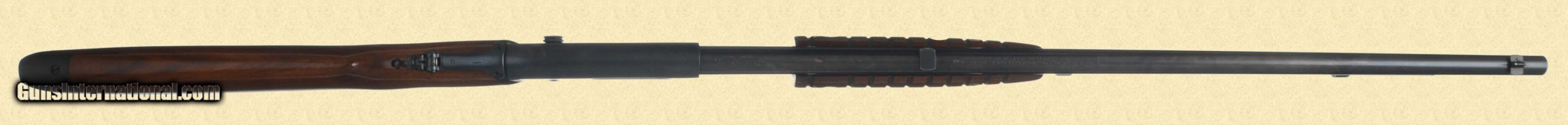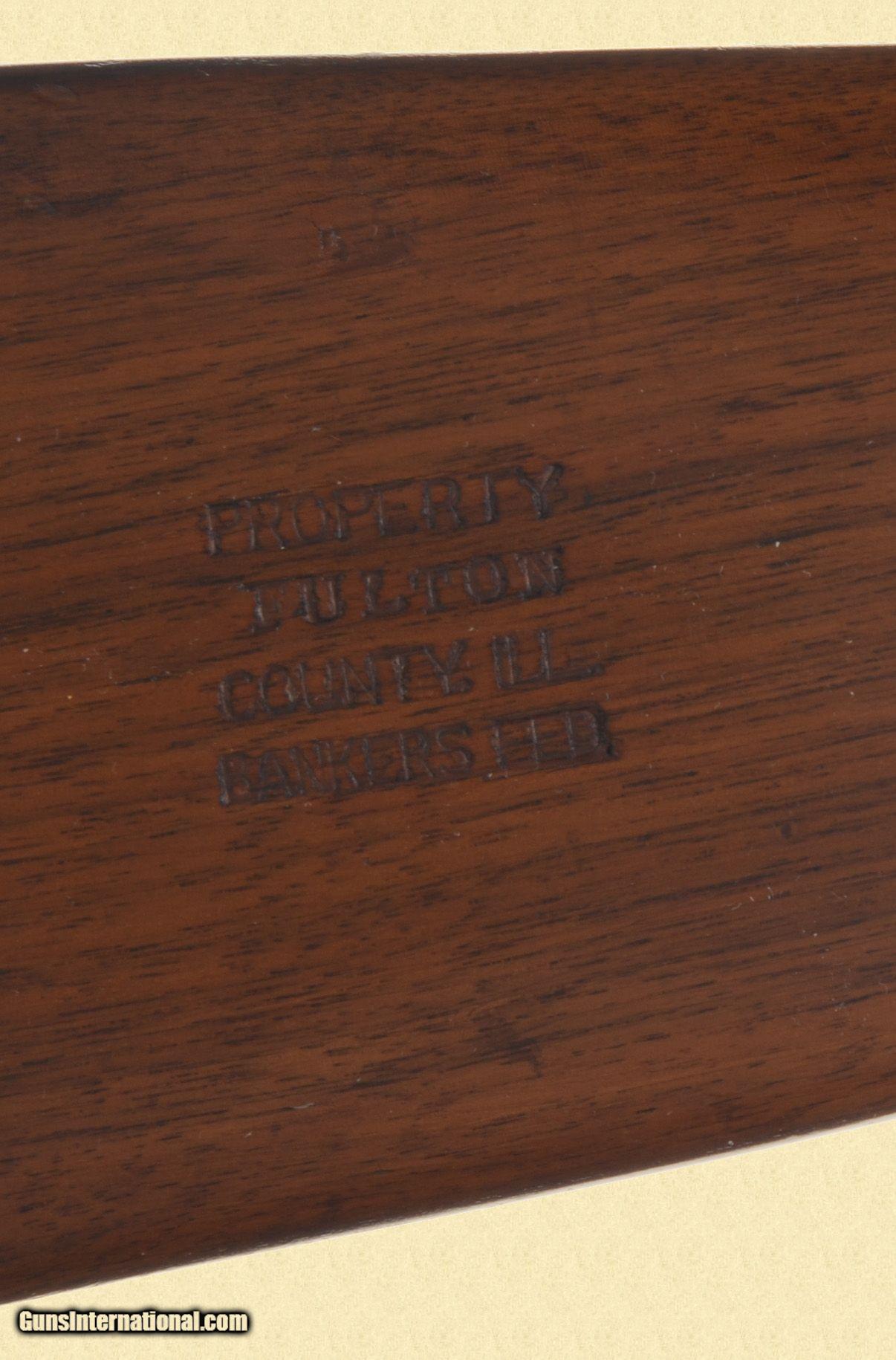 Description: 25-20 WCF; 95% blue, excellent bore, good stock, 24'' barrel, Original blue finish and walnut stock. Tube magazine fed slide action repeating rifle, manufacture date code XU (1927). The right side of the stock is stamped "PROPERTY/FULTON/COUNTY, ILL./BANKERS FED.". Round barrel with beaded fixed front sight, rear sight dovetail with block, Lyman adjustable peep sight installed on the upper receiver tang. The metal and wood show light wear and handling. The wood is overall excellent however there is a small area of wood split and beginning to lIft behind the receiver and along the tang on the left side. Mechanically fine with a clean sharp bore. SOLD Curio/Relic: Yes Serial Number: 19616 |