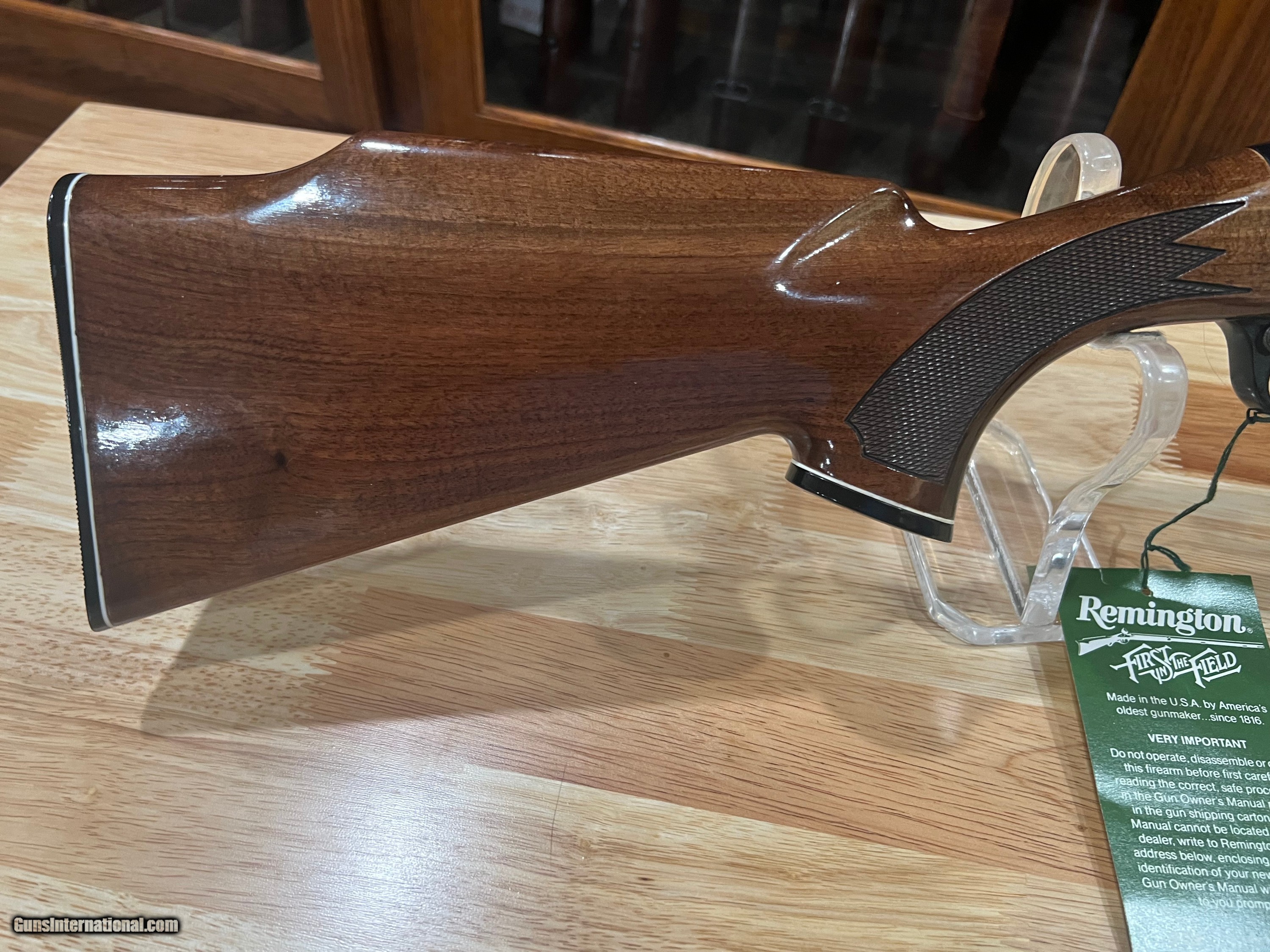 Description: Here's a hard to find Remington Six 6mm Rem, 22" barrel, open sights, monte carlo stock, nice wood ebony forend tip and pistol grip cap, plastic butt, new and unfired in it's original box, limited production! 75.00 UPS shipping 2.99% credit card fee PA residents add 6% sales tax. SOLD Rifle Caliber: 6mm Remington |