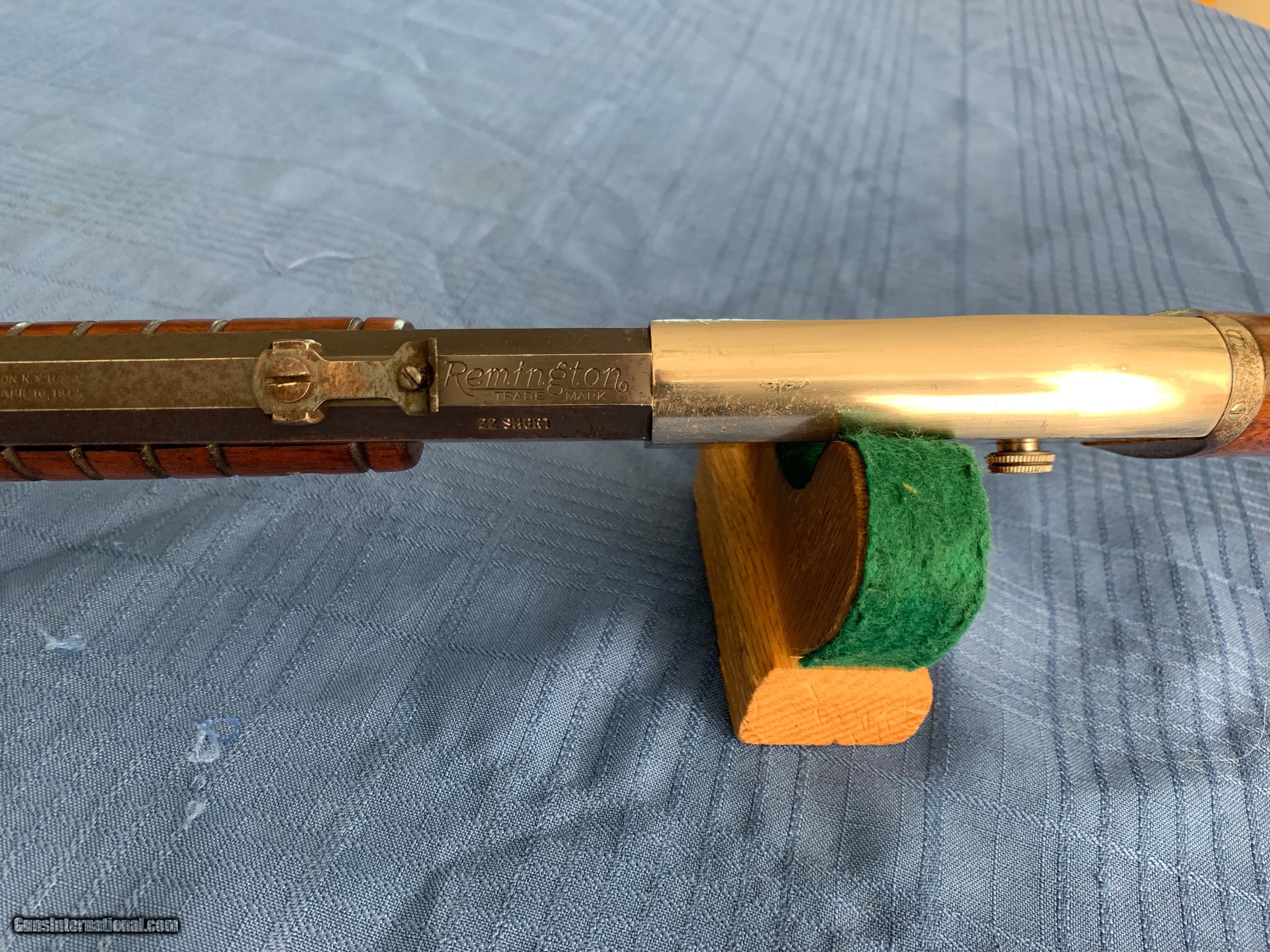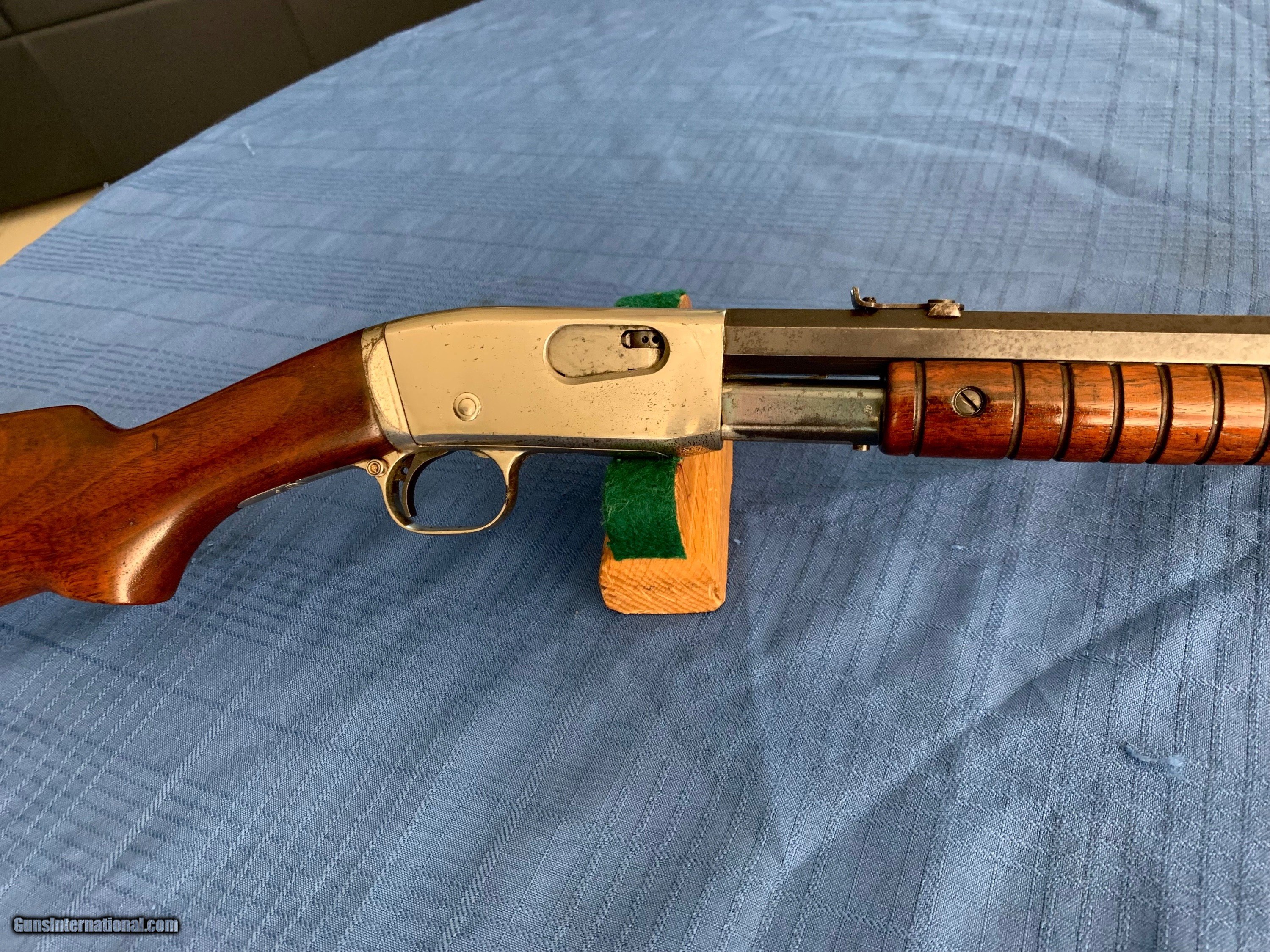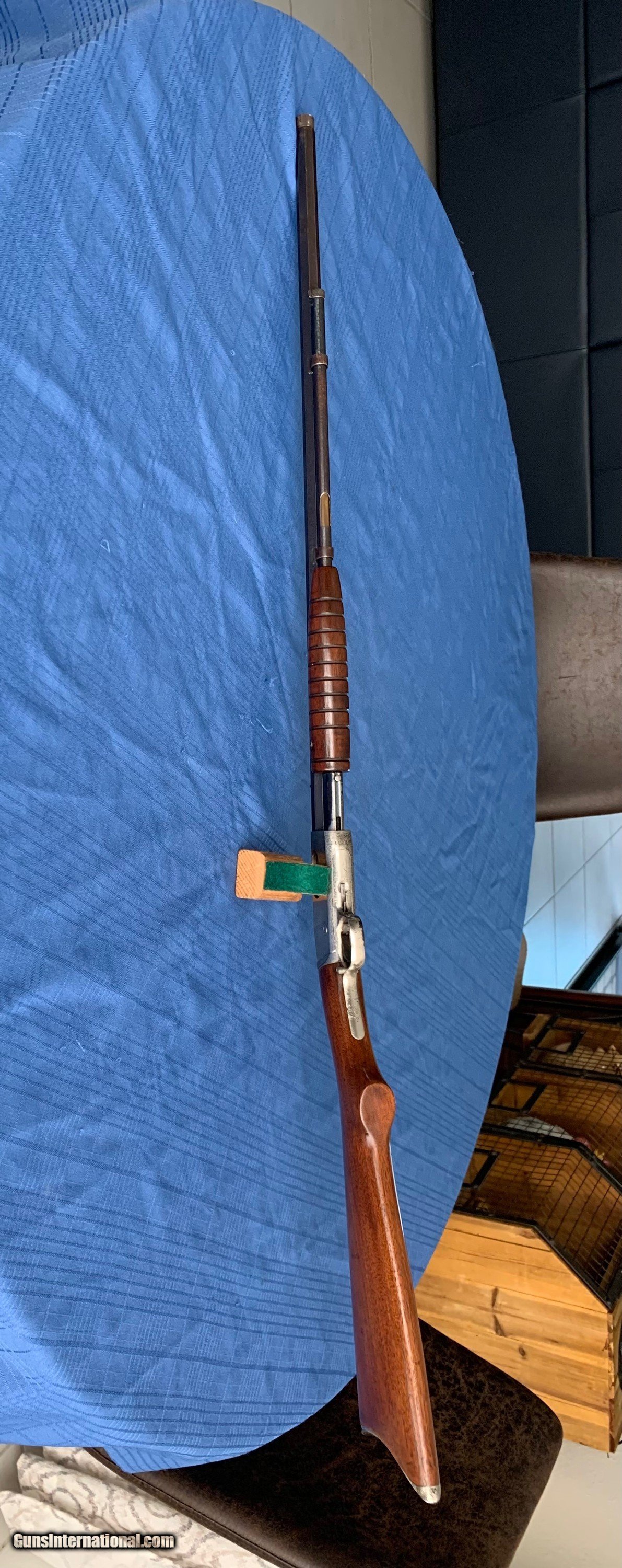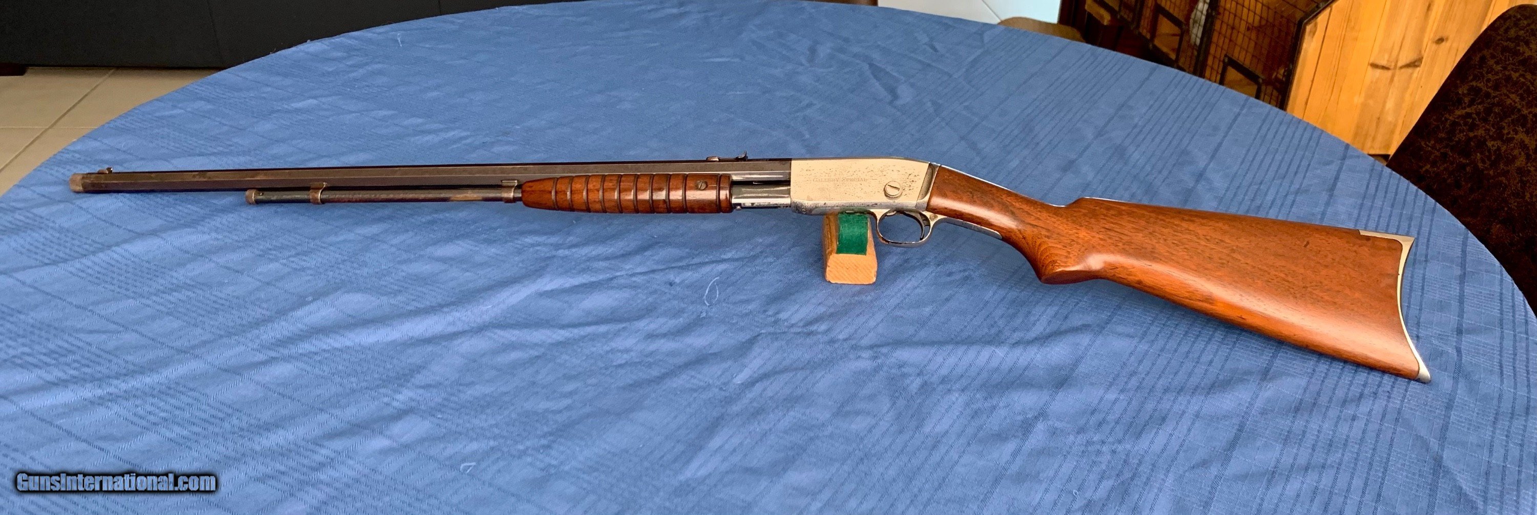 Description: Heres a excellent example of a Remington pump rifle in 22 short only ! Gallery Special model ! Serial number 21245. Special order threaded for a factory silencer ! Silencers where legal up untill the 1950's. You could special order one at Remington Co. Special Order Factory Nickel finish ! Most all of the nickel still remaining on the frame and butt plate ! Barrel and tube are blue ! Gun has all of its original blue turning a blue brown patina. Walnut stocks are in very good original condition ! Bore and mechanics are excellent! Gun is in excellent working condition . Please review my photos and please email with any questions ? 3 day inspection as allways! Thank you for looking, Little Jo SOLD Antique: Yes Rifle Caliber: .22 Short Manufacturer: Remington UMC Model: Gallery Special Serial Number: 22245 Condition: Excellent