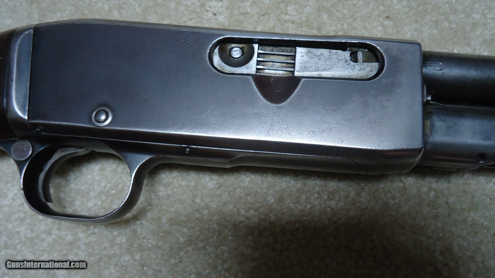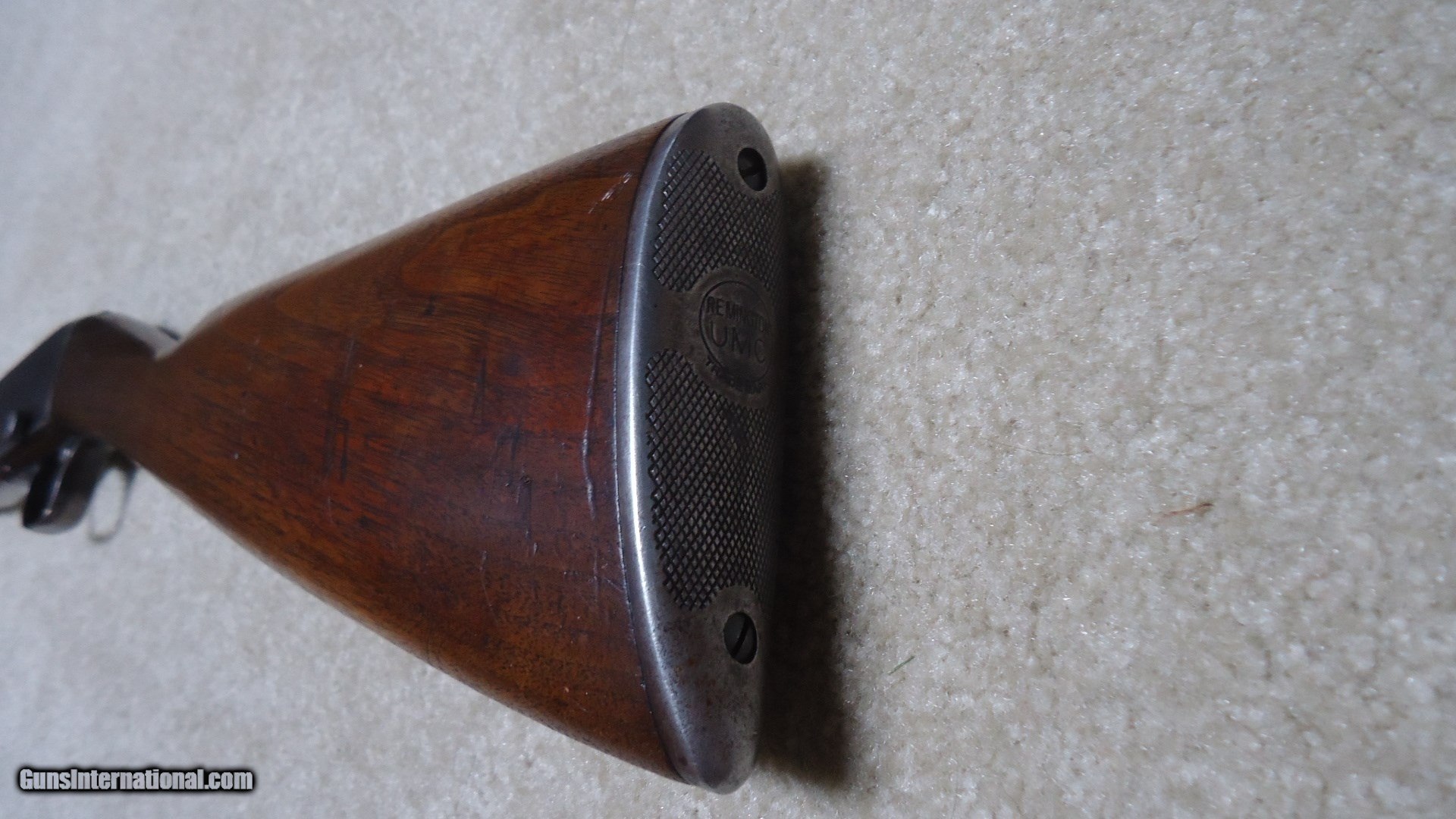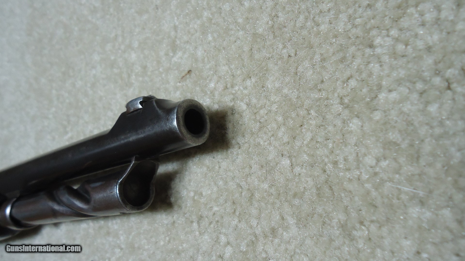 Description: VERY SELDOM SEEN MODEL 14R 18 ½” CARBINE, STRAIGHT GRIP PUMP RIFLE IN .32 REMINGTON CALIBER WITH THUMBNAIL SAFETY! This model was introduced in 1912 and manufactured through 1934. The thumbnail safety was introduced in 1918 and the Model number was added to the barrel in 1920- since this one does NOT have the model number on the barrel it is probably safe to assume it was made between 1918 and 1920.Typical M-14s have 22 inch barrels and pistol grip stocks. The carbine version is quite rare. This one came out of here in Montana and no doubt has lots of history in it- probably used as a saddle gun! The receiver blue shows wear at the lower front area balance point with the balance on the sides and top being fine, but aged dull blue. The barrel also shows fine aged blue with wear just ahead of the receiver from handling. It retains the scarce and desirable original “wheel adjustable for elevation” rear buckhorn sight with a small blade/bead front sight in the correct integral ramp. Fine forend shows normal handling but is solid. Butt stock retains the original Remington marked steel butt plate and is in fine condition with only a couple of the usual minor tiny age cracks coming back from the top of the receiver and lower tang that go nowhere and are typical for this model. Sharp markings, tight action, thumbnail safety pulls up and down correctly in the ejection port, exc. bore. One of the more difficult of the Pre-War Remington models to locate. SOLD Curio/Relic: Yes Manufacturer: REMINGTON Model: 14R CARBINE Serial Number: C 73XXX Caliber Info: .32 REM. Condition: FINE Barrels: 18 1/2 |