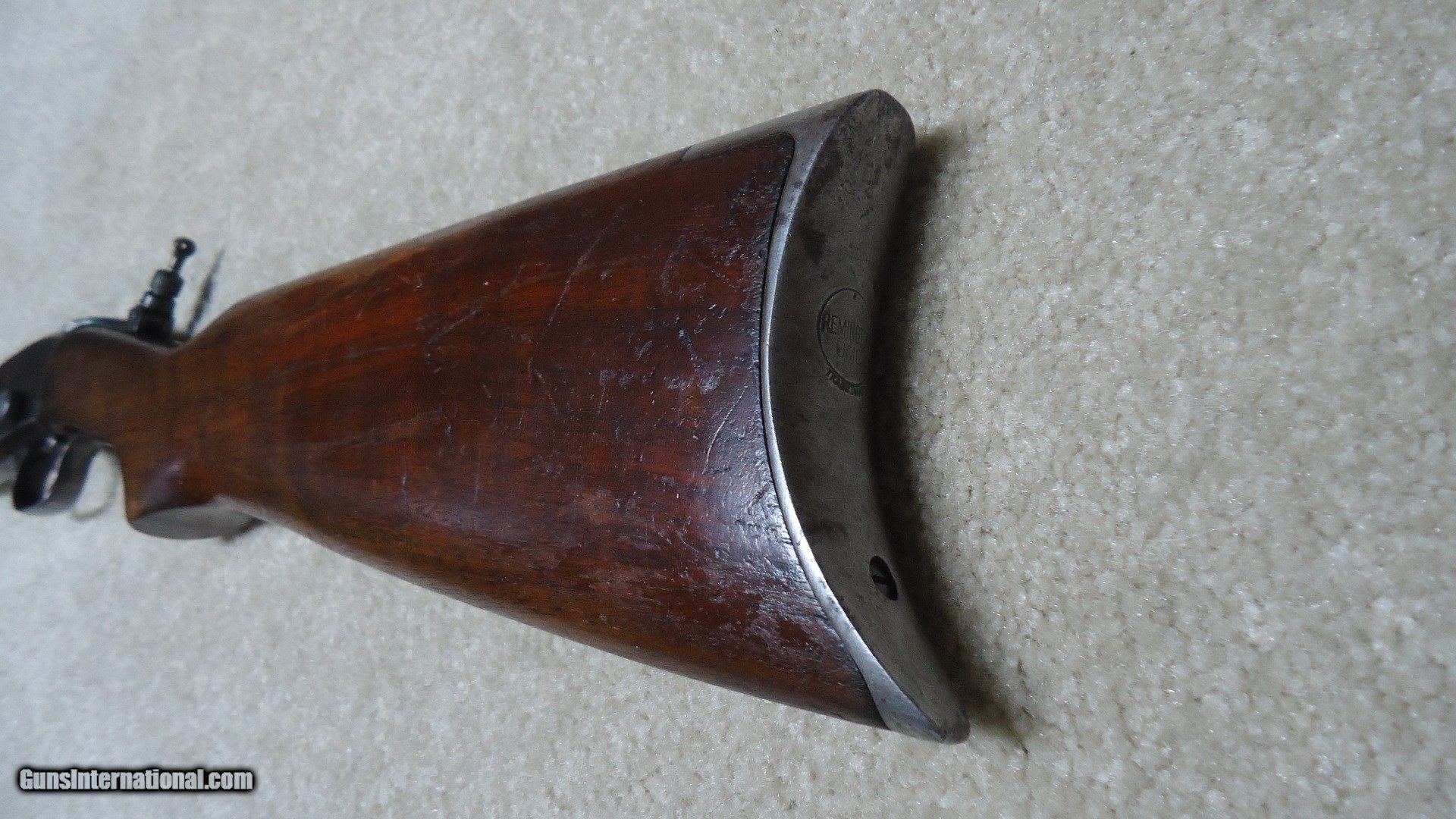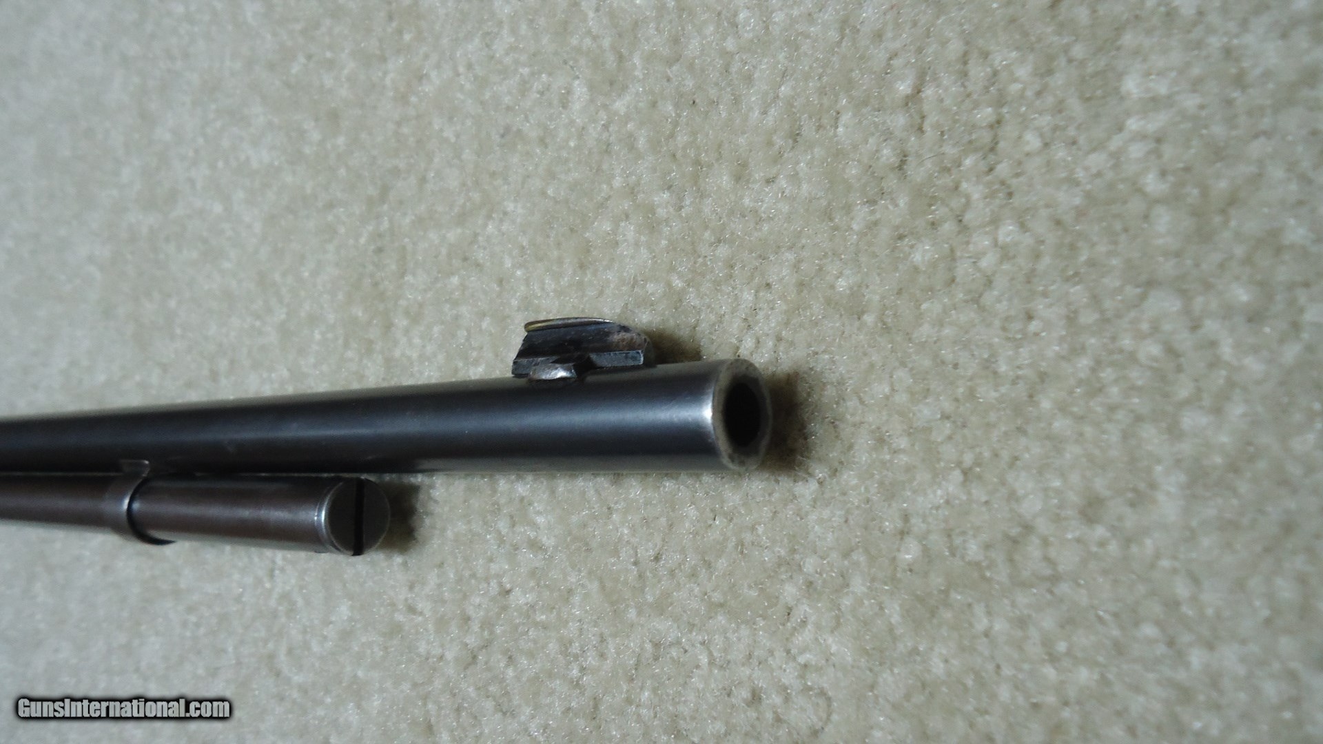 Description: MODEL 25 PUMP RIFLE IN DESIRABLE .32-20 CALIBER, #3190, MADE 1923-1936. These fine little takedown pump rifles were made in .25-20 and .32-20 with the latter being more difficult to find these days. This example is fitted with the correctly mounted Lyman receiver sight paired with a Sheard marked Marble long blade/bead front sight. The rear barrel dovetail is empty. Barrel retains fine slightly aged blue with excellent markings, mag tube more gray/brown. The receiver shows good blue overall with normal wearing to silver toward the lower front corner and bottom as well as the portion of the barrel directly ahead of the receiver. Fine solid forend and butt stock without any chips or cracks. Correct crescent butt plate. Stock looks a bit dry where the original stock finish has worn/flaked. Exc. bore and action. Overall a very nice appearance with a scarce Lyman sight made especially for this model. SOLD Curio/Relic: Yes Manufacturer: REMINGTON Model: MODEL 25 Serial Number: AA 3XXX Caliber Info: .32-20 Condition: FINE+ Barrels: 24 |