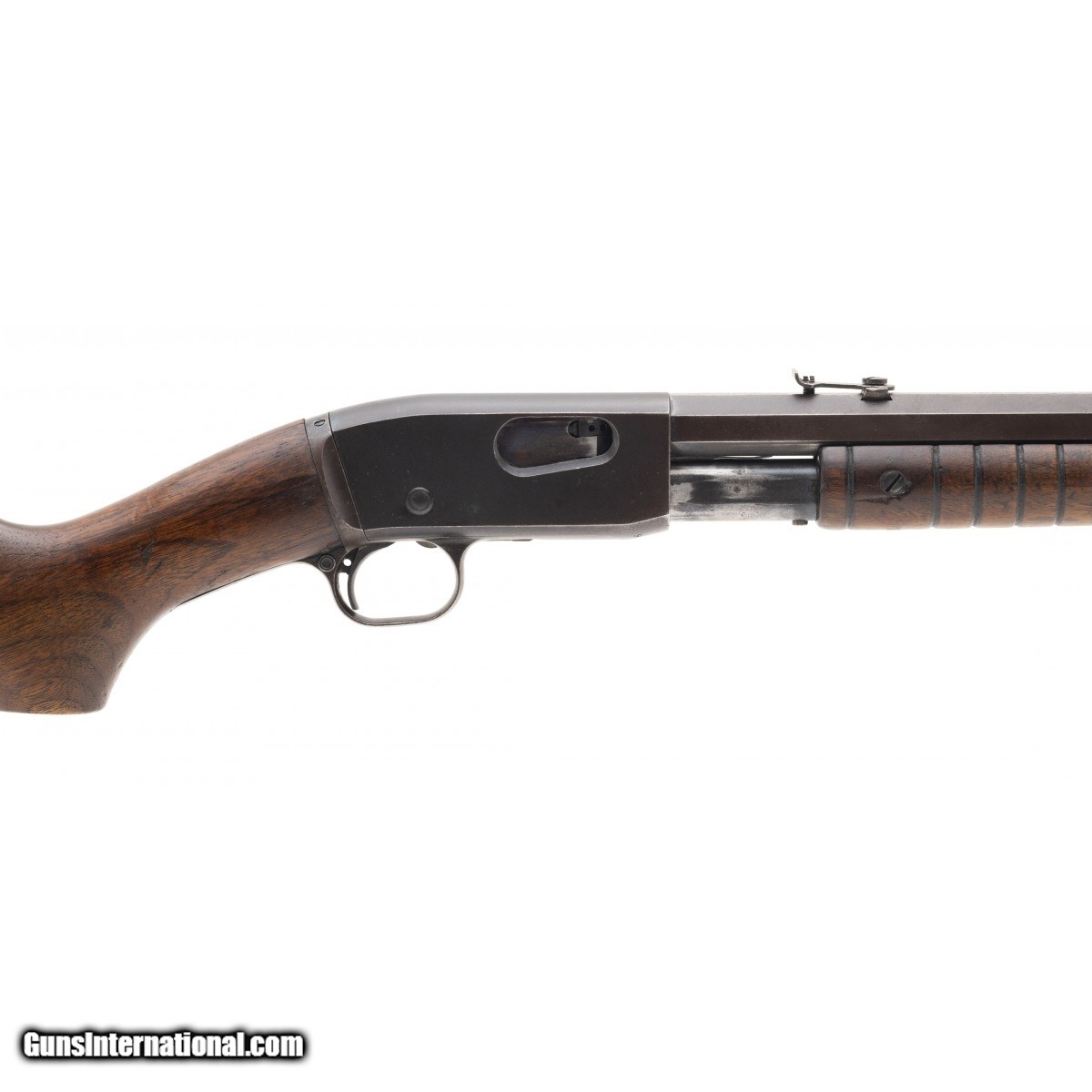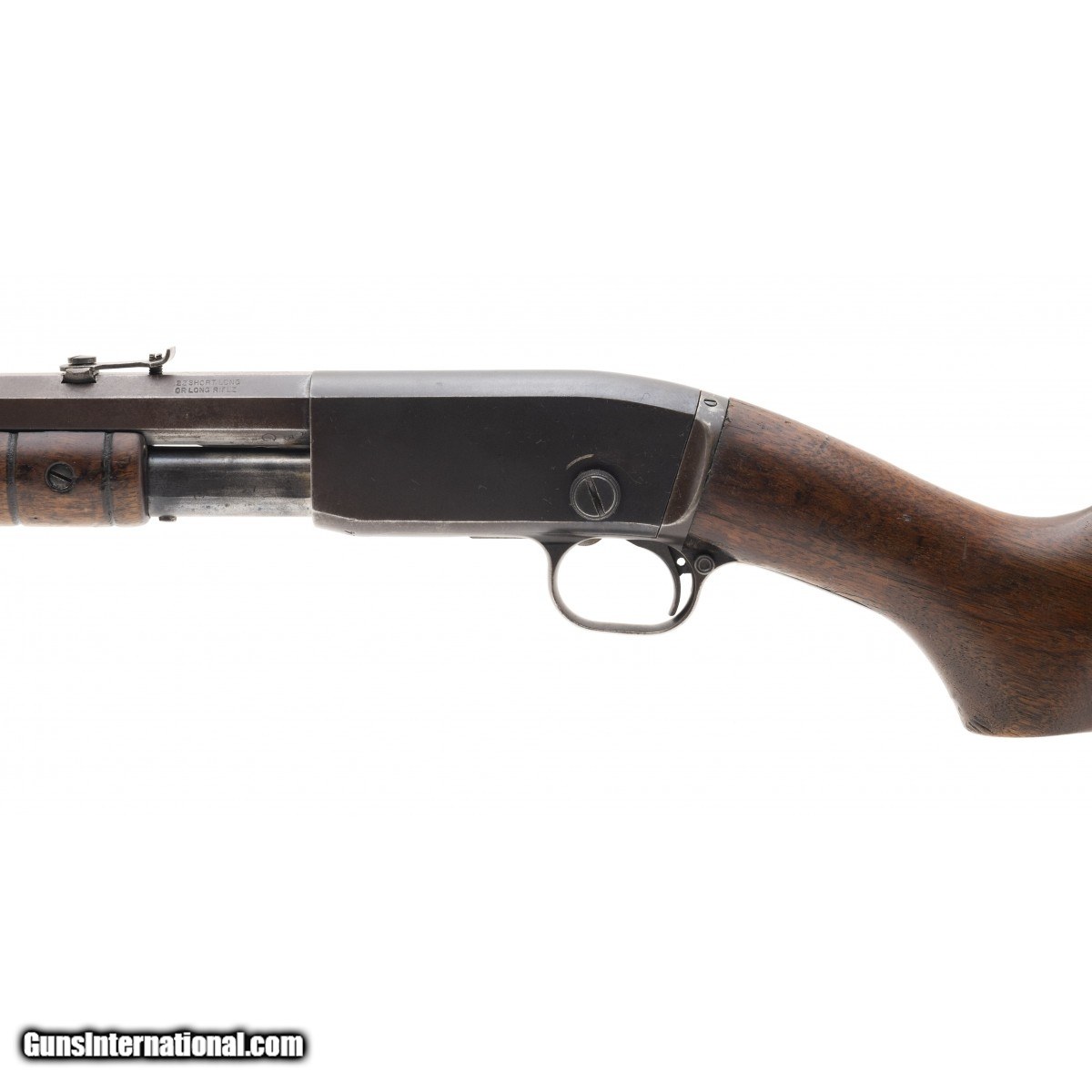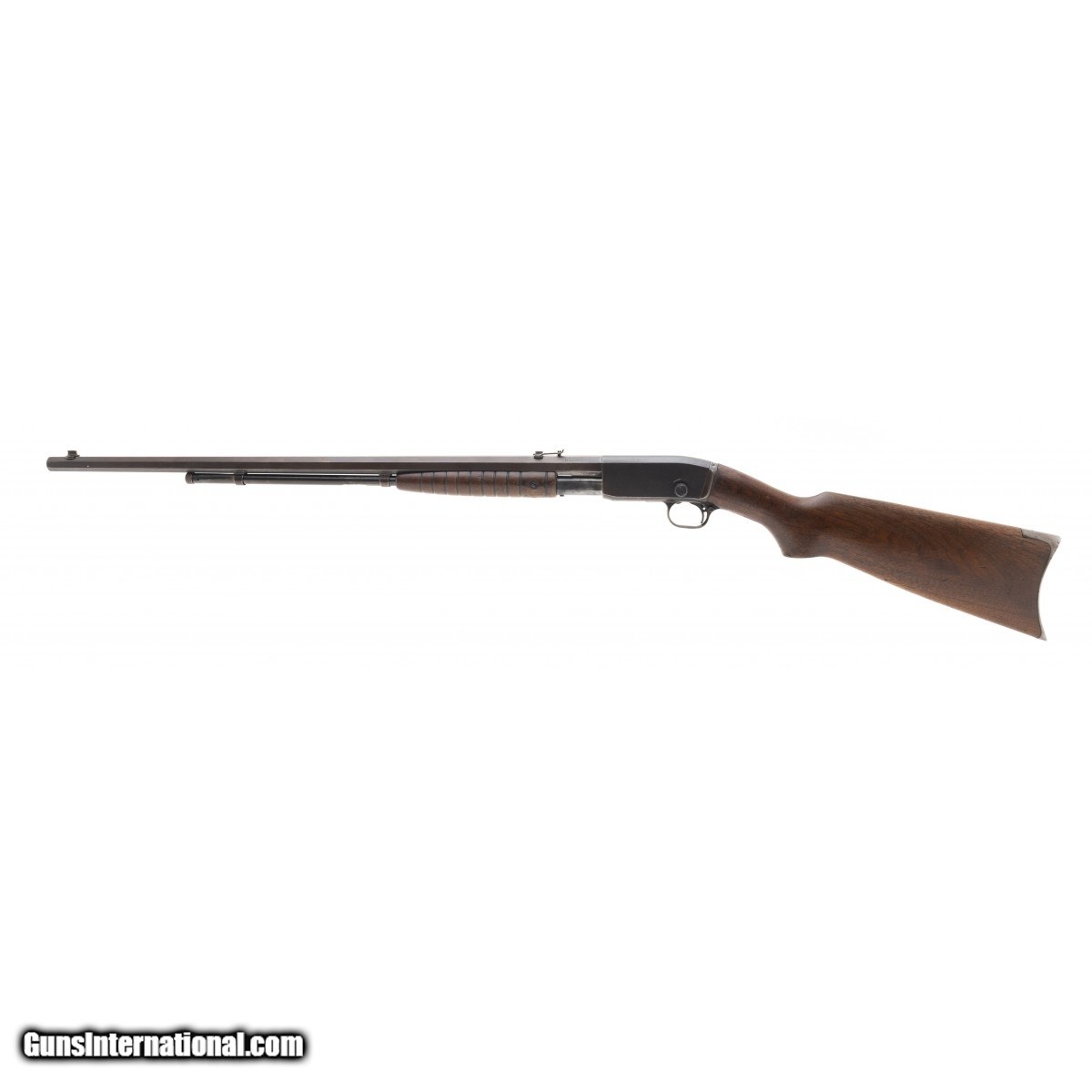 Description: " Early hammerless pump action rifle. Bore has strong rifling with some pitting. Metal is turning a brown patina. Stock has a crack that will need repair near wrist. Action works properly. Fair overall condition. SOLD |