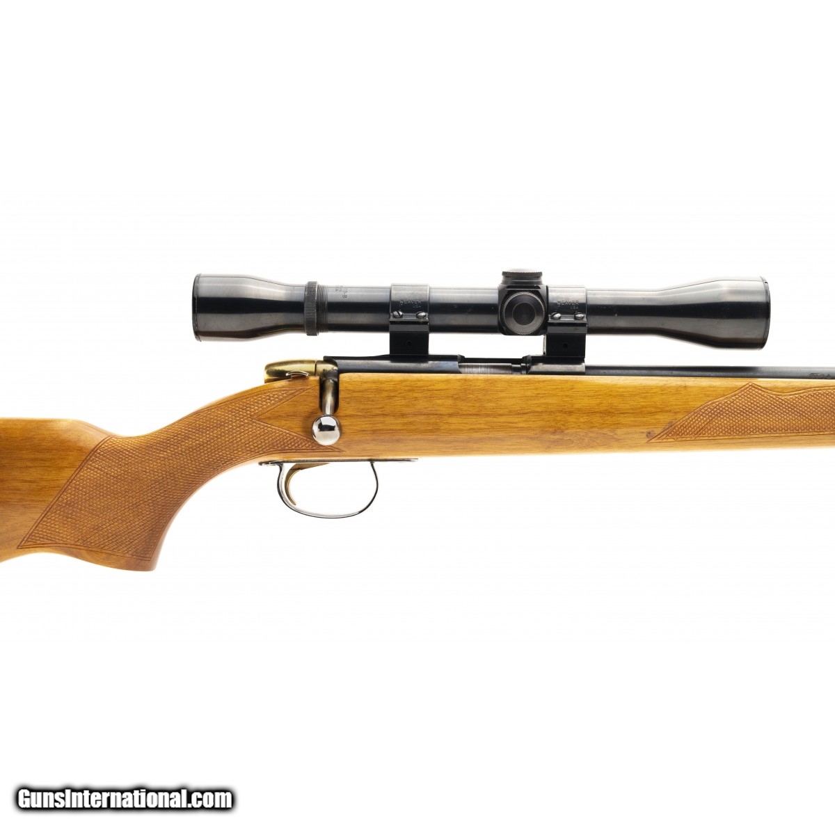 Upgraded ""deluxe"" bolt action rifle with gold plated parts and custom checkered stock. Looks really good. Has a Weaver K4 scope.