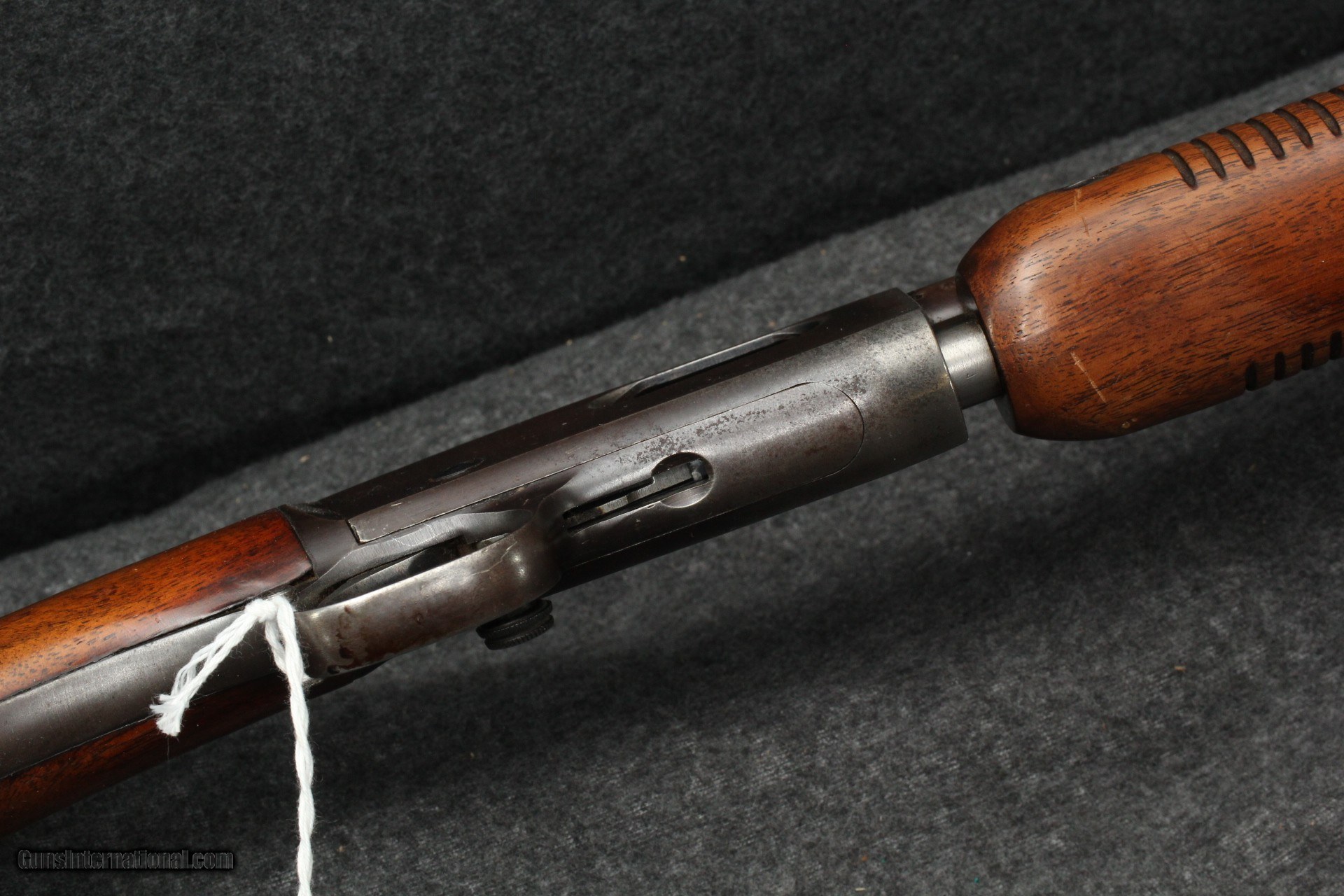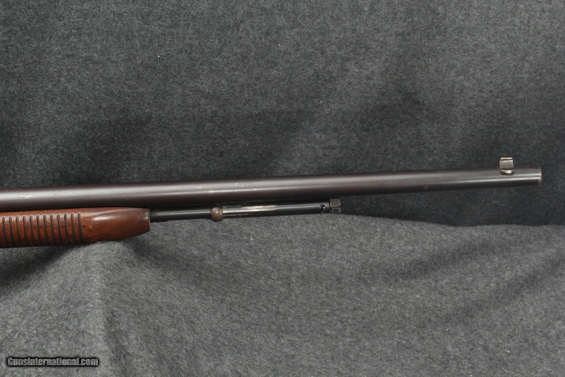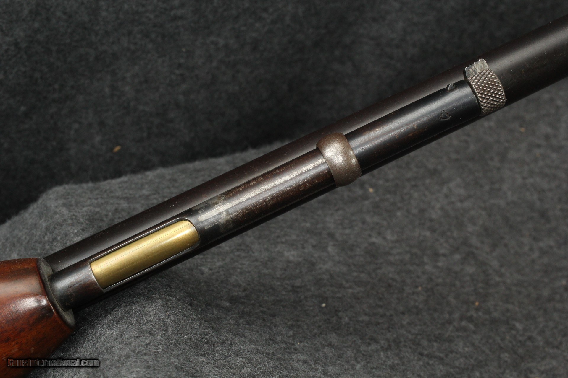 Description: 22 WRF or Special (not 22lr or magnum). Serial number 55XX. Appears all original, except rear sight is King's full buckhorn. 24" barrel. Shows high percentage blue turning to plumb with wear marks at normal wear points. Receiver retains 70% plumbed blue with rust frecking throughout. Bore is excellent. Buttstock shows extensive minor marring and moderate finish loss, no cracks or large marrs. Forend shows minor marring, overall hunting wear/use. Excellent mechanical. No wobble in takedown. Will ship to C&R. More photos on request. Please add $45.00 for shipping and insurance. SOLD Curio/Relic: Yes Rifle Caliber: .22 WRF |