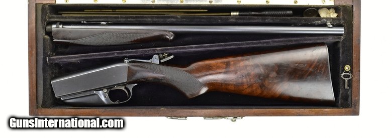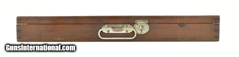 Remington 24 .22 Short caliber rifle. Special grade with factory checkered upgrade fancy stock. This rifle has the empty cartridge reflector under the frame. This is a scarce model and is in excellent condition. Bore is mirror bright with perfect rifling. Gun has 98-99% blue. Checkering is original and excellent. Gun has a Remington folding rear sight and comes with an extra diopter. We have never seen a factory case for a model 24 but this may be one. Excellent quality work, lined in purple velvet (with some repair to the velvet at the muzzle and at the breech). Fits tight so the velvet frayed a bit. Comes with four-piece cleaning rod. Case key is fastened to a spring grip arrangement so as not to lose the key. “22-Short lesmok or smokeless” on barrel. All numbers are matching. In all a fine cased set and deluxe model 24 .22 Short.