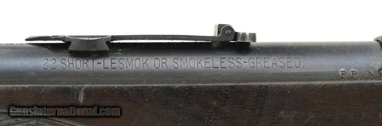 Description: Remington 24 .22 Short caliber rifle. Special grade with factory checkered upgrade fancy stock. This rifle has the empty cartridge reflector under the frame. This is a scarce model and is in excellent condition. Bore is mirror bright with perfect rifling. Gun has 98-99% blue. Checkering is original and excellent. Gun has a Remington folding rear sight and comes with an extra diopter. We have never seen a factory case for a model 24 but this may be one. Excellent quality work, lined in purple velvet (with some repair to the velvet at the muzzle and at the breech). Fits tight so the velvet frayed a bit. Comes with four-piece cleaning rod. Case key is fastened to a spring grip arrangement so as not to lose the key. “22-Short lesmok or smokeless” on barrel. All numbers are matching. In all a fine cased set and deluxe model 24 .22 Short.