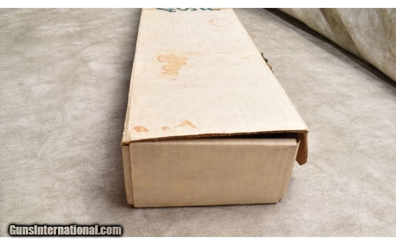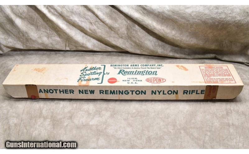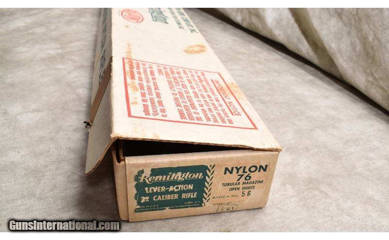 Description: The Nylon 76 is unique for several reasons, not the least being the only lever action that Remington produced, and the use of Delrin as the stock material. This one has a couple of handling marks on the stock but otherwise pristine and does not appear to have been fired. .22 Long Rifle SOLD Chambers: 14 round tubular magazine Metal Condition: Like New in the Box. Wood Condition: Like New in the Box. Bore Condition: Like New in the Box. Barrels: 19-5/8 inches Triggers: Factory trigger Stock Dimensions: 13-5/8 inch LOp Fore End: Mohawk Brown Dupont Delrin with heat shield Butt Pad: Black Delrin Weight: 4 lb - 4 oz Sights: "Large blade with white dot, adjustable notch rear sight, grooved for scope. Item Location: Rogers |