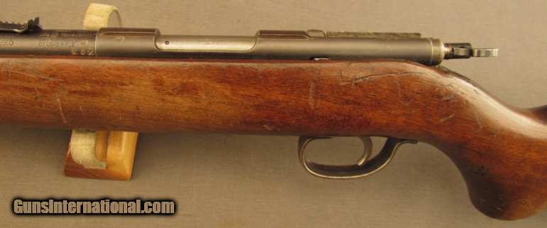 Description: S#100796, 22 S, L +LR 24 inch barrel, bright very good bore. This rifle was built from 1936 to 1940. Features include tube magazine and wing safety on bolt. Barrel and receiver show numerous British proofs, this may have been a lend lease gun. Metal surfaces retain 60% blue, fading brown in places, with evenly scattered tiny oxidation stains and a few dings and scratches. Stock is sound with many marks and about 60% finish. Butplate is worn and has a "Remington" in circle. Rifle still has original sights. An interesting pre-war sporting rifle with neat British proofs. FFL or C+R SOLD Manufacturer: Remington Model: 341 Serial Number: 100796 Caliber Info: 22 S, L+LR Gauge Info: 22 S, L+LR |