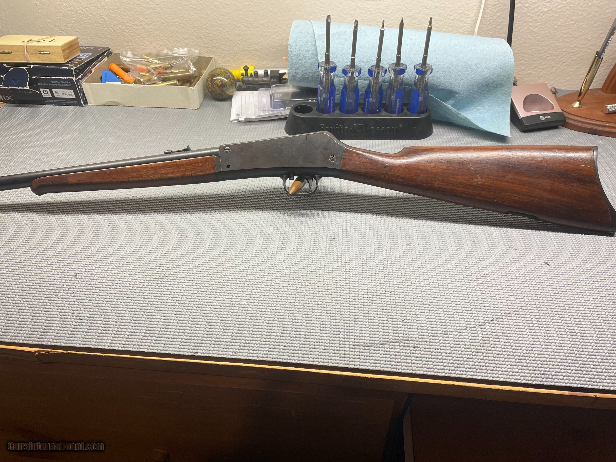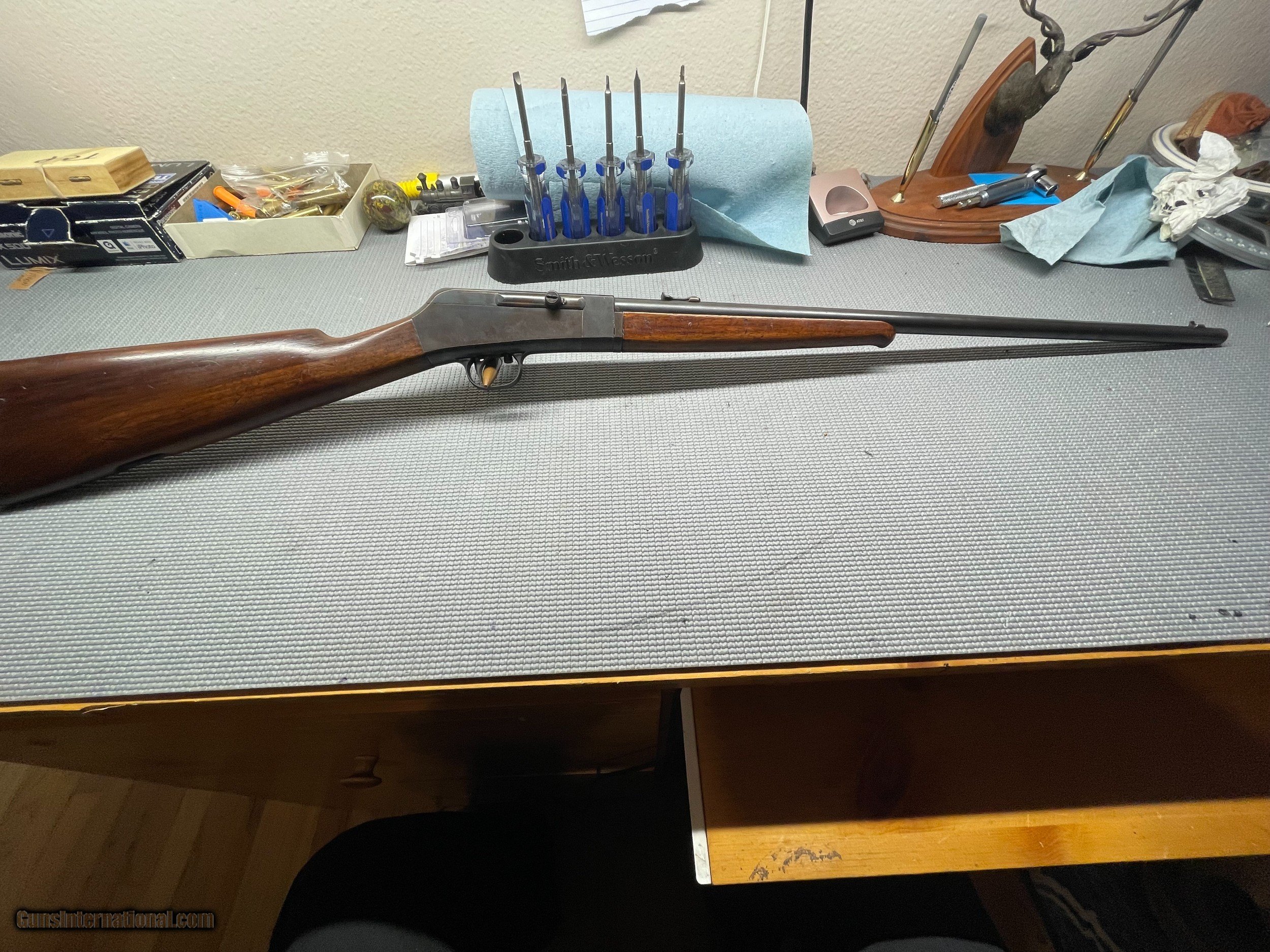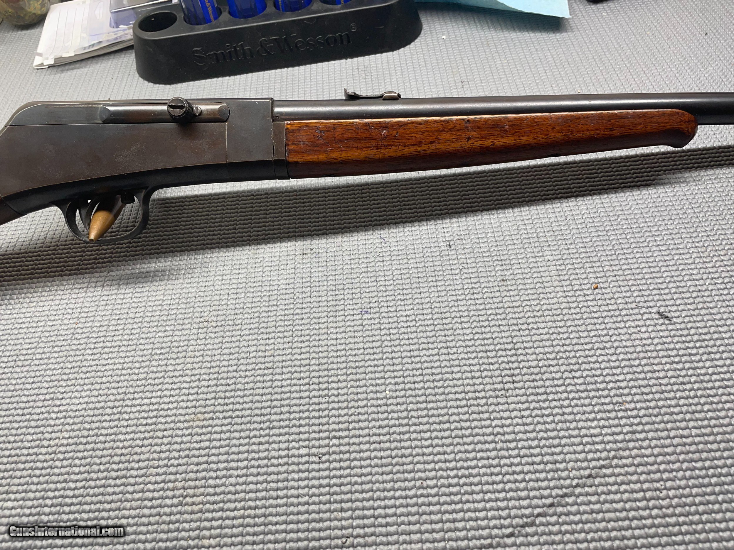 Description: Manufactered between 1915 and 1928, this rifle uses a propietary round to avoid the black powder .22 rounds that were common at the time. This rifle is not compatible with any modern ammunition and MUST use .22 remington auto to be considered operational. However, this firearm is in good condition in regards to the mechanical operations as well as finish. Takedown-style, fed from the stock. Never fired by owner. Call Bob (805)620-0479 No Text or Email contact. SOLD |