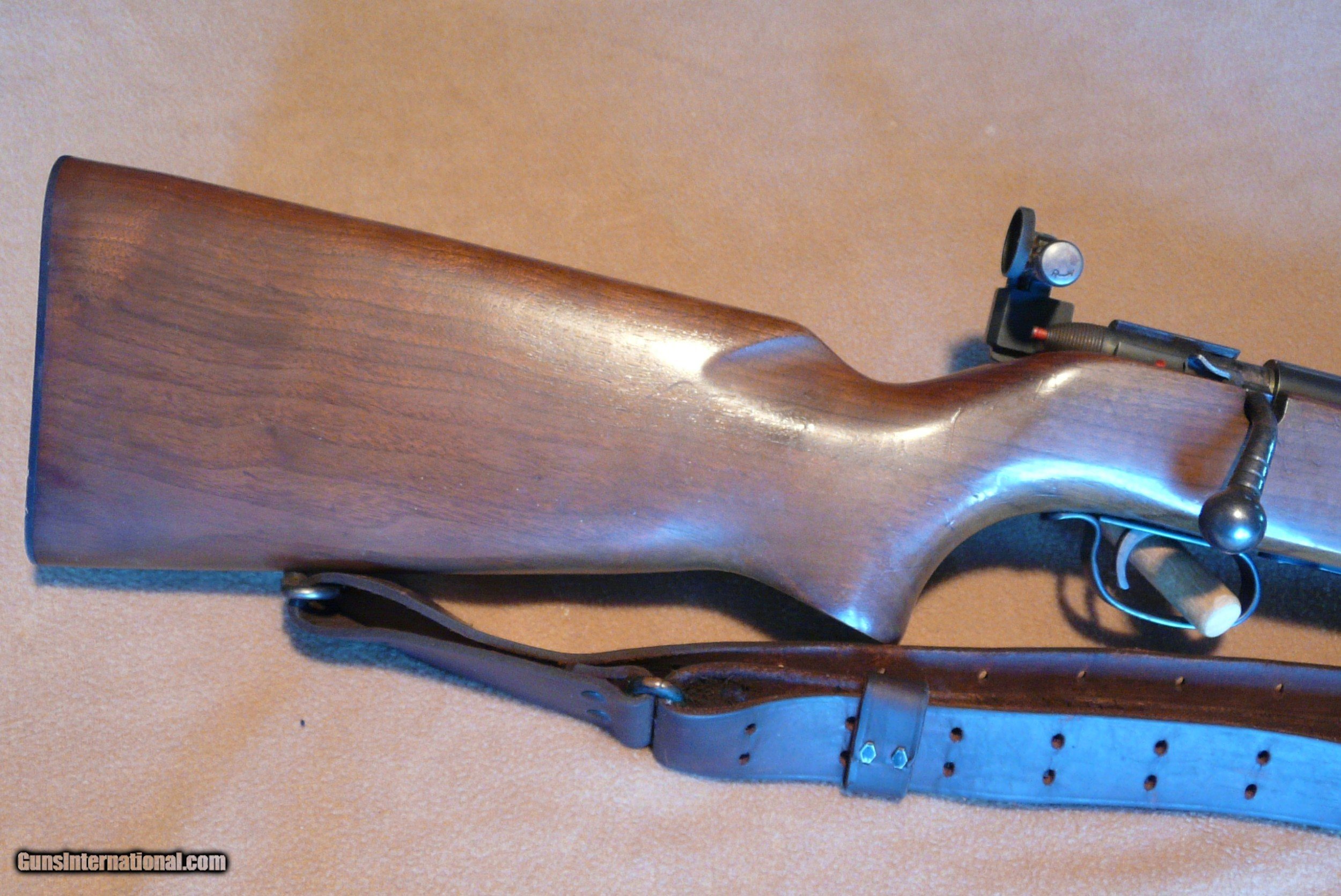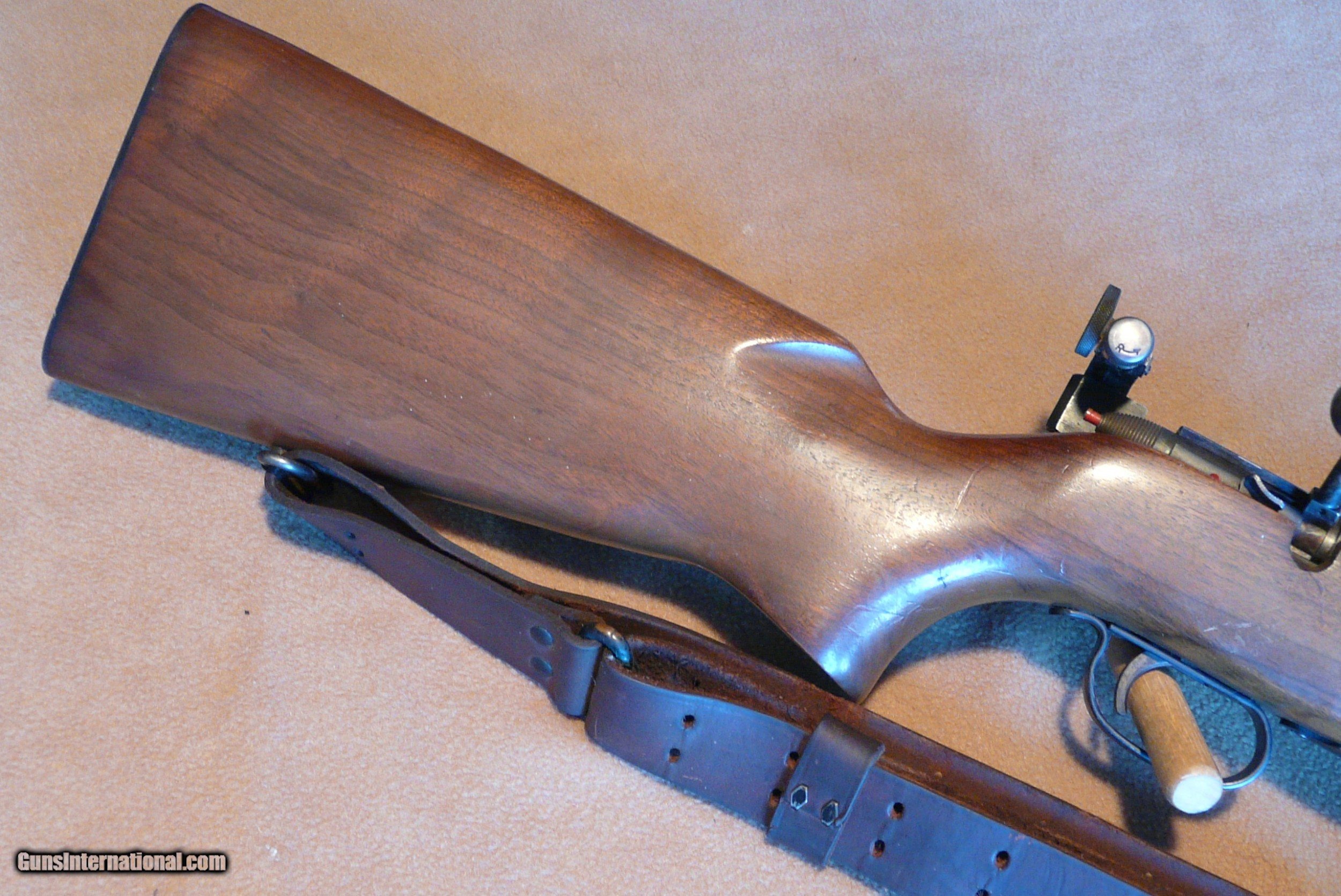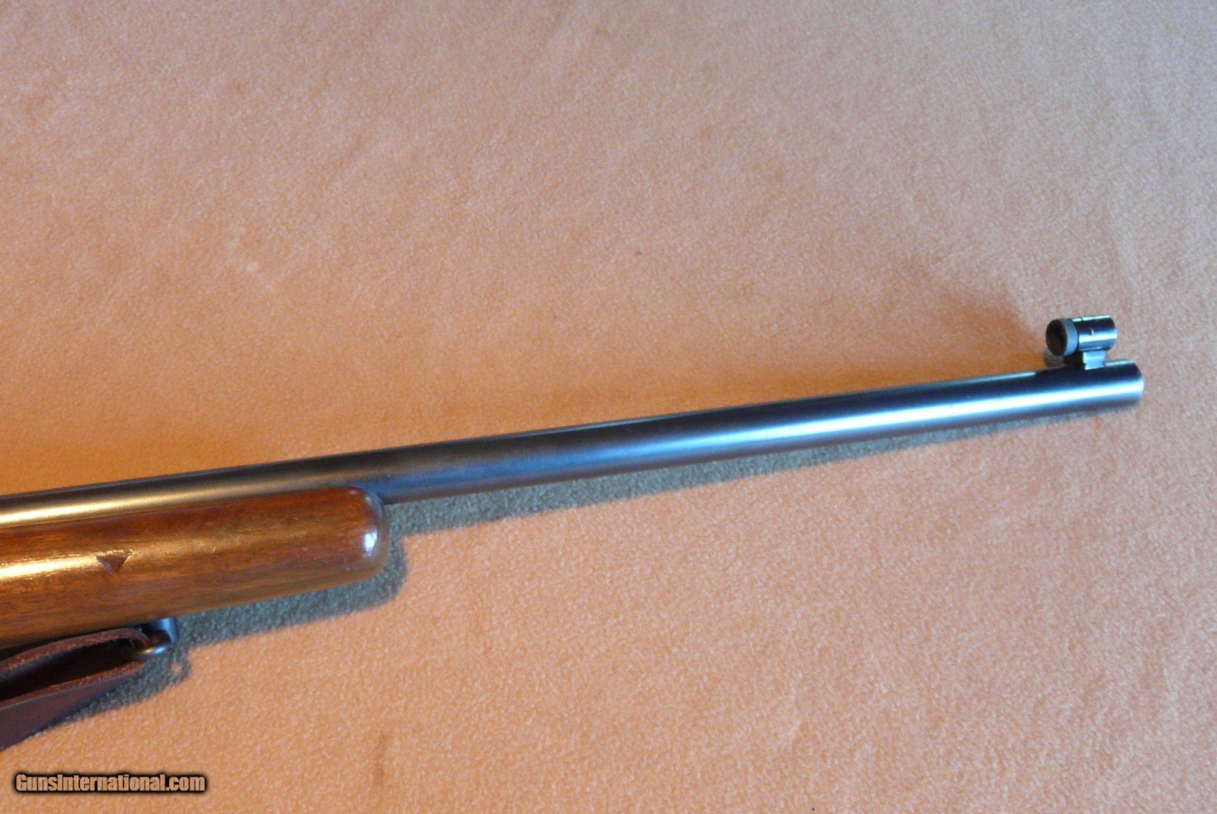 Description: Rem 513 T 22 LR Med Hvy Bbl 27" long, with perfect Bore, has been shot very little ! These were made 40 to 68, a lot for military, this one civilian model. This has Redfield rear aperture sight and front target front sight, rifle is clean as new, and really looks like hardly used, with nice leather sling, one 6 shot orig magazine, Wood is 99%, and metal is the same, one tiny dent in forend (in pic) is only mark on gun! Orig checkered BP, this rifle has had very little use, lots of years left to shoot! SOLD |
