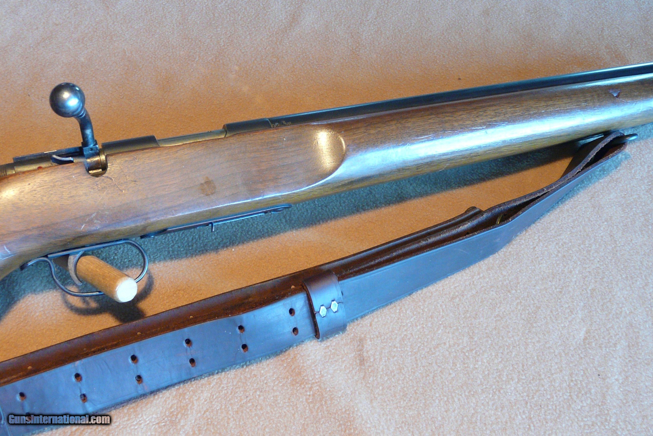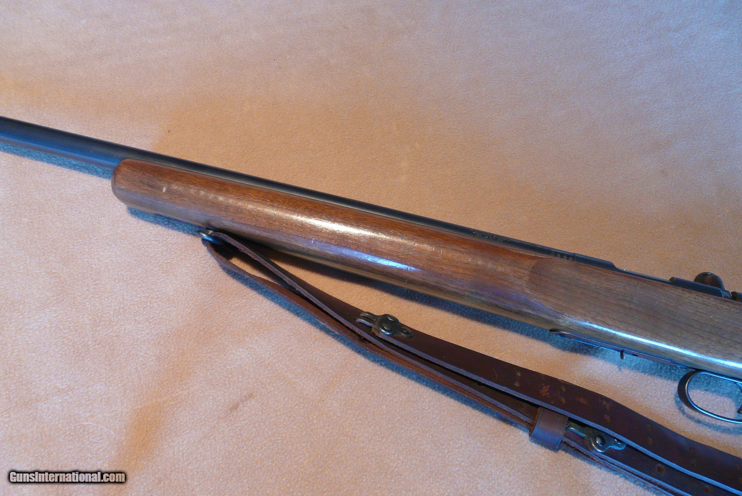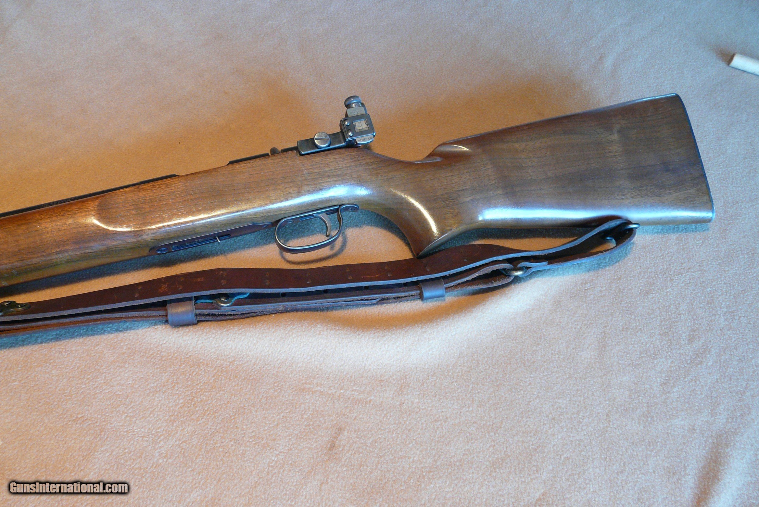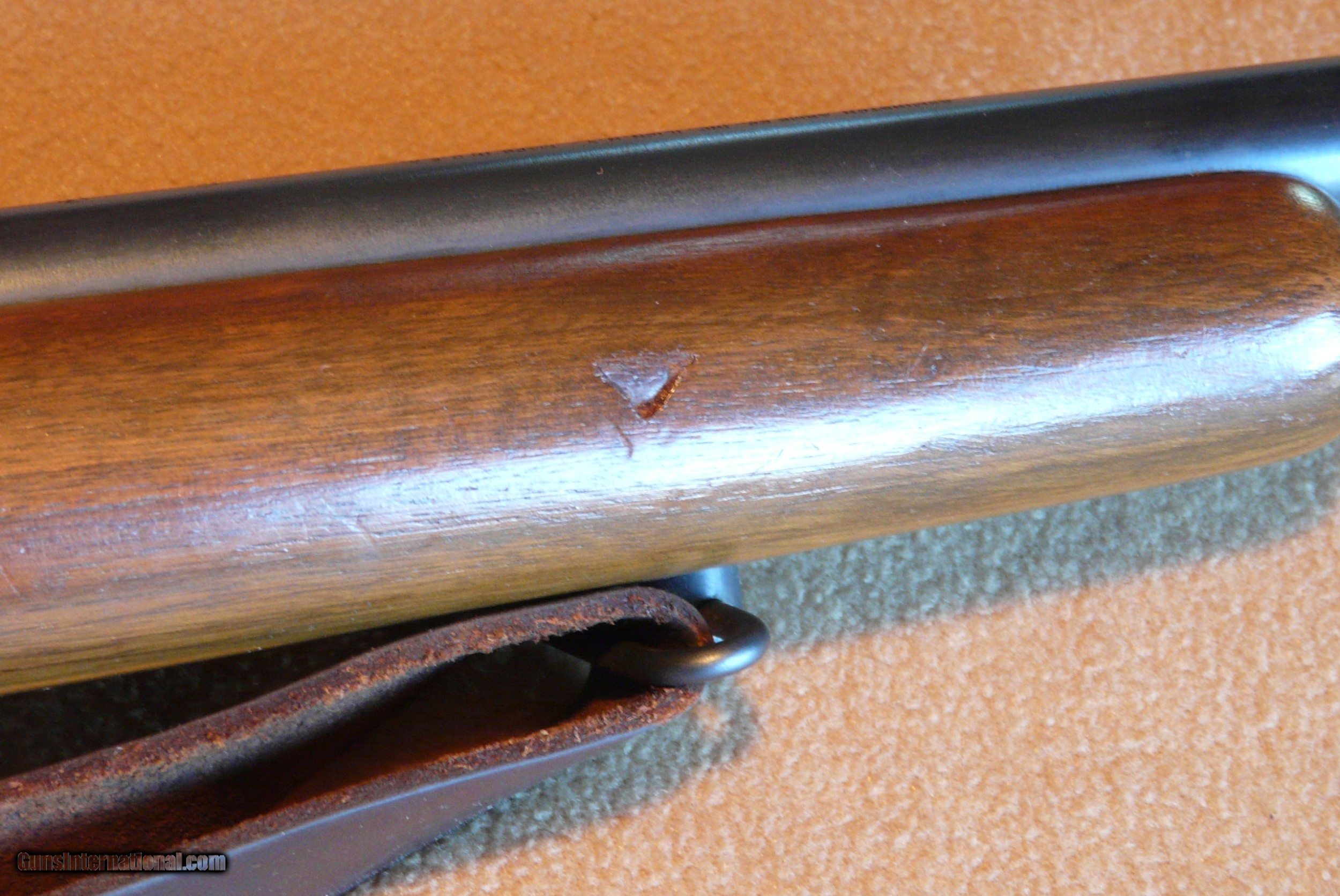 Description: Rem 513 T 22 LR Med Hvy Bbl 27" long, with perfect Bore, has been shot very little ! These were made 40 to 68, a lot for military, this one civilian model. This has Redfield rear aperture sight and front target front sight, rifle is clean as new, and really looks like hardly used, with nice leather sling, one 6 shot orig magazine, Wood is 99%, and metal is the same, one tiny dent in forend (in pic) is only mark on gun! Orig checkered BP, this rifle has had very little use, lots of years left to shoot! SOLD |