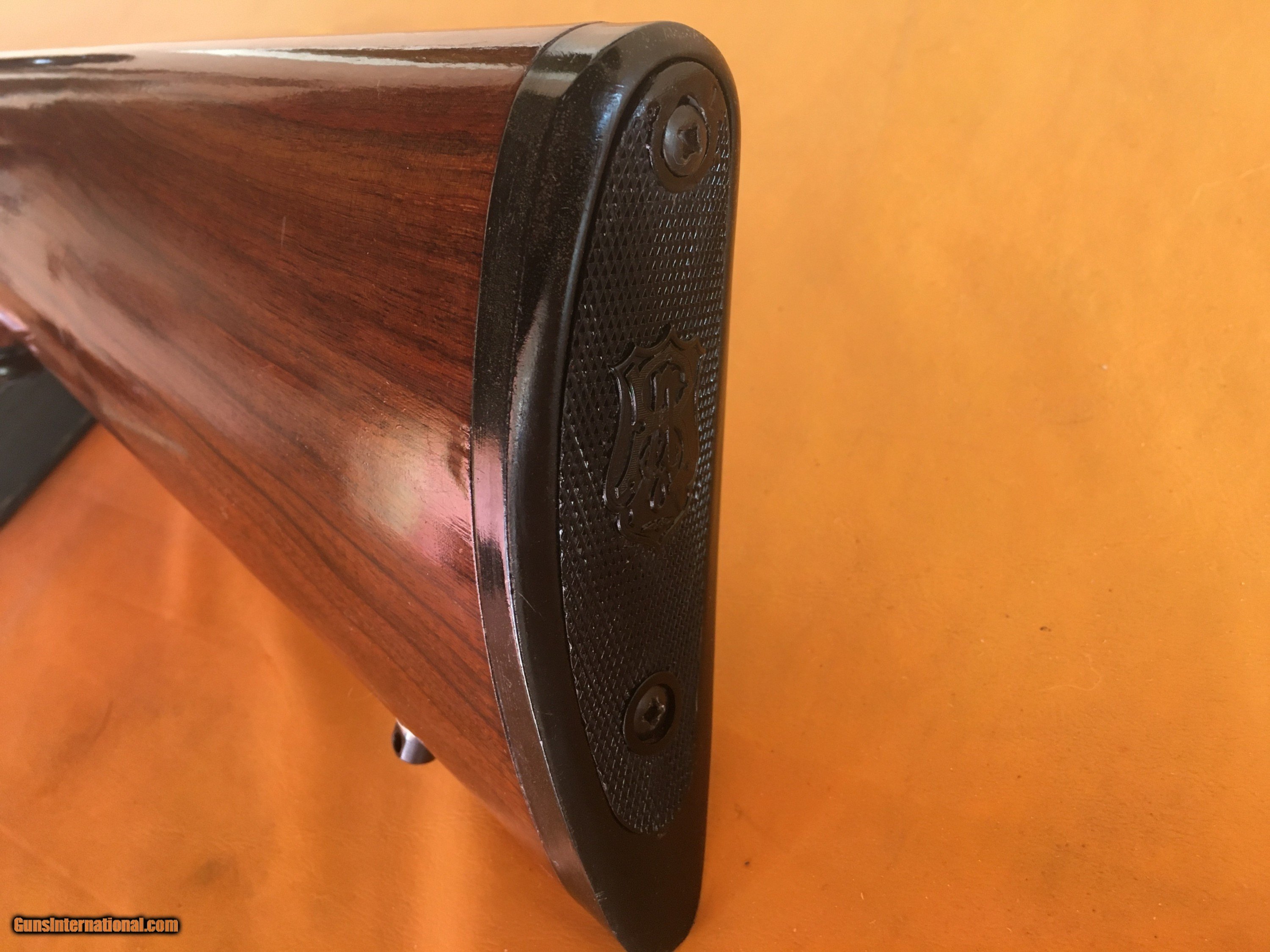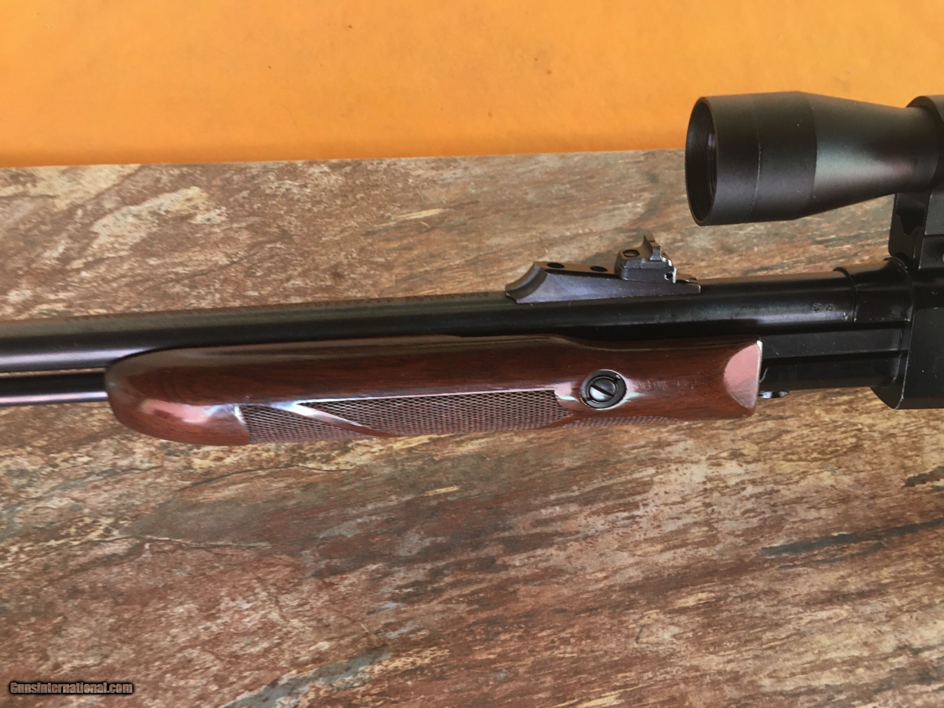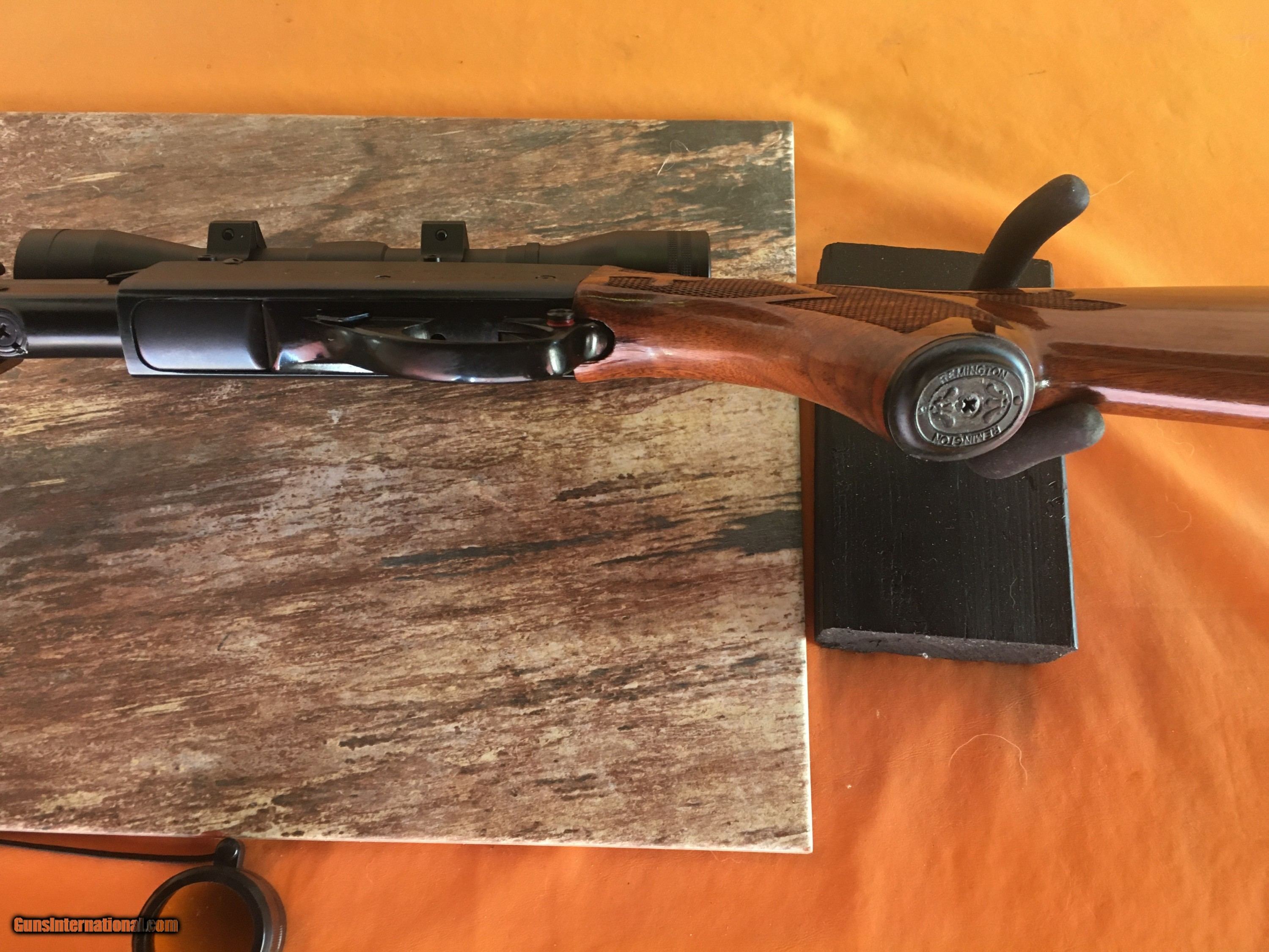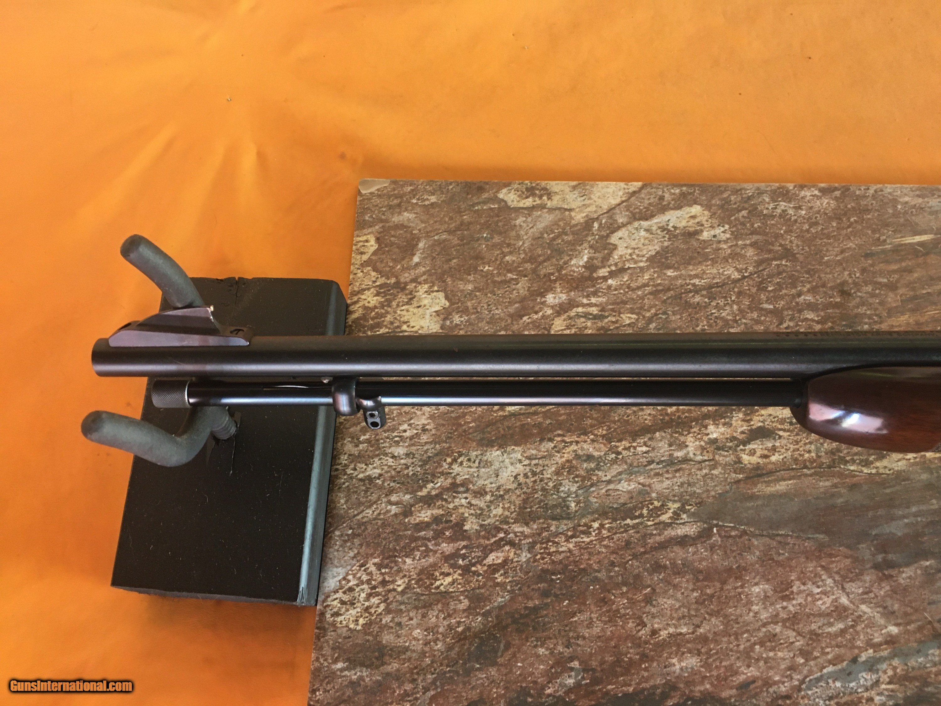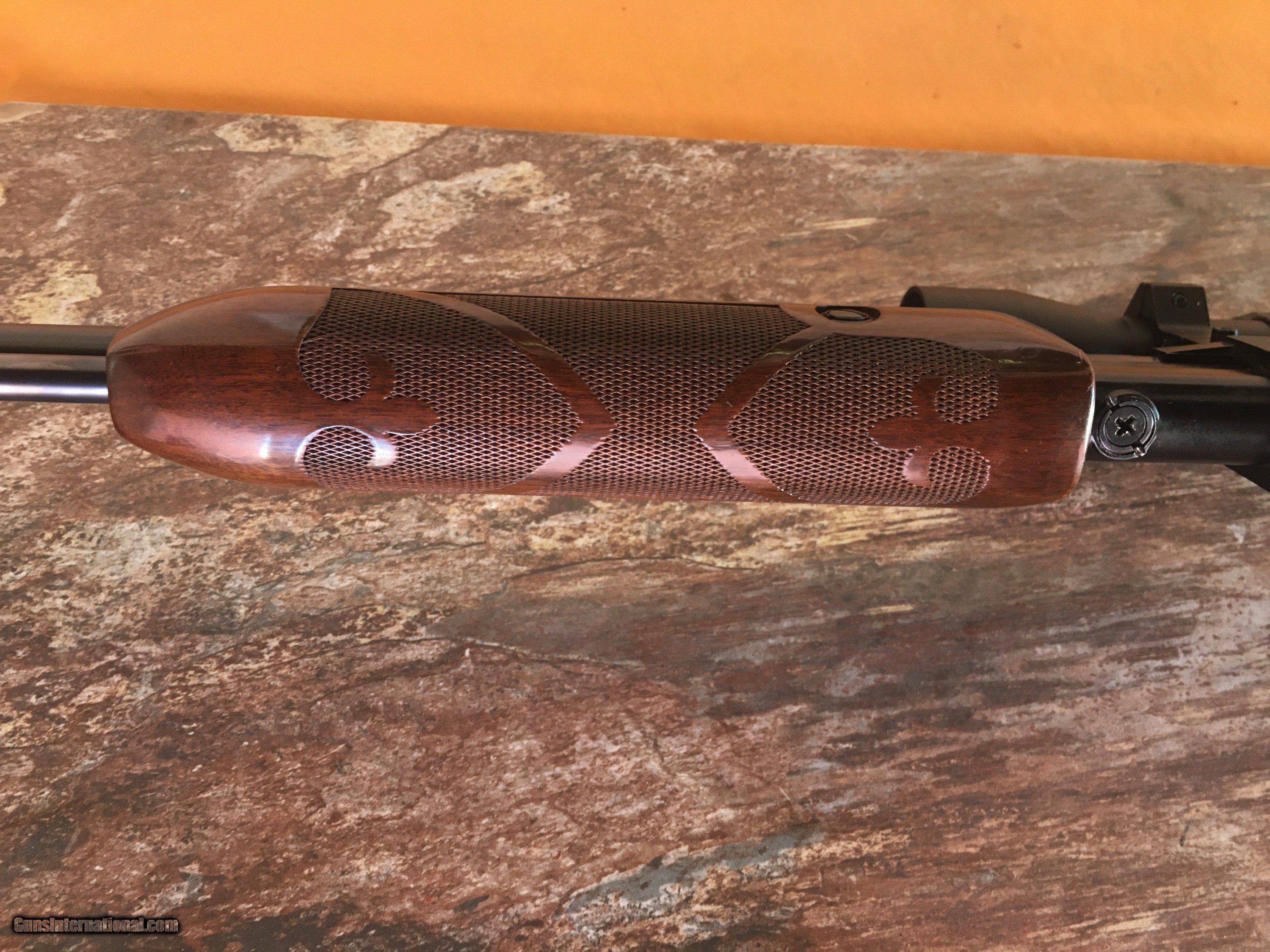 Description: Remington Model 572 BDL- Deluxe - Fieldmaster - Slide Action .22 Rifle - This is the original 572 BDL- Deluxe . Pistol grip style stock and forend with Fluer - di- lis checkering on both the stock and forend complete with butt plate. 23 In. long barrel with adj. rear game style sight and a ramped front blade sight. Tubular magazine can hold 20 Short , 17 Long and 15 LR ammo. Cross bolt safety. Receiver grooved for scope. Includes a New Bellishi 4x20 Scope with see thru rings and lens protectors. Bore is clean and bright. Barrel and receiver are retaining approx. 95% bluing. Stock and forend are in excellent condition with minimal handling marks . Receiver has some light handling marks. Includes a new soft sleeve. Overall condition is excellent . Rifle does not appear to have had much use. The 572 BDL - Deluxe models in this condition are getting very difficult to find. This one was manufactured in May of 1976. Very nice addition to any collection. We can ship to your FFL dealer at a flat rate of $50.00 S&I to lower 48 states. All of our rifles have been clened and lubricated. SOLD Rifle Caliber: .22 Long Rifle Manufacturer: Remington Model: 572 BDL - Deluxe Serial Number: A1966448 Barrel Length: 23 In. Long Condition: Excellent Metal Condition: Very Good Wood Condition: Excellent Bore Condition: Clen / Bright Action: Pump Butt Pad: Very Good Weight: 6Lbs. Case: New Soft Sleeve |