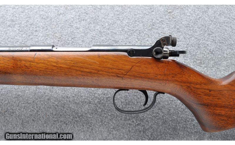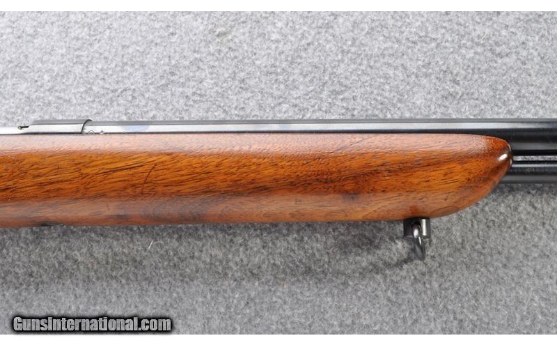Description: Date code puts this rifle at March 1936 manufacture. A unique feeding lifter allows the bullet to enter the chamber without touching the breech face for better accuracy. .22 Short/Long/Long Rifle SOLD Chambers: .22 Rimfire in a tubular magazine Metal Condition: Very good with high luster blue showing little edge wear. Possible reblue Wood Condition: "Good, with various handling marks. Possible refinish Bore Condition: Bright with sharp rifling Barrels: 24 Stock Dimensions: 13 1/2" LOP Fore End: Plain walnut with sling swivel Butt Pad: Remington's composition butt plate with logo Weight: 6 Lbs. 4 Oz. Sights: "Globe front with insert, adjustable aperture rear Item Location: Grand Junction, CO |
