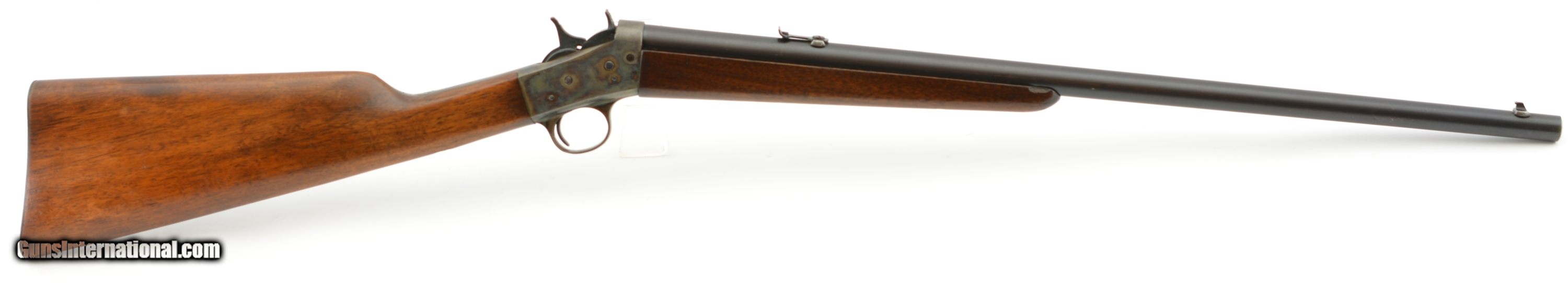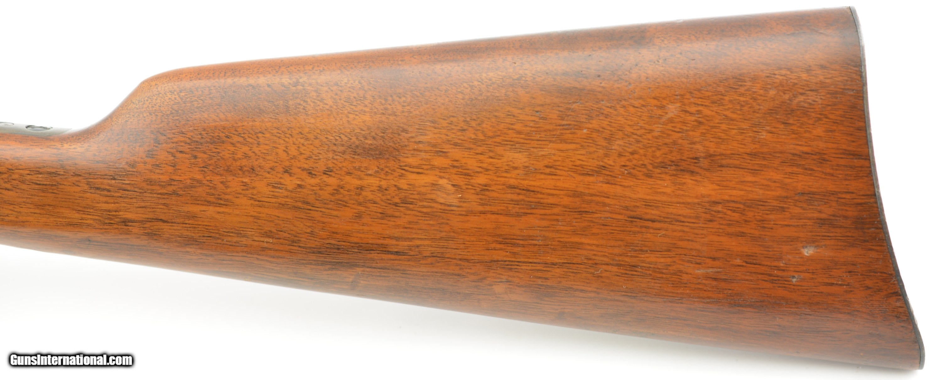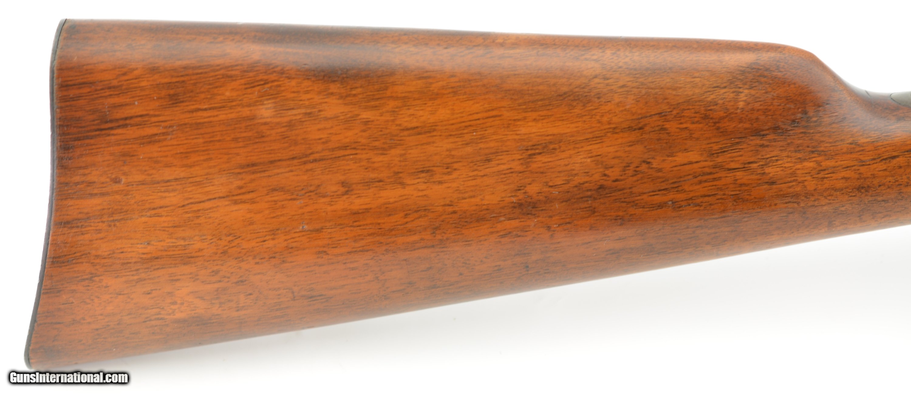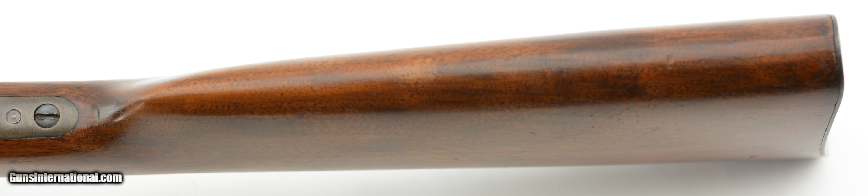 Description: Serial #355023, .25-10 RF, 22 1/2" round barrel with an excellent, bright bore. The barrel of this February, 1933 date-coded rifle retains about 92-95% of the original blue, with the balance turned to a mellow plum-brown patina. The frame retains a commensurate amount of original color case-hardening, with some fading to speckled gray along the wrist tang, and on the trigger guard bow. The small parts retain about 97-98% original blue, and all markings are crisp and clear. The smooth walnut buttstock and forend are in fine condition with some light handling marks present in the original finish, as well as a single small chip at the right front of the forend nose, and some minor marks in the wood near the frame screw on the left side. The original sporting sights are still present, and the action is fully functional. This is a splendid example of a small frame Rolling Block, and rates excellent overall. FFL or C&R SOLD Curio/Relic: Yes |