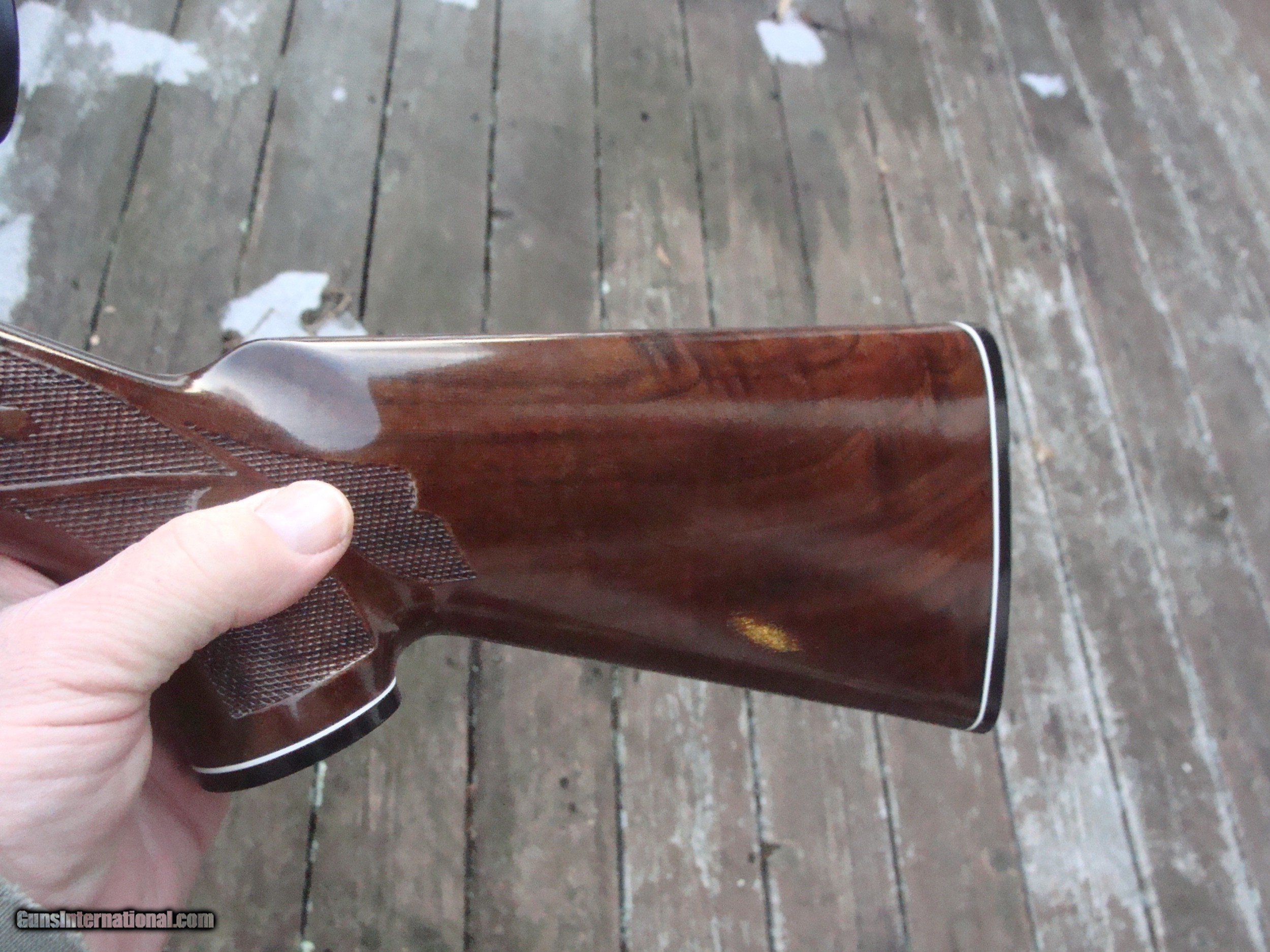Description: With Sightiron Mill Dot type 3x9 (40 mm) scope. Beautiful deep dark Walnut stock set with vintage syle Fleur De Lis checkering. There are light handling marks on rifle. Stock is almost completely free of handling evidence with no meaningful marks or flaw. Most 742/7400's were produced in 30 06. This one is only the 2d one we have seen in a year or two chambered in sought after 308. A great hunting rifle with the ability to have fast follow up shot(s) to insure against loosing a wounded animal. Still in time for a wonderful Christmas gift for the Hunter in the family if someone acts quickly we could probably arrange overnight shipping with additional shipping fees. WE ARE AN FFL 01 IN THE NORTHEAST WHERE MANY FINE US MADE GUNS WERE PRODUCED AND WE OFTEN GET SOME FAIRLY HARD TO FIND AND HARDLY USED GUNS. WE HAVE OVER 1500 SALES ON ALL SITES WITH AN A+ RATING ON ALL (WE ALSO KEEP AN INVENTORY OF OLDER PERIOD CORRECT SCOPES; CALL WITH NEEDS) WE MOSTLY PICK VERY CLEAN GUNS, PRICE THEM FAIRLY AND WORK WITH MODEST MARGINS WE ARE HAPPY TO TAKE CONSIGNMENT GUNS AND COLLECTIONS OR WILL BUY YOURS OUTRIGHT. WE SOMETIMES ARE EMPLOYED FOR ESTATE PURPOSES AND VALUATIONS. CT RESIDENTS MUST CONTACT US TO UNDERSTAND OUR IN STATE TRANSFER POLICIES. WE CAN TAKE A CREDIT CARD HOWEVER THERE IS A 3% ADD ON BASED ON THE TOTAL FOR USE OF A CARD. IT IS ALWAYS THE BUYERS RESPONSIBILITY TO GET US A COPY OF YOUR RECEIVING FFL'S LIC AND WE REQUIRE A COPY OF YOUR PHOTO ID BEFORE THE GUN SHIPS YOU MUST CALL YOUR FFL.WE DO NOT CALL FOR YOU. LAYAWAY PURCHASES NOT COMPLETED OR ANY RETURNED ITEM UNLESS NOT AS DESCRIBED ARE SUBJECT TO A 10% RELISTING/RESTOCKING FEE AND MUST BE RETURNED WITH NO MARKS OR SCRATCHES, SENT BACK INSURED, PRIORITY SIGNATURE REQUIRED WE DO NOT OFFER AN INSPECTION PERIOD PER SE HOWEVER GUNS MAY BE RETURNED IF NOT EXACTLY AS DESCRIBED UNDER NO CIRCUMSTANCE MAY ANY GUN TO BE RETURNED HAVE BEEN REMOVED AT ANY TIME FROM RECEIVING FFL DEALERS PREMISIS AND RETURNS MUST 1ST BE APPROVED BY US IN WRITING. Shipping USPS Priority Mail to any location in the lower 48 states $ 45.00 SOLD |
