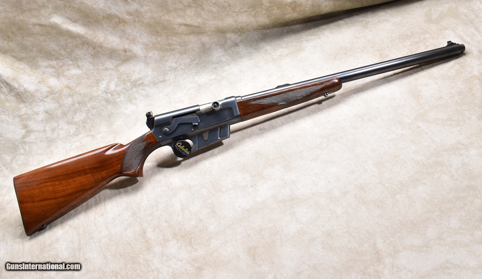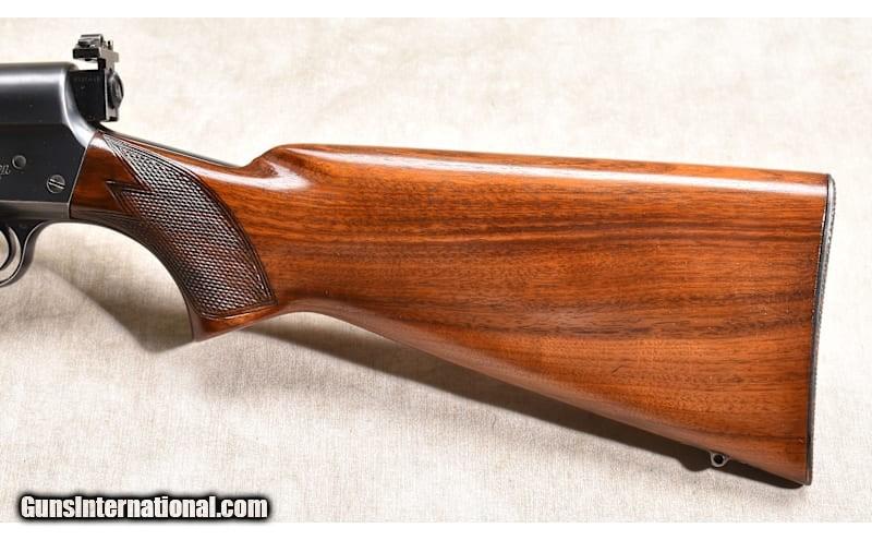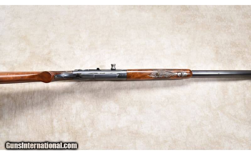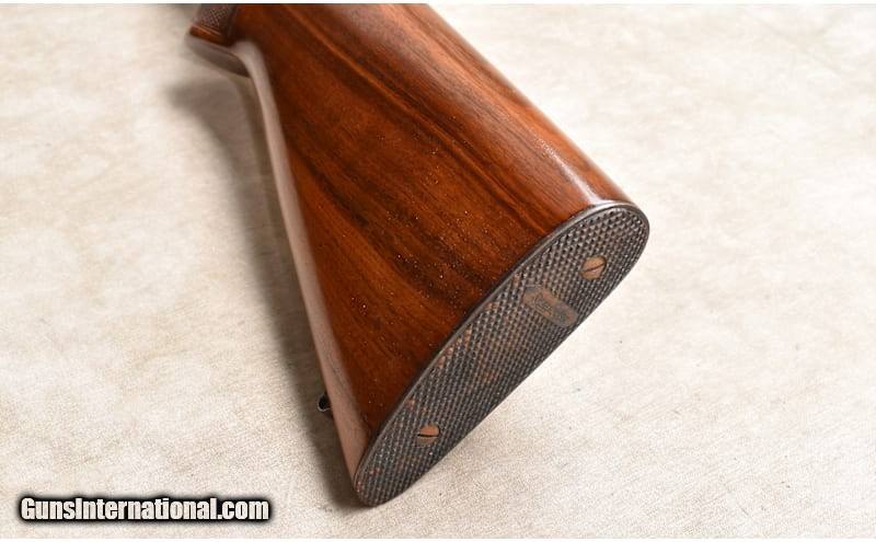Description: This rifle is in excellent condition with no defects except some roughening of the screw slots. This one features intact blue, and fancy walnut stock and forearm with checkering. This is not stamped with grade but is upgraded with better wood, checkering, and sling mounts. The barrel code "CJ" places the YOM at ca. 1940. .35 Remington SOLD Chambers: 5 rounds Metal Condition: Excellent. Wood Condition: Excellent. Bore Condition: Shiny and bright with good rifling. Barrels: 22 inches Triggers: Factory trigger. Stock Dimensions: LOP: 13-3/4 inches Fore End: High grade checkered walnut. Butt Pad: Steel plate. Weight: 8 lb - 11 oz Sights: "Bead front sight, Redfield peep rear sight, Marble plugs on factory drilled rear sight holes. Item Location: Rogers |