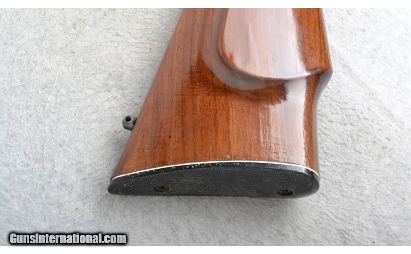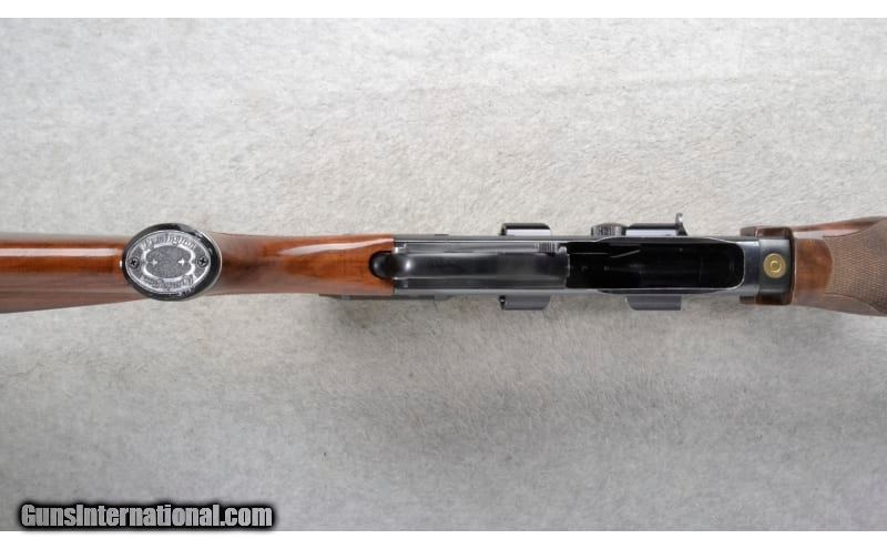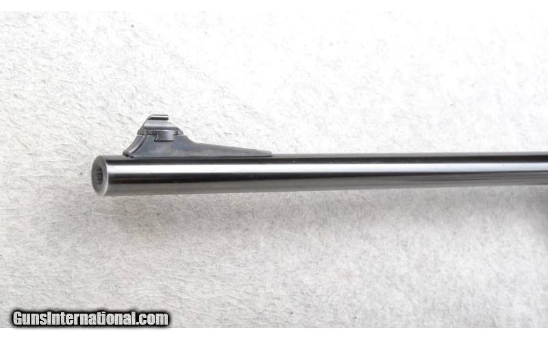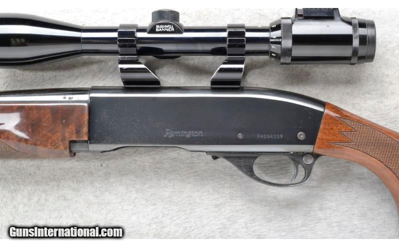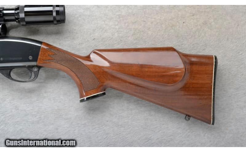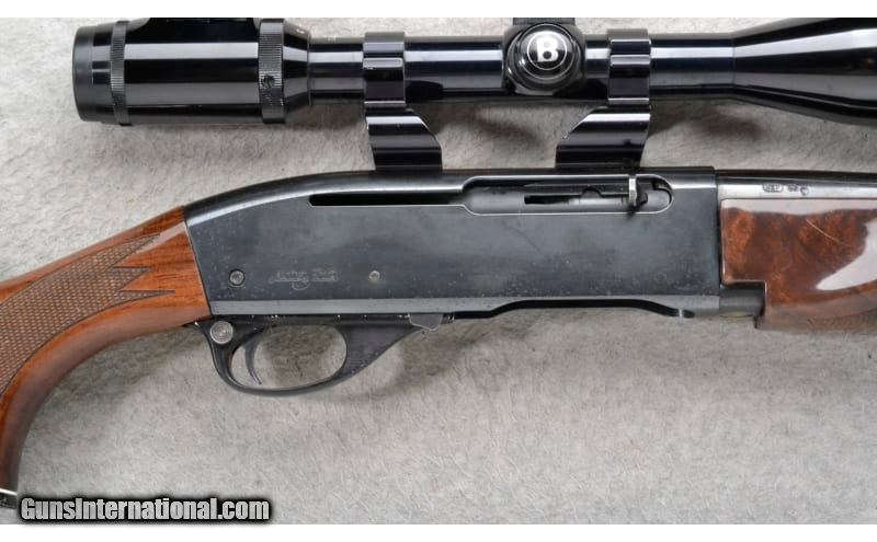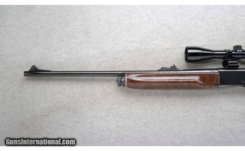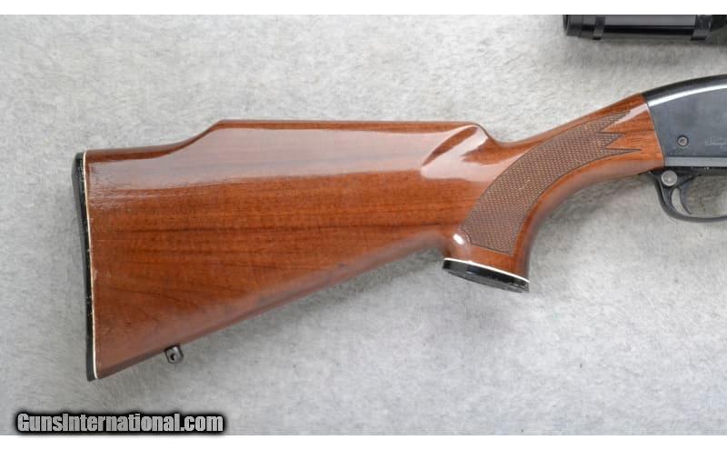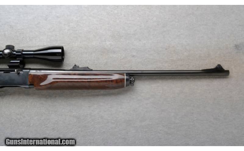 Description: This Remington Model Four is a right hand semi-auto rifle in .30-06 Sprg. Cal. It has a 22 inch barrel. A blade front sight and an adjustable notch middle sight. It is outfitted with a Bushnell Banner Scope on a see through base. The butt stock is a checkered grip walnut pistol grip with a raised cheekpiece and black cap. The forearm is a checkered grip walnut with finger grooves. .30-06 Springfield SOLD Chambers: Detachable Magazine. Metal Condition: Fair. Has light freckling and minor handling marks. Wood Condition: Good. Some light handling marks. Bore Condition: Excellent. Barrels: 22 inch. Stock Dimensions: LOP 13 1/4 inches. Fore End: Checkered grip walnut with finger grooves. Butt Pad: Checkered black plate. Weight: 8 lb. 10 oz. Sights: Raised blade front. Adjustable notch middle. Bushnell Banner 3x9 Scope. Item Location: Richfield, WI |